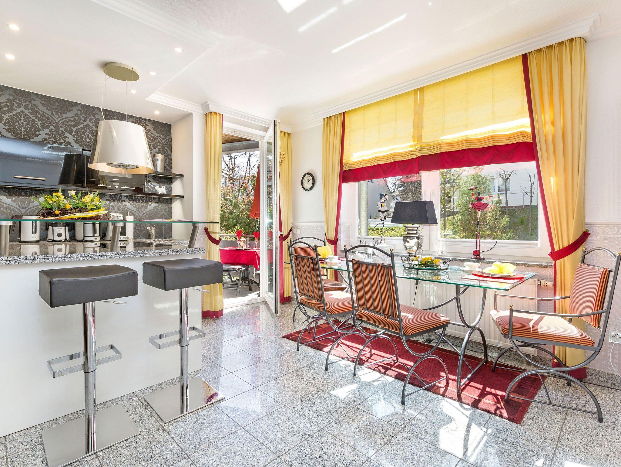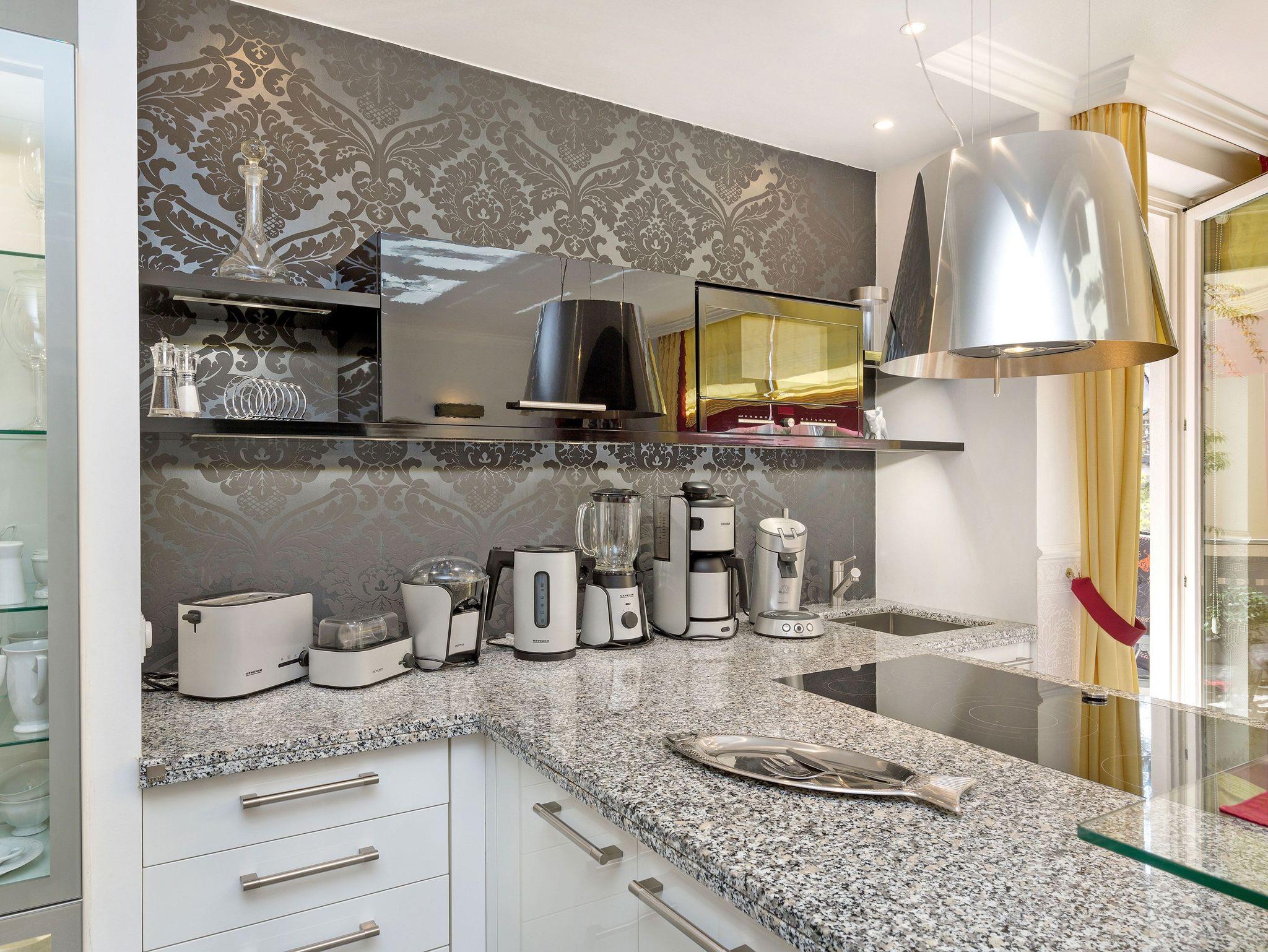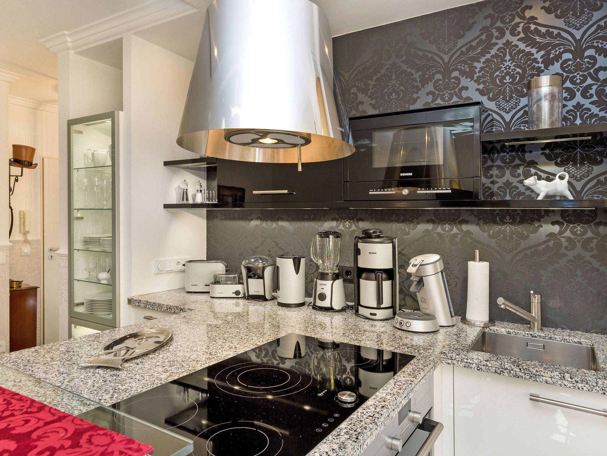 Die hochwertige LEICHT-Einbauküche ist in elegantem Weiß und Schwarz gehalten und mit einer Granit-Arbeitsplatte passend zu den hochglänzenden Granit-Böden in der ganzen Wohnung ausgestattet. Sie verfügt über eine Küchenbar/Glastheke, einen kleinen Weinkühlschrank, einen Kühlschrank mit Gefrierfach, einen Backofen, ein 5-Zonen-Cerankochfeld mit Wipper und Sensortasten, eine hochwertige Dunstabzugshaube von ELICA Platinum in Form einer großen Lampe, eine Spülmaschine, eine Mikrowelle und diverses Kleininventar, das die Küchenausstattung komplettiert. Alle Kochfelder sind auch als Warmhalteplatten nutzbar. Dank Kaffeemaschine, Cafe-Espresso-Pads-Automat, Toaster, Wasserkocher, Eierkocher, Standmixer und elektr. Zitruspresse etc. müssen Sie auf keinen Komfort verzichten.