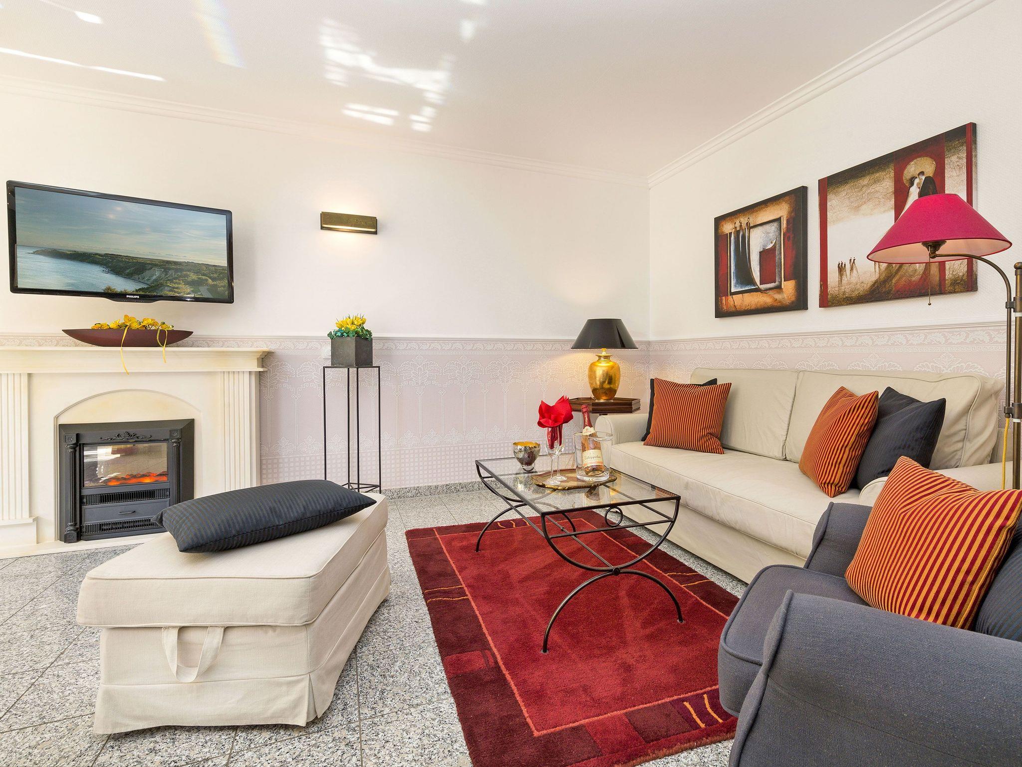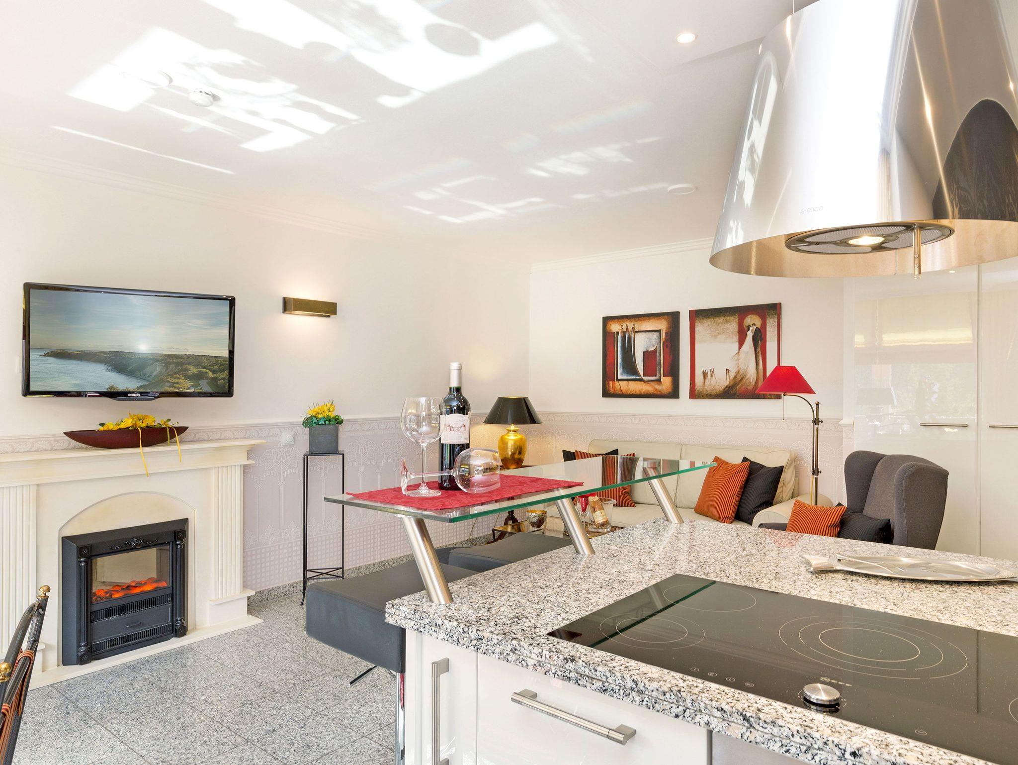 Vom Flur aus gelangen Sie in das großzügig und modern ausgestattete Wohn-/Esszimmer der Wohnung mit einem OptiFlame-Elektrokamin, englischen Stilmöbeln, einer bequemen Couch, einem großformatigem Flachbild-TV sowie der harmonisch in den Raum integrierten Einbauküche nebst Essbereich. Wohin man auch schaut, überall sieht und spürt man, dass die Eigentümer des Appartements in die Einrichtung und Dekoration viel Liebe investiert haben.