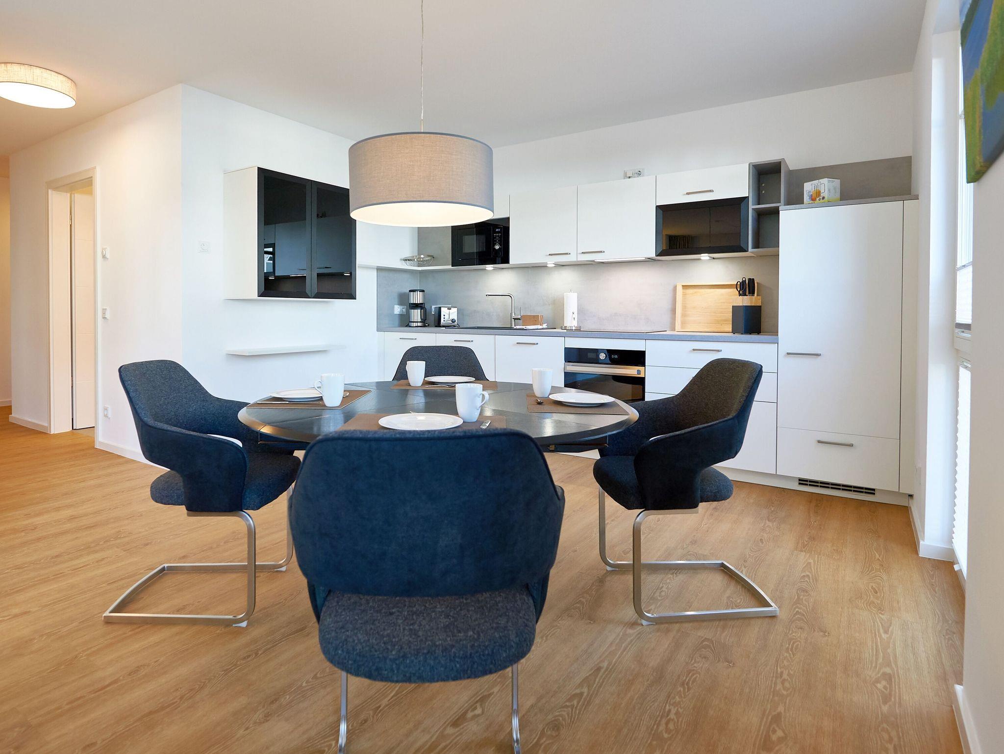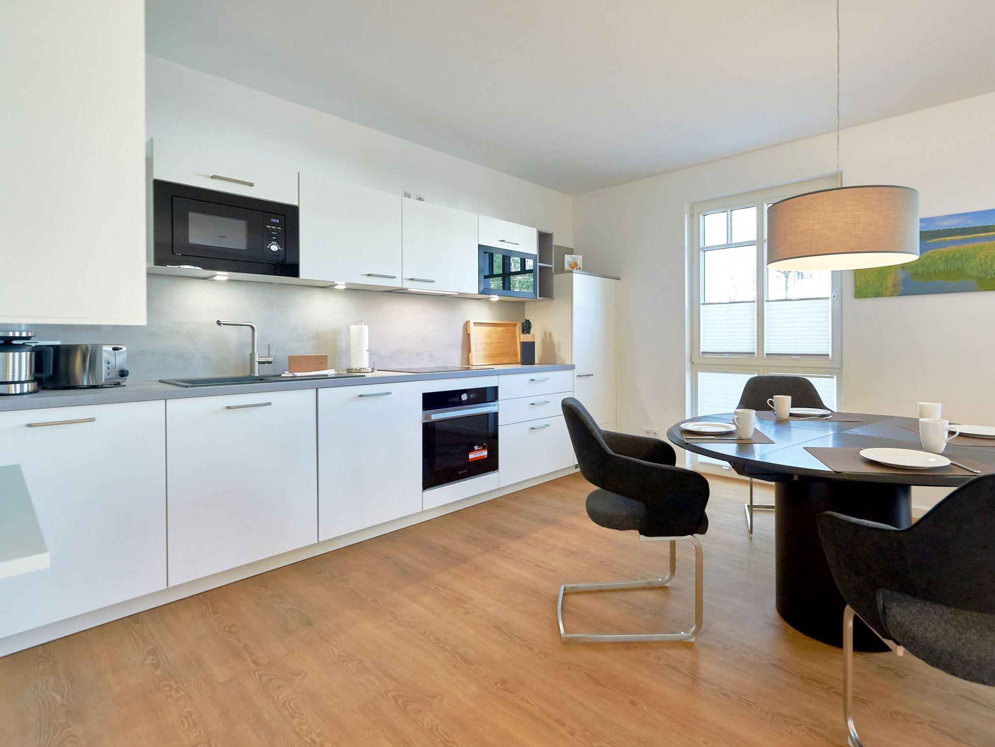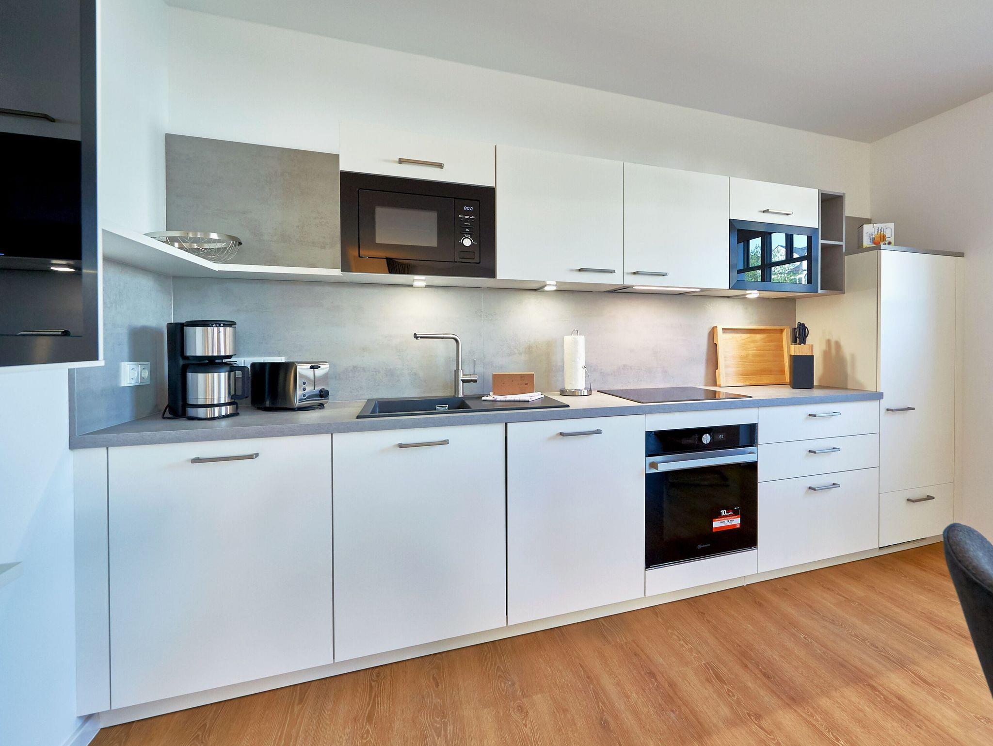 In der eleganten Designerküche ist alles vorhanden, damit Sie Ihren Kochkünsten freien Lauf lassen können: ein großer Herd inklusive Backofen und Abzugshaube, eine Mikrowelle, ein Kühlschrank mit Gefrierfach, eine Spülmaschine, eine Kaffeemaschine, ein Wasserkocher, ein Toaster. Selbstverständlich mangelt es auch nicht am nötigen Koch- und Essgeschirr. Im wenige Gehminuten entfernten Ortszentrum finden Sie Bäcker und einen Edeka-Einkaufsmarkt. Und natürlich freuen sich auch die hiesigen Restaurants, Cafés und Bars immer über einen Besuch.