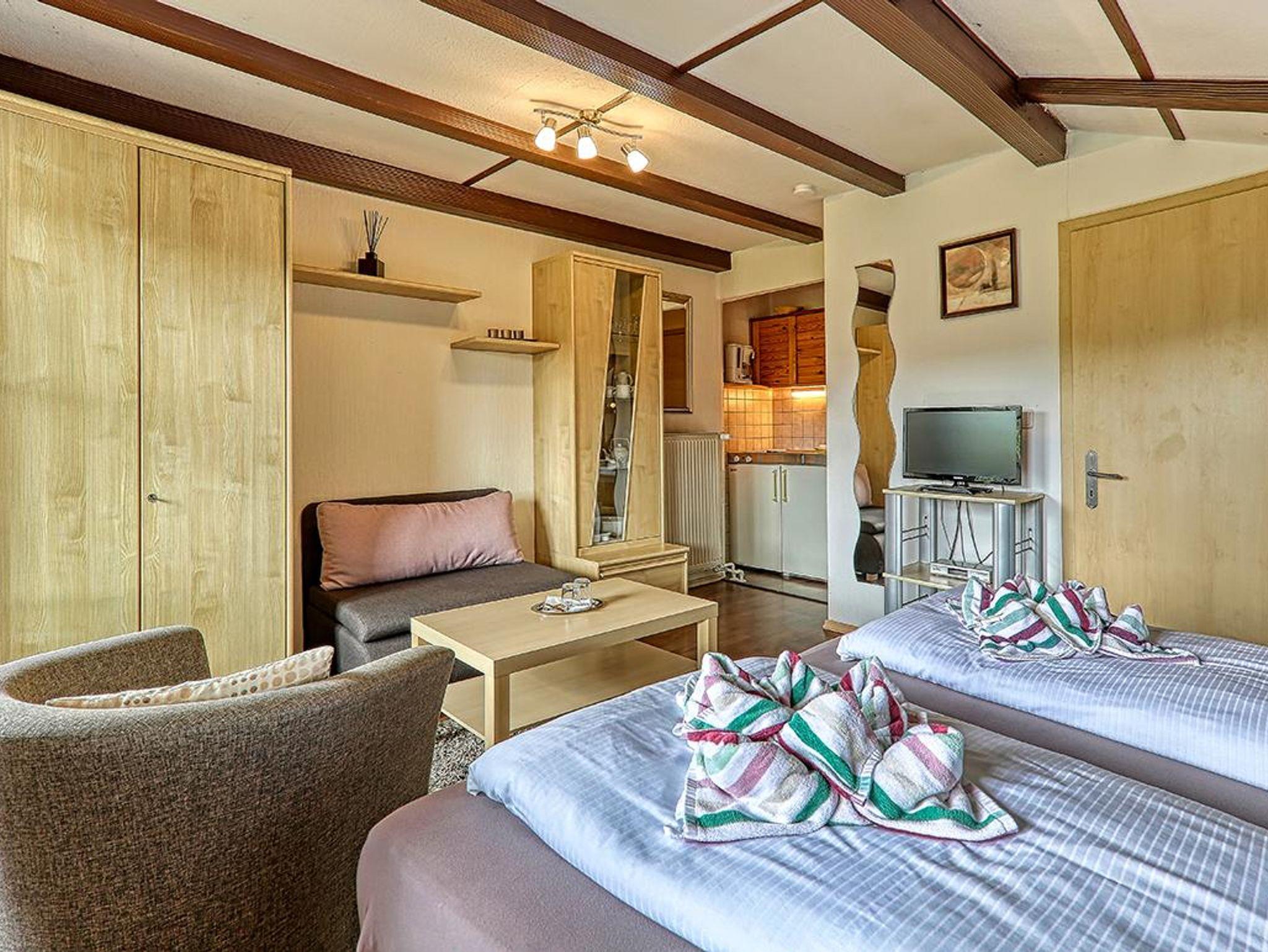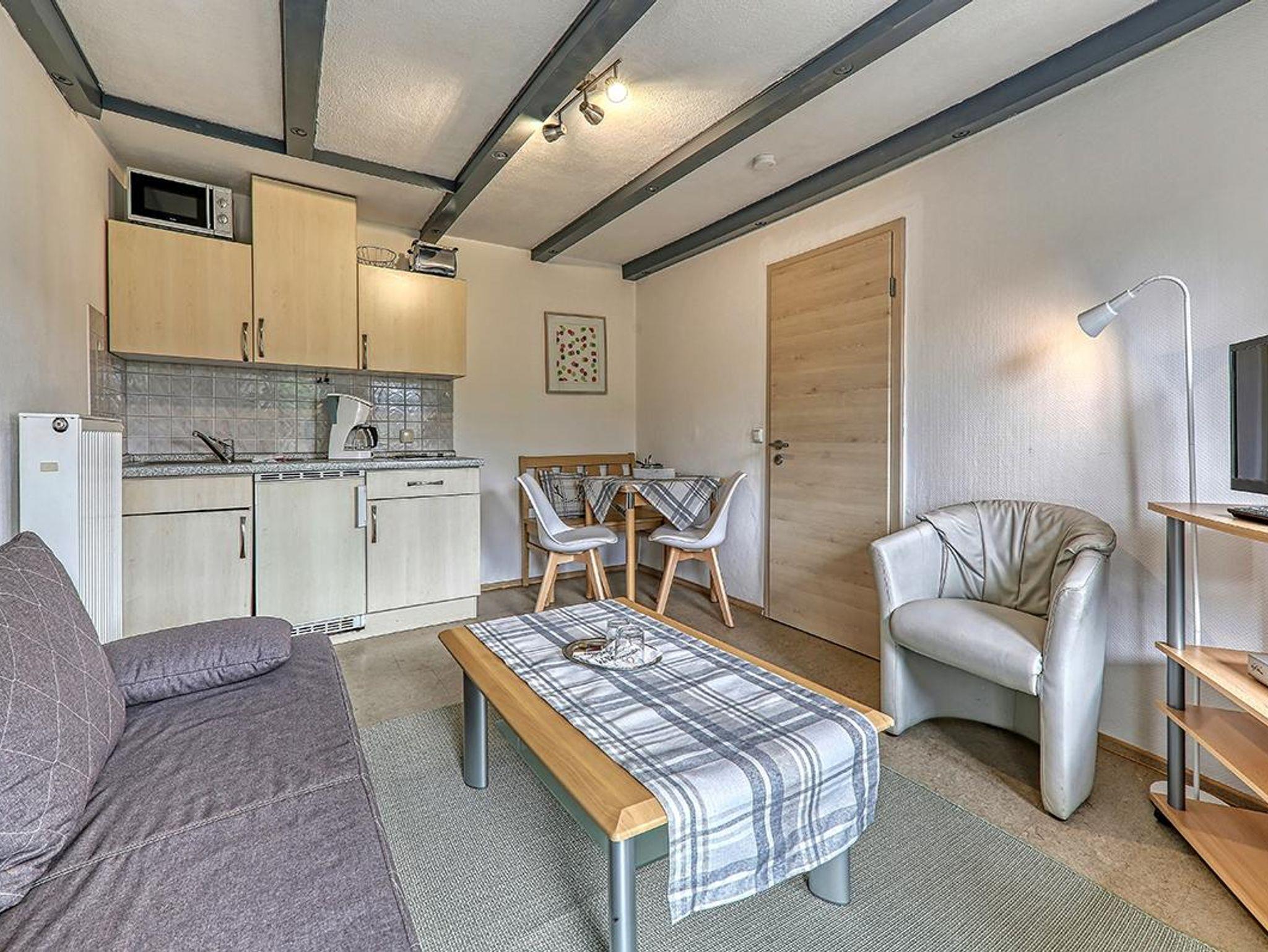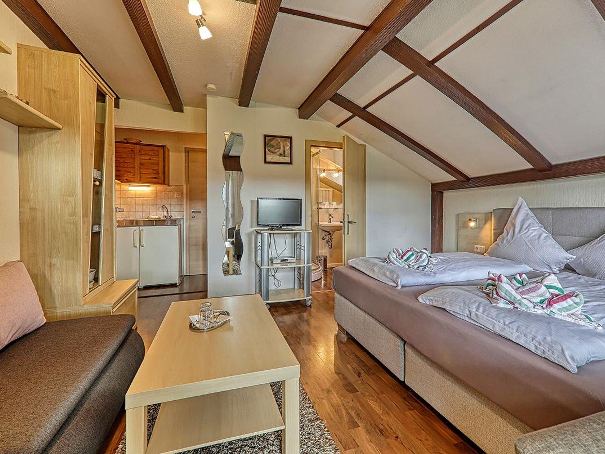 Ferienwohnung für 2 - 3 Personen, Wohn-/Schlafraum, Küchenzeile, Bad mit Dusche, WC, Terrasse. Auf Wunsch Frühstücksbuffet