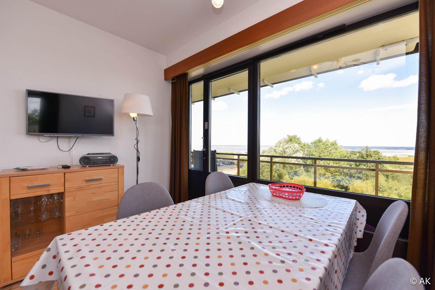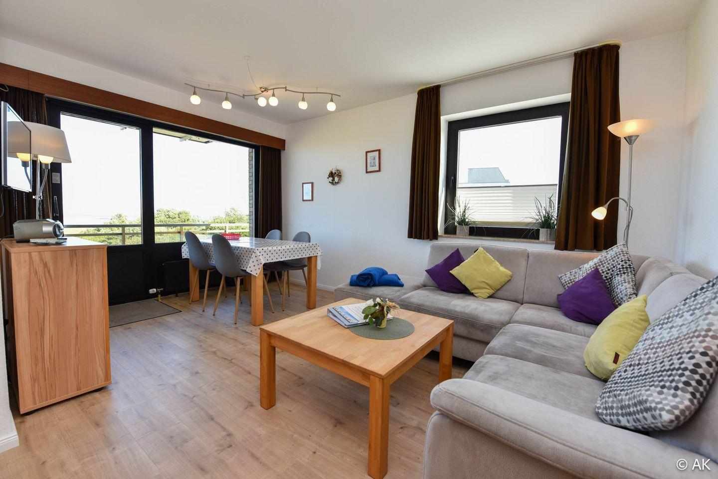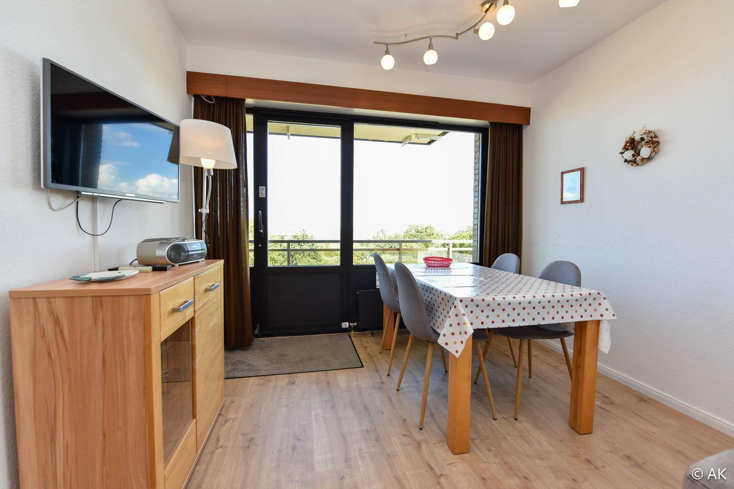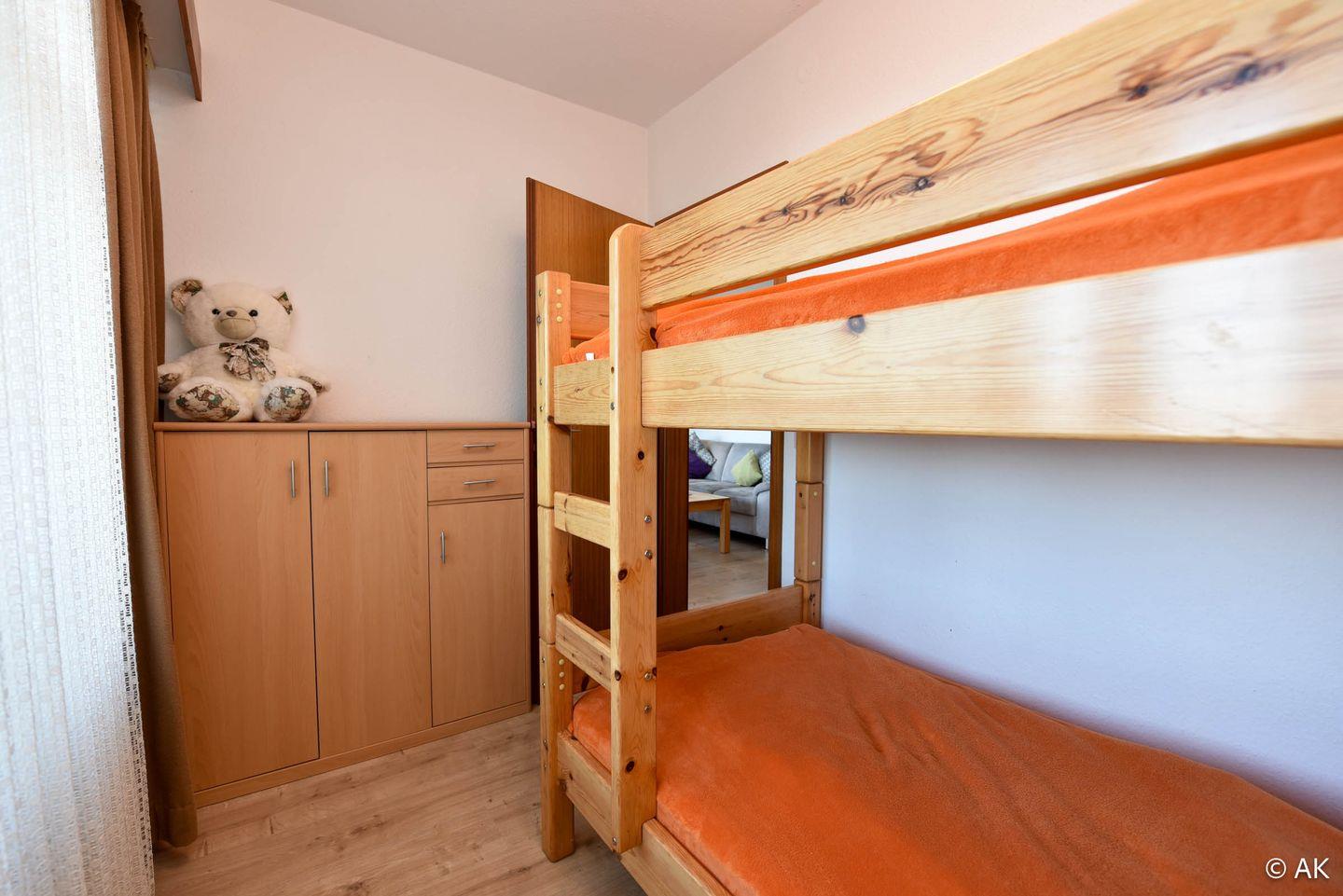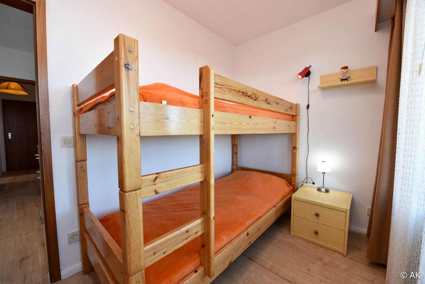 3-Zimmer Appartement für 2-4 Personen im 4. OG mit großem Seesicht-Balkon. Das geräumige Appartement verfügt über eine vom Wohnraum abgetrennte Küche, welche u.a. mit einem Kühlschrank, einem Herd und einer Mikrowelle ausgestattet ist. Im Wohnbereich befindet sich ein gemütliches Ecksofa, sowie ein Esstisch für 4 Personen. Vom Wohnbereich aus geht es zum großen Nord-Ost-Balkon. Schlafraum Nr. 1 ist mit einem Ehebett ausgestattet und Schlafraum Nr. 2 mit einem Etagenbett. Duschbad-WC. Der kostenlose Tiefgaragenstellplatz hat eine Einstellhöhe von 149 cm.