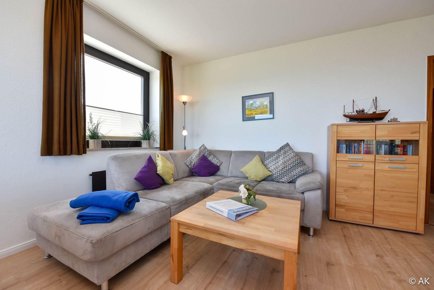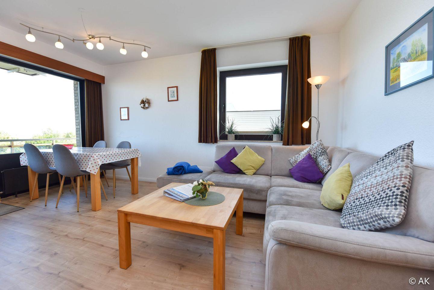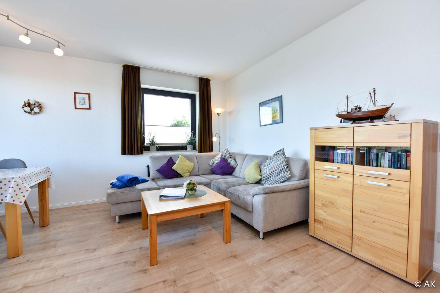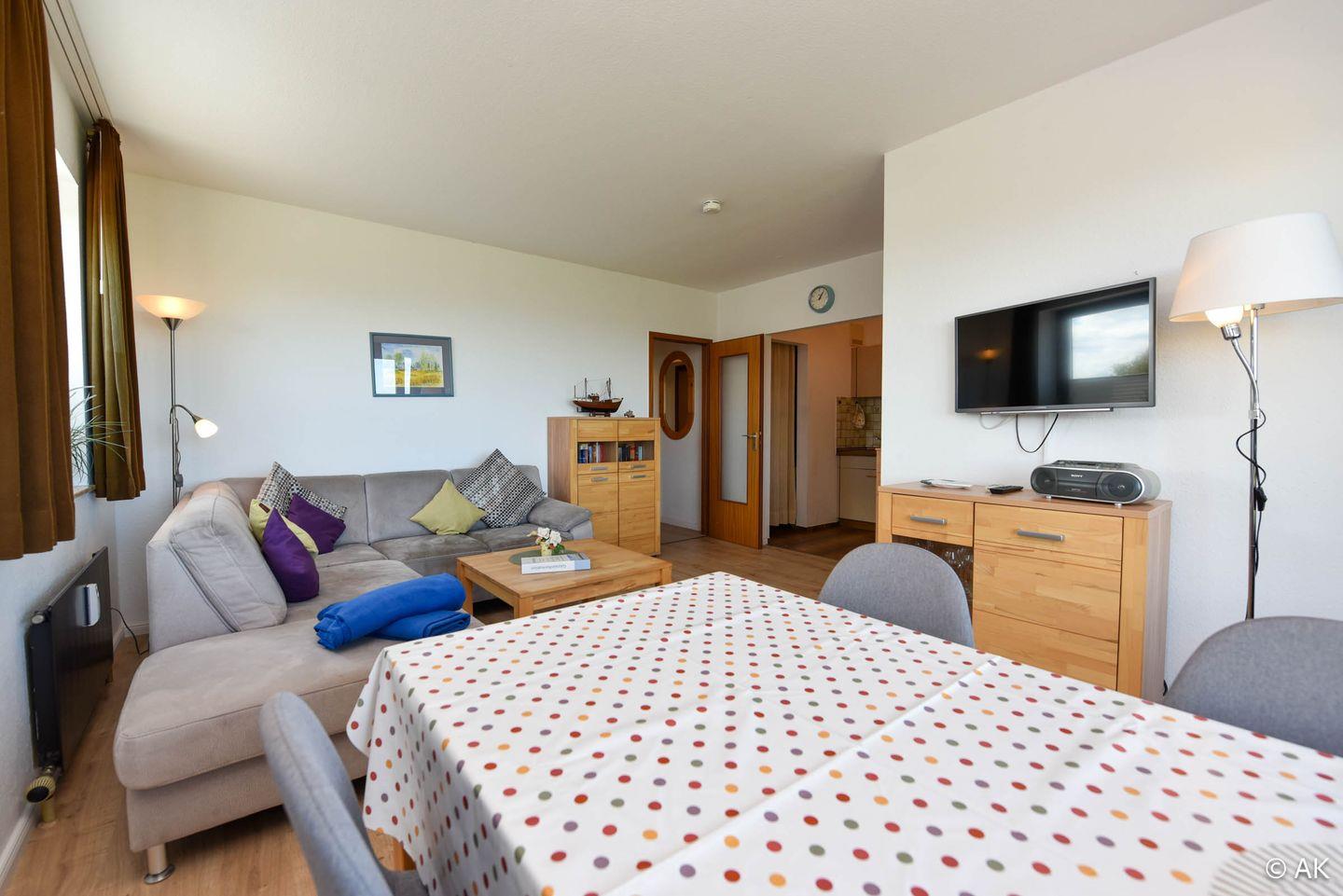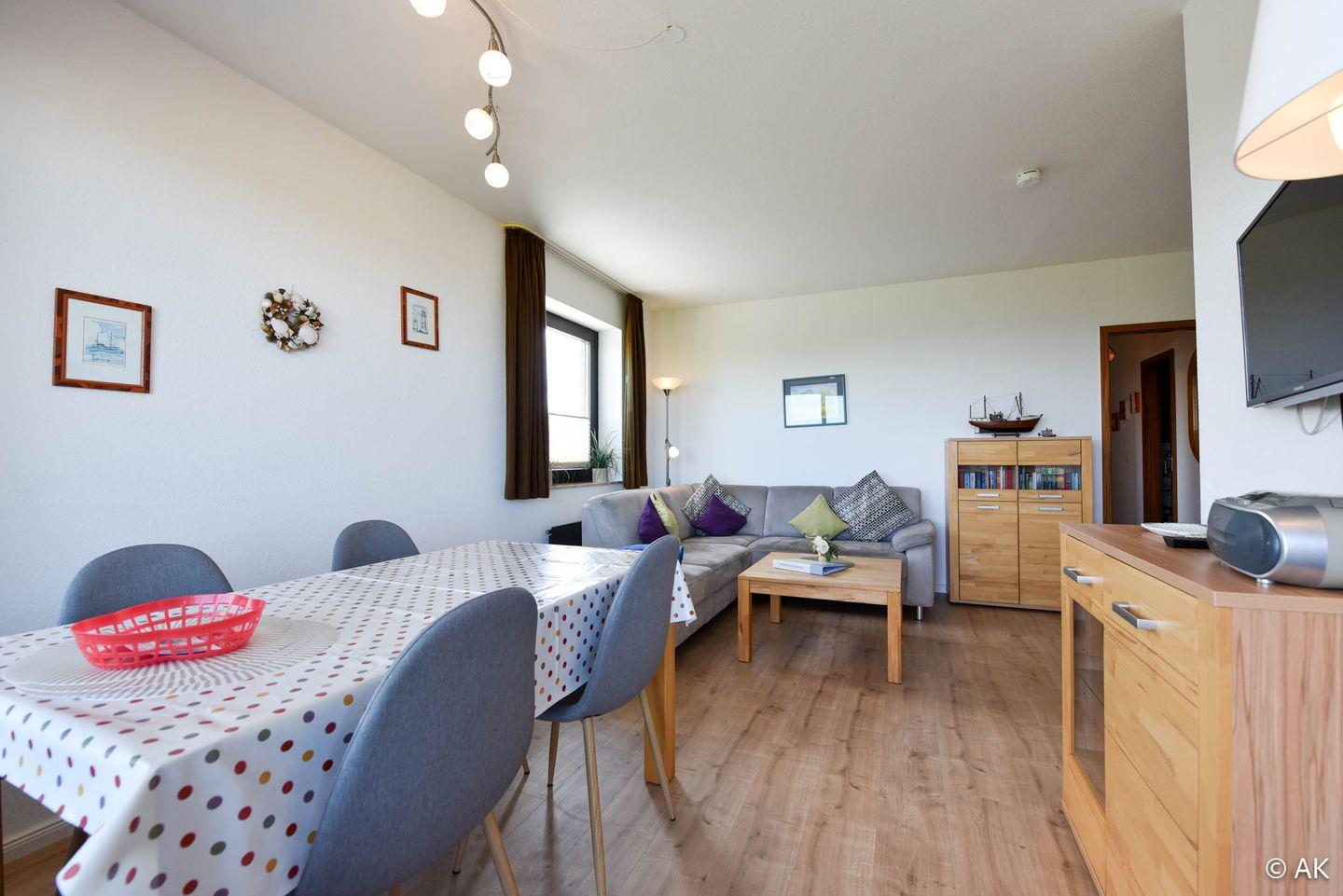 3-Zimmer Appartement für 2-4 Personen im 4. OG mit großem Seesicht-Balkon. Das geräumige Appartement verfügt über eine vom Wohnraum abgetrennte Küche, welche u.a. mit einem Kühlschrank, einem Herd und einer Mikrowelle ausgestattet ist. Im Wohnbereich befindet sich ein gemütliches Ecksofa, sowie ein Esstisch für 4 Personen. Vom Wohnbereich aus geht es zum großen Nord-Ost-Balkon. Schlafraum Nr. 1 ist mit einem Ehebett ausgestattet und Schlafraum Nr. 2 mit einem Etagenbett. Duschbad-WC. Der kostenlose Tiefgaragenstellplatz hat eine Einstellhöhe von 149 cm.