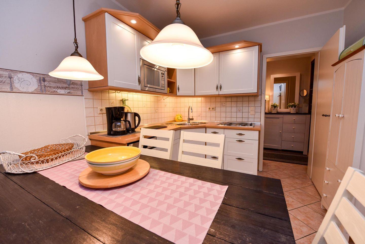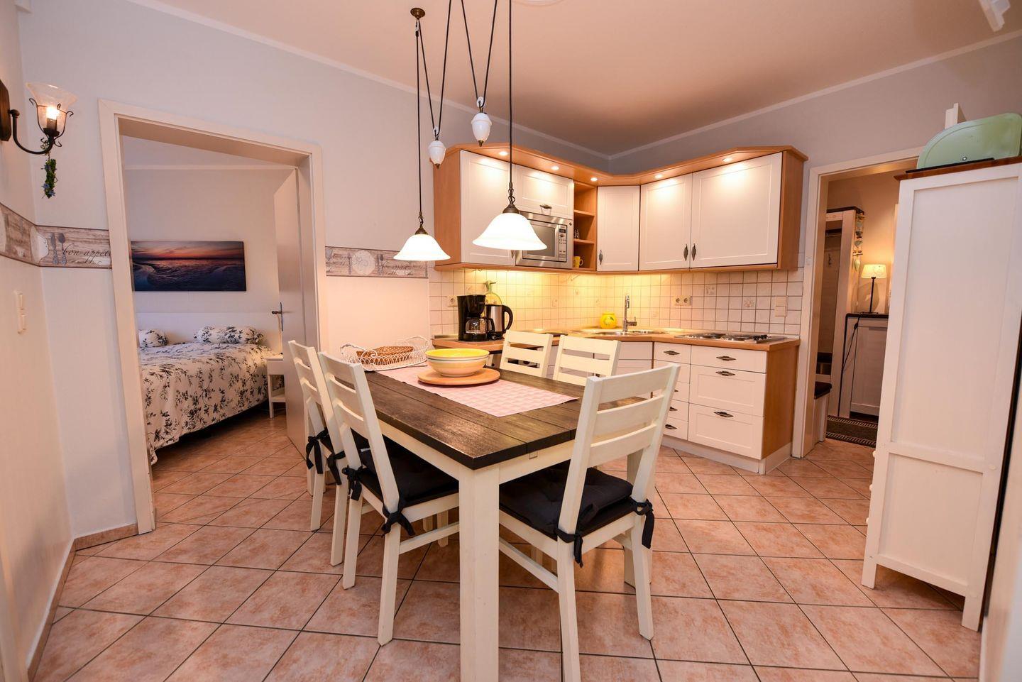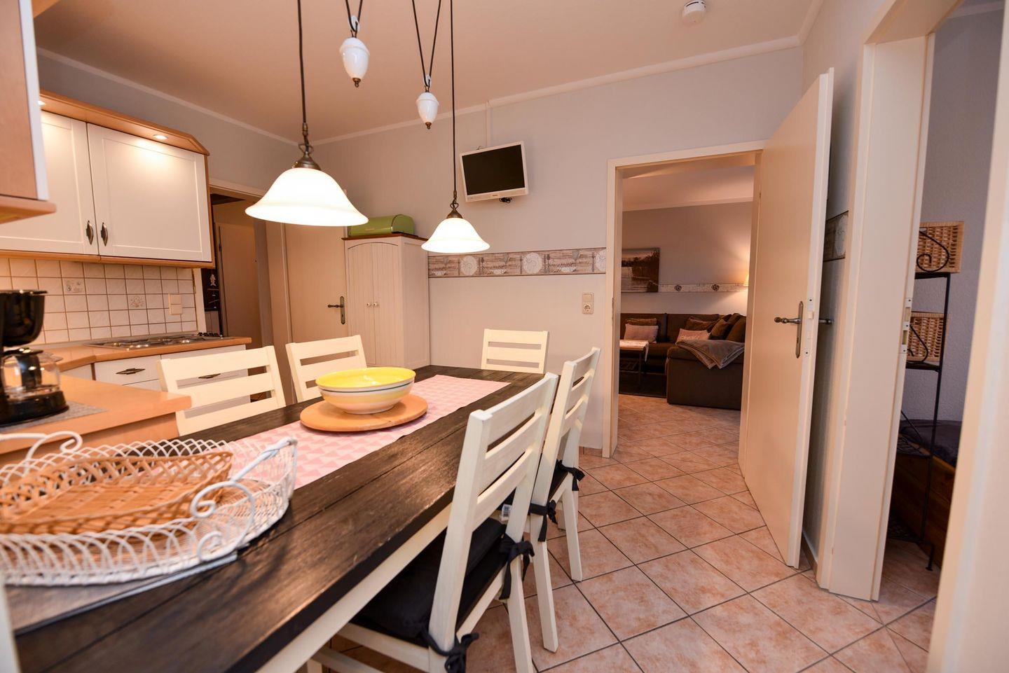 Die Wohnung verfügt über einen geräumigen Wohn-/ Schlafraum mit einer gemütlichen Schlaflandschaft. Zusätzlich stehen Ihnen zwei separate Schlafräume zur Verfügung. Die Küche mit Küchenzeile ist bestens ausgestattet mit einem Kühlschrank ***, Mikrowelle und Geschirrspülautomat. Der Esstisch mit 6 Stühlen bietet ausreichend Platz für gemeinsame Mahlzeiten.
