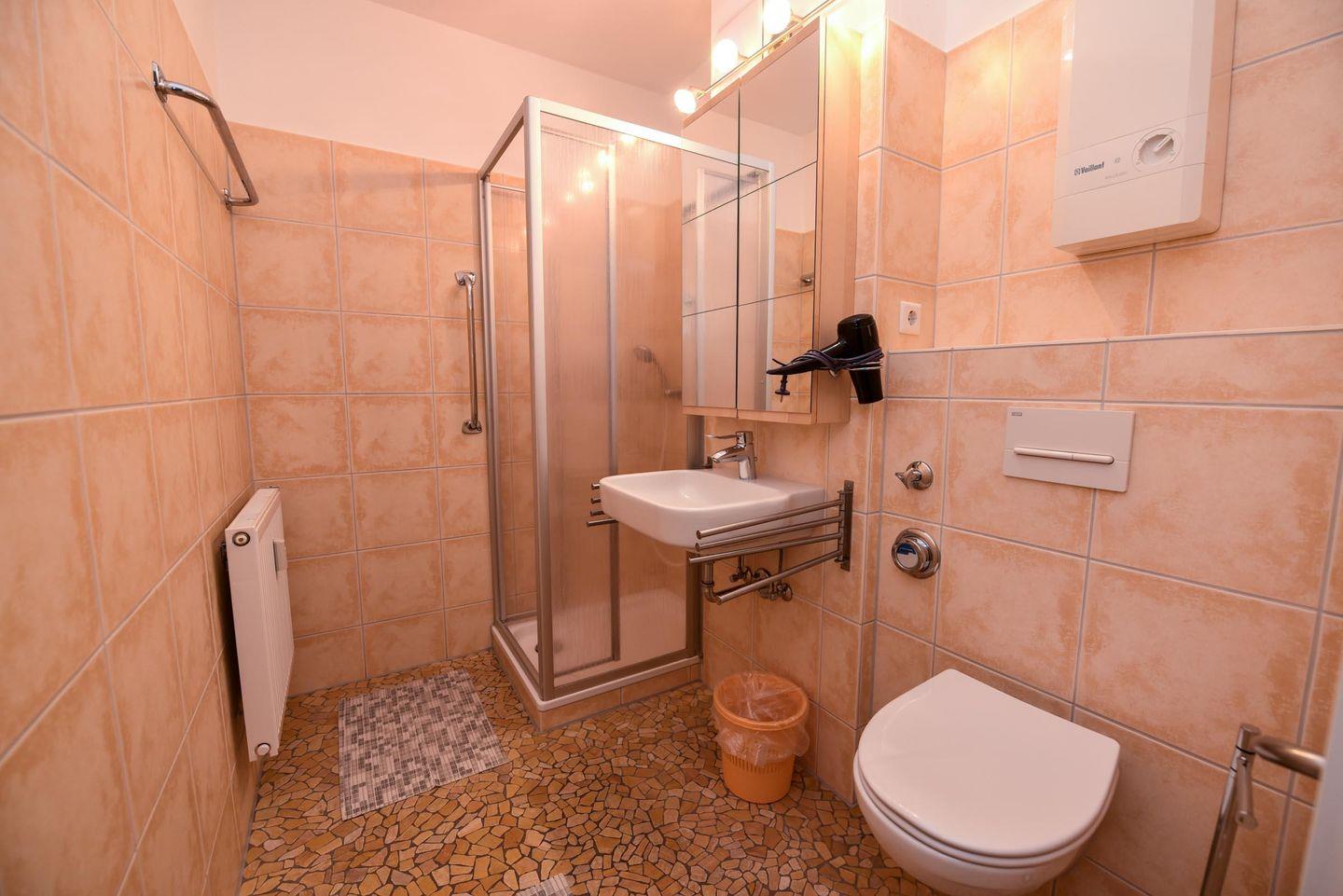 Das moderne, neue Duschbad/WC ist barrierefrei gestaltet mit einer 90cm breiten Tür für extra Komfort.
