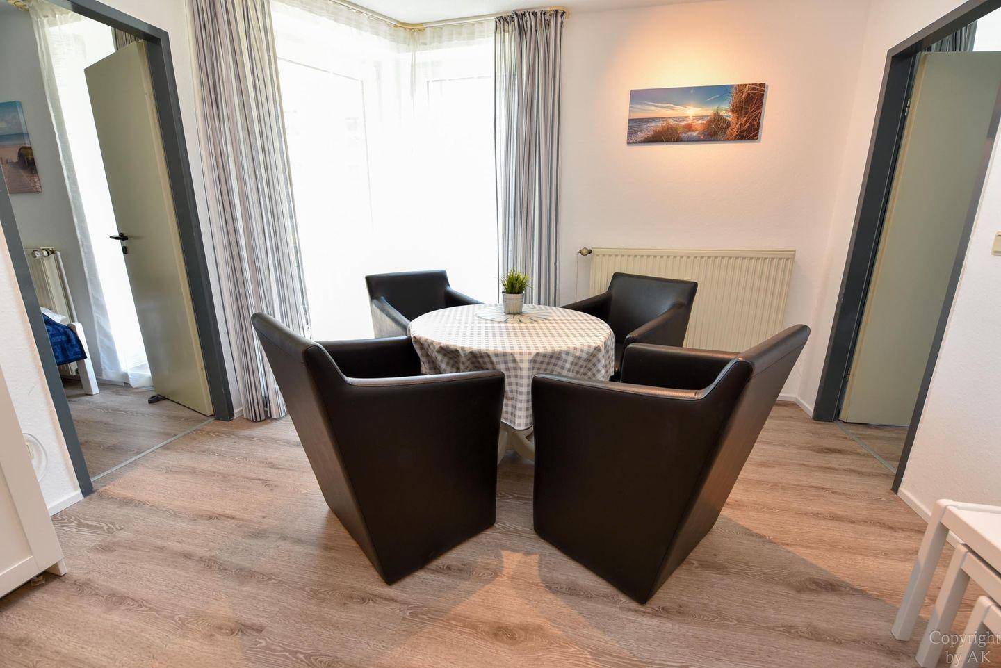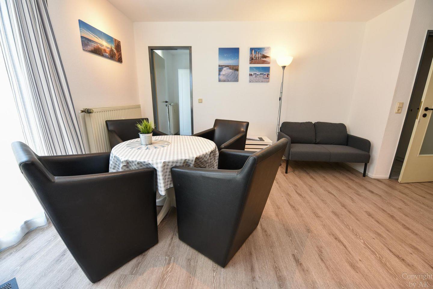Charmantes 3-Zimmer-Ferienappartement im Hochparterre des Hauses PAVILLON, ideal für einen entspannten Aufenthalt. Das Appartement bietet einen einladenden Wohn- und Essbereich sowie zwei gemütliche Schlafzimmer. Die allergikerfreundlichen Fußböden sorgen für zusätzlichen Komfort. Genießen Sie die Annehmlichkeiten der offenen Küchenzeile mit Mikrowelle, die sich perfekt in den Wohnraum integriert. Der Essbereich mit vier komfortablen Sesseln und passendem Tisch ist ideal für gemeinsame Mahlzeiten und gemütliche Stunden. Die Schlafzimmer sind praktisch eingerichtet – eines mit zwei Einzelbetten und das andere mit einem Doppelbett (140x200). Bitte beachten Sie, dass in dieser Wohnung keine Unterbringung eines Babybetts möglich ist. Zur Unterhaltung steht ein großer Fernseher mit Kabelfernsehen zur Verfügung. Der kleine Balkon erweitert den Wohnraum ins Freie. Für Ihren Komfort inkludiert das Appartement einen PKW-Stellplatz sowie kostenloses WLAN.