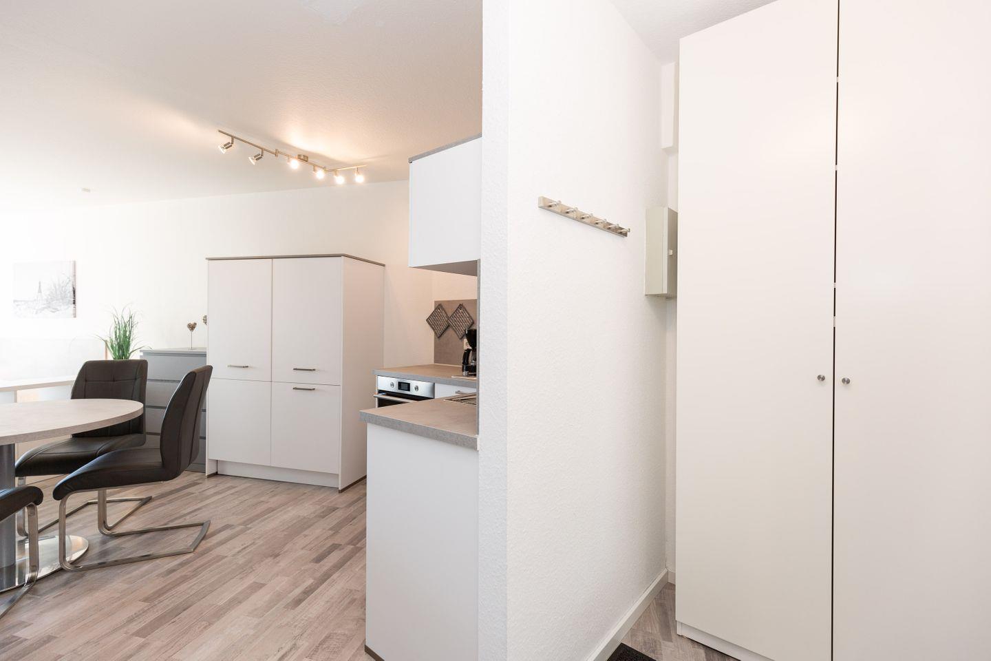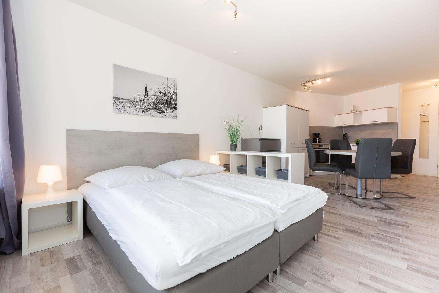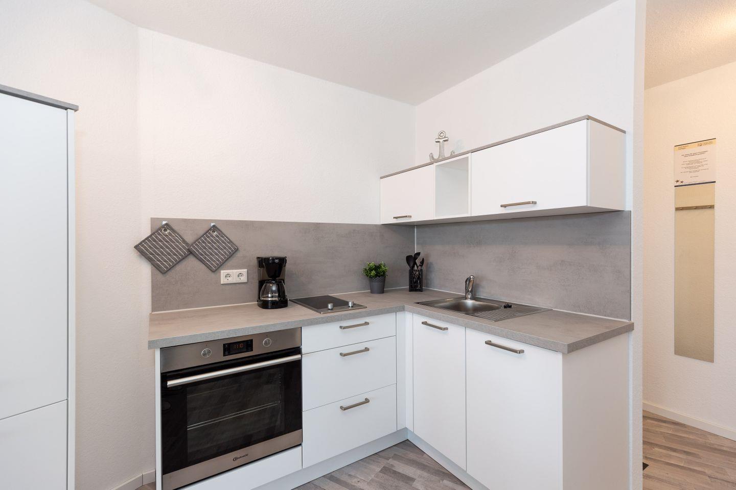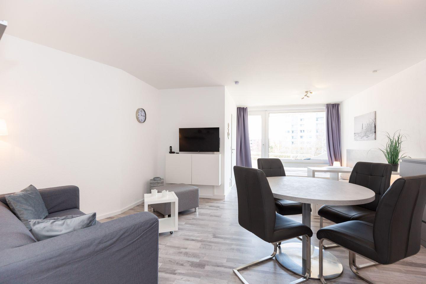Haus Lord Nelson, Typ 2, App. 212, bis 4 Pers., 2. Etage, ca. 40 qm Größe, Weltschifffahrtsweg (ohne Seesicht/Richtung Elbe), Wohnbereich mit Doppelbett (160x200), sep. kleines Kinderzimmer mit Etagenbett, XXL-Dusche/WC, Küchenzeile mit Ceranfeld, Backofen und Geschirrspülmaschine, Balkon, schwenkbarer LCD-TV, kostenl. WLAN-Zugang im App., Telefon, Tiefgaragenstellplatz, Haustiere sind nicht gestattet, Nichtraucher, Strandkorb im Sommer 2026.