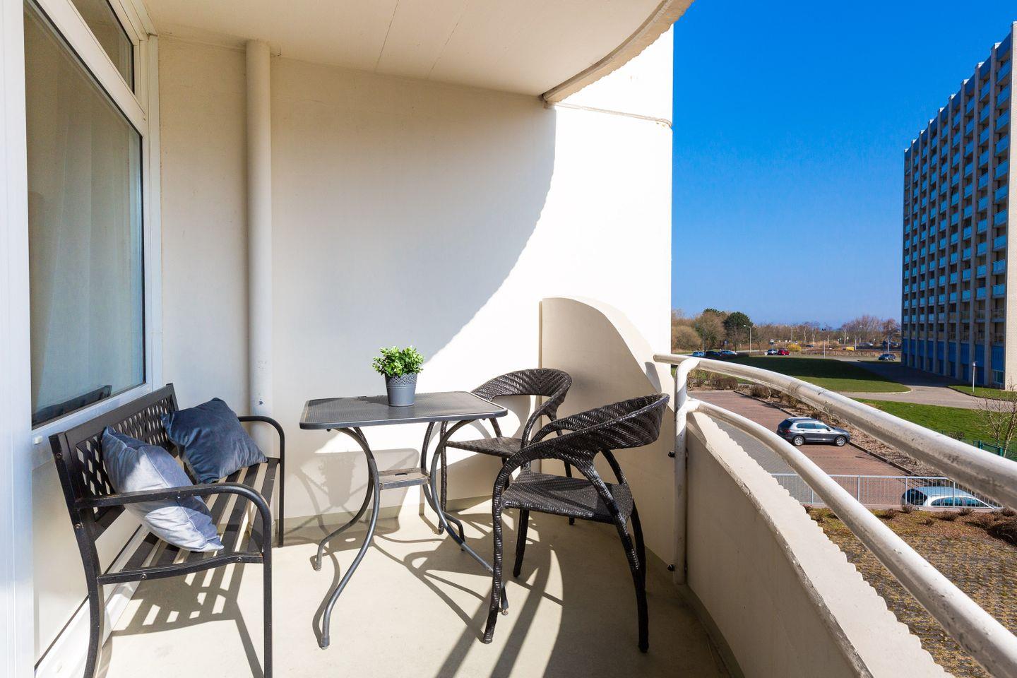 Vom Wohnbereich gelangen Sie direkt auf den Balkon, der mit gemütlichen Balkonmöbeln ausgestattet ist. An lauen Sommerabenden können Sie hier gemeinsam den Tag ausklingen lassen.