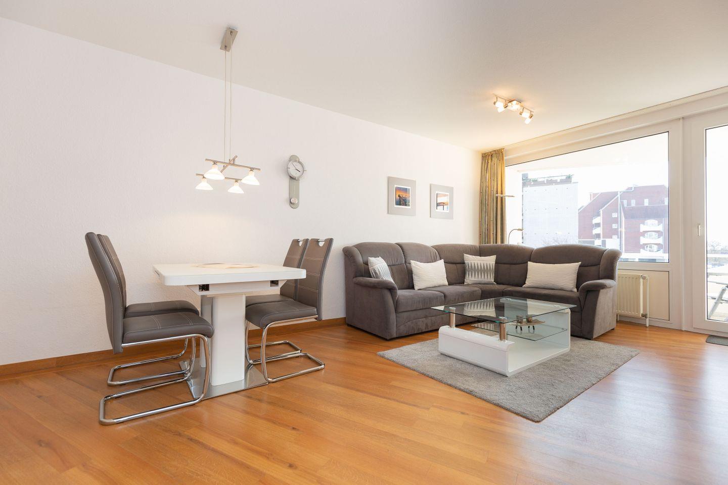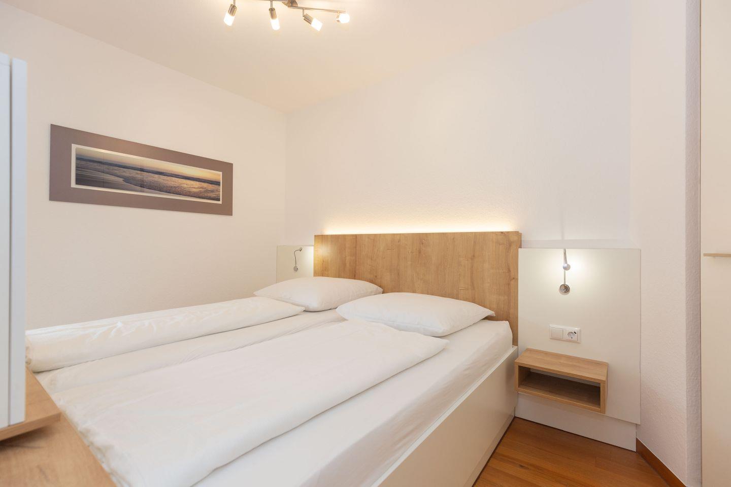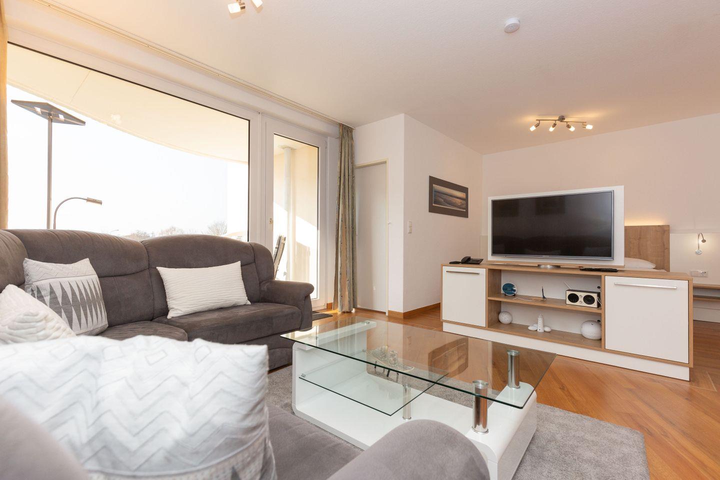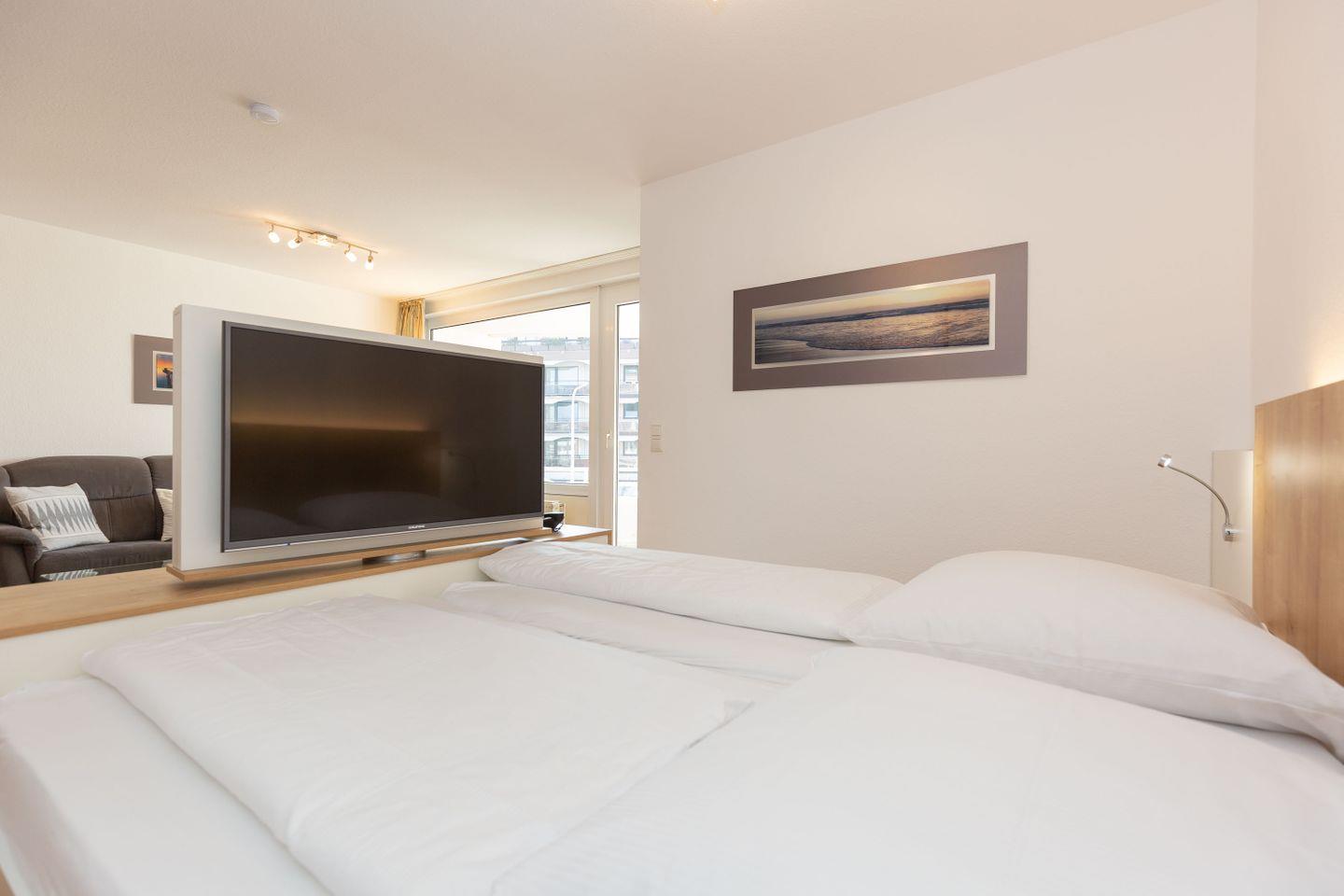 Haus "Trafalgar", Typ C, Appartement-Nr. 124, bis 4 Pers., 1. Etage, ca. 55 qm, Westseite (ohne Meerblick), Wohn/Schlafbereich mit Doppelbett, separates Schlafzimmer mit ausziehbarem Doppelbett, Dusche/WC, Küchenzeile mit Geschirrspüler, Backofen und 4-Platten-Ceranfeld, Balkon mit Markise, Kabel-TV, Telefon, Tiefgaragenstellplatz, W-Lan Zugang im App, Strandkorb im Sommer 2026.