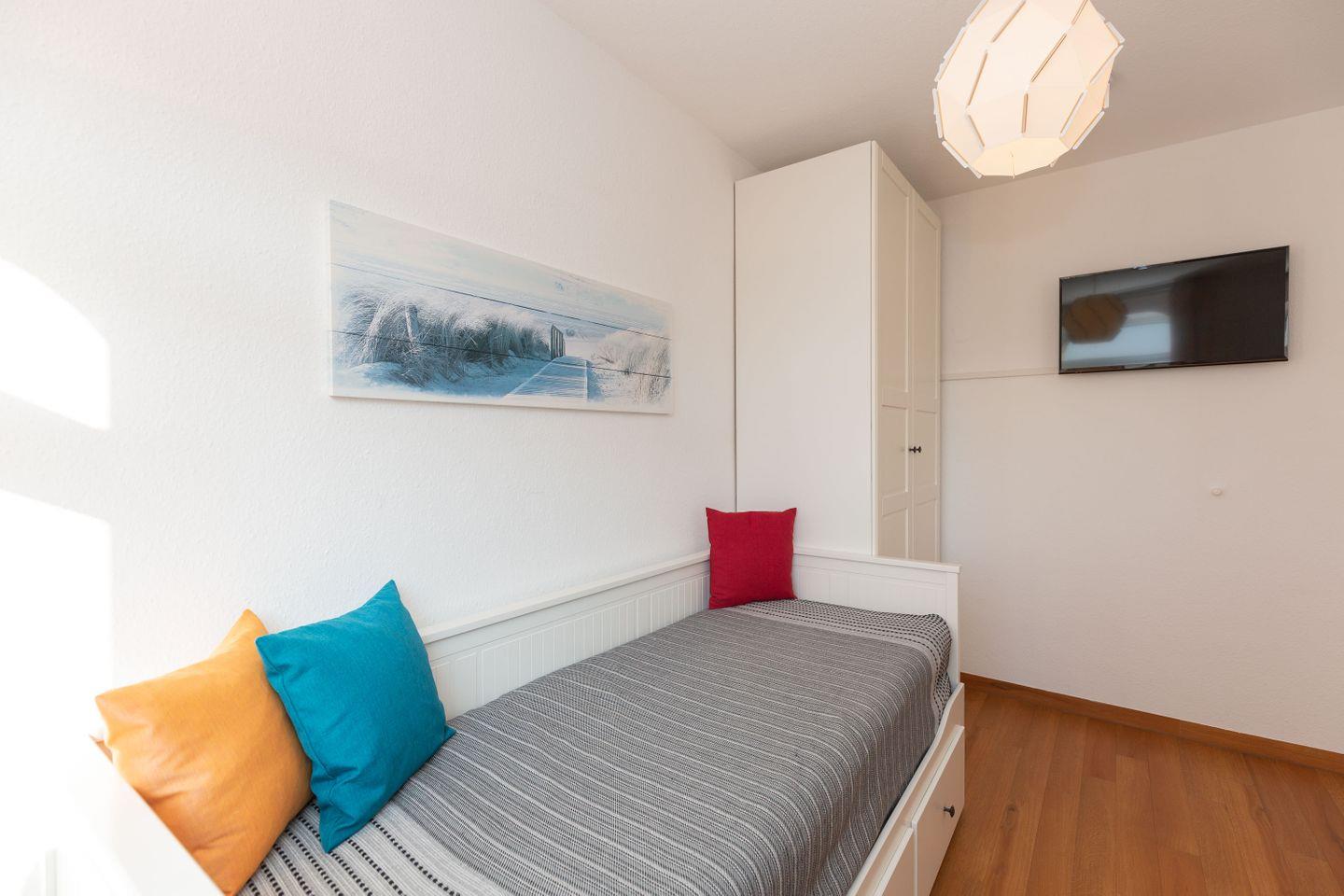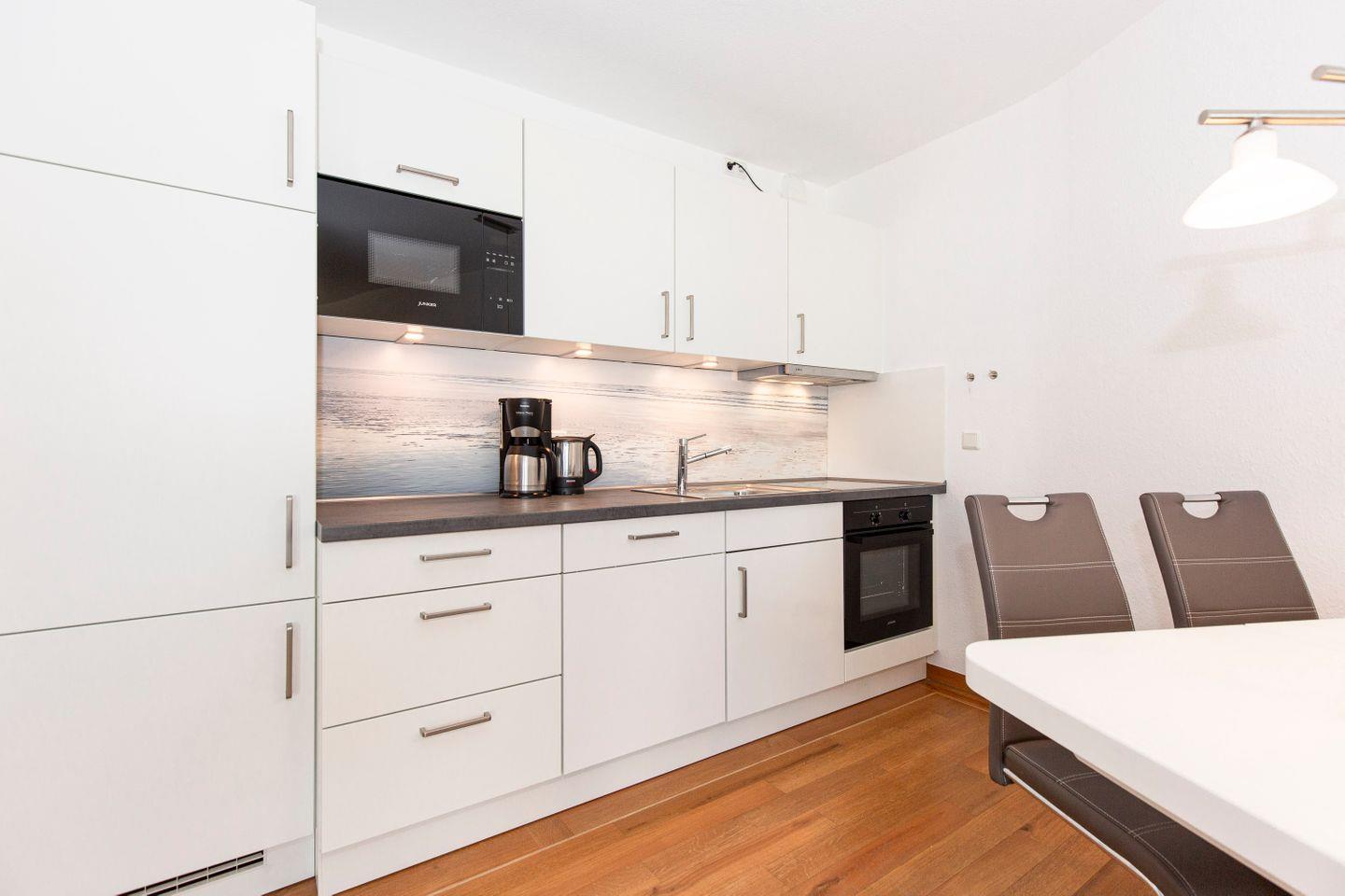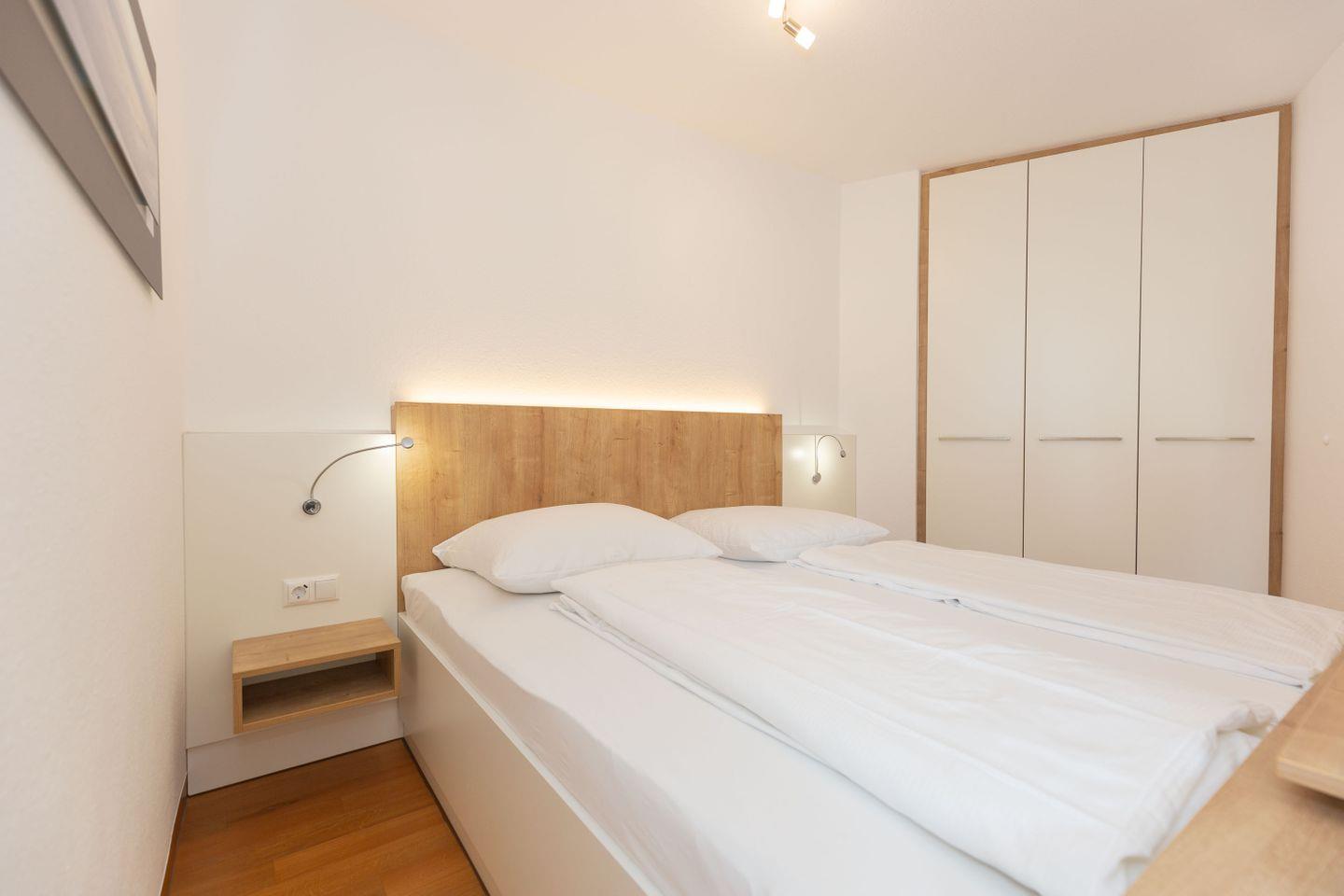 Haus "Trafalgar", Typ C, Appartement-Nr. 124, bis 4 Pers., 1. Etage, ca. 55 qm, Westseite (ohne Meerblick), Wohn/Schlafbereich mit Doppelbett, separates Schlafzimmer mit ausziehbarem Doppelbett, Dusche/WC, Küchenzeile mit Geschirrspüler, Backofen und 4-Platten-Ceranfeld, Balkon mit Markise, Kabel-TV, Telefon, Tiefgaragenstellplatz, W-Lan Zugang im App, Strandkorb im Sommer 2026.