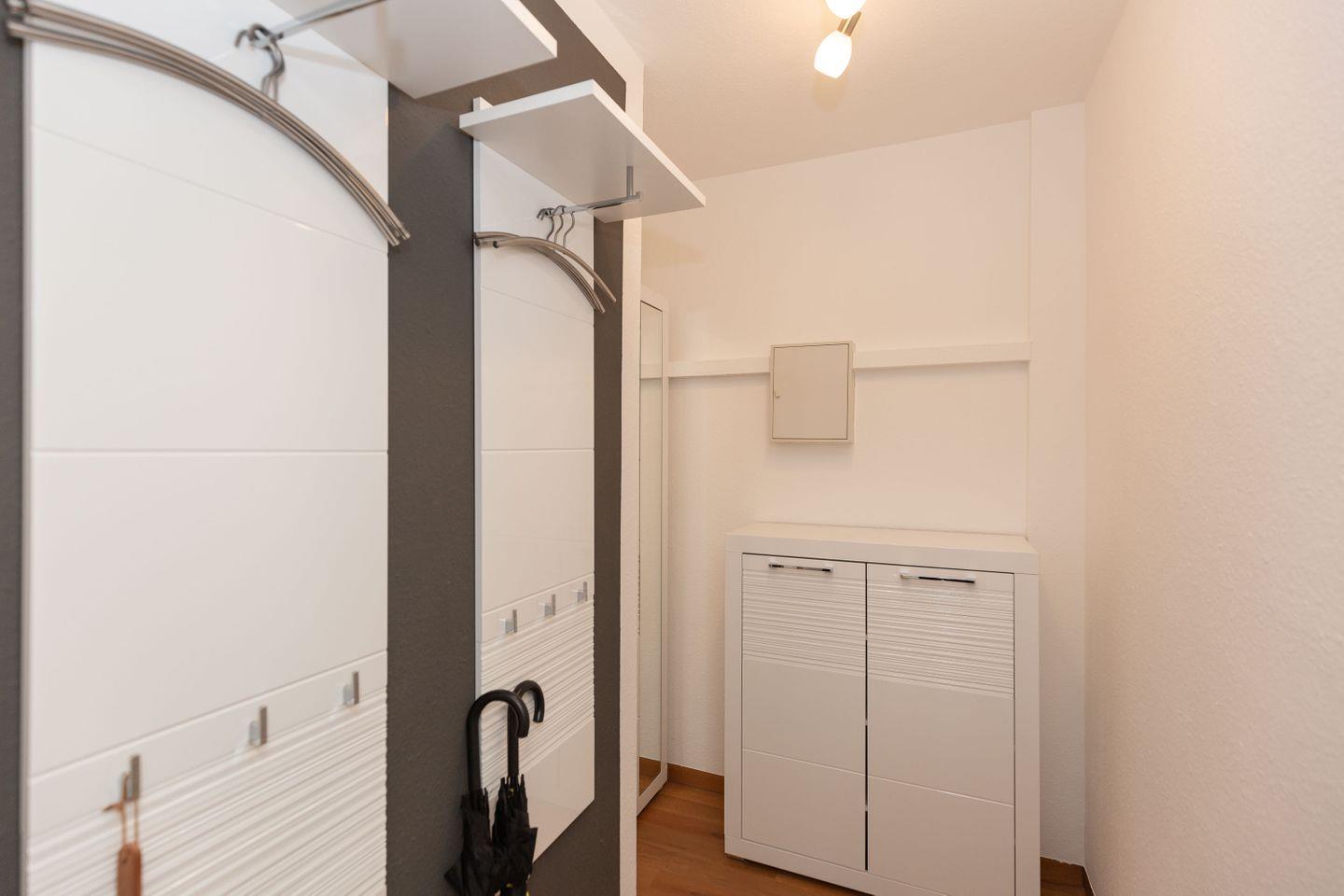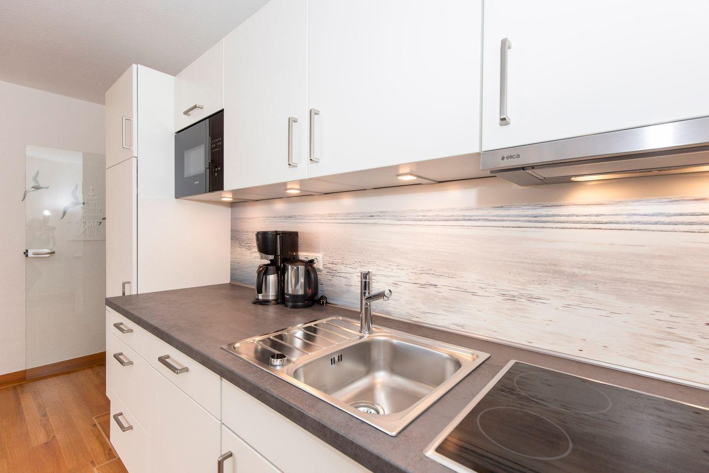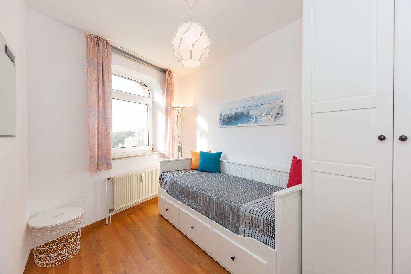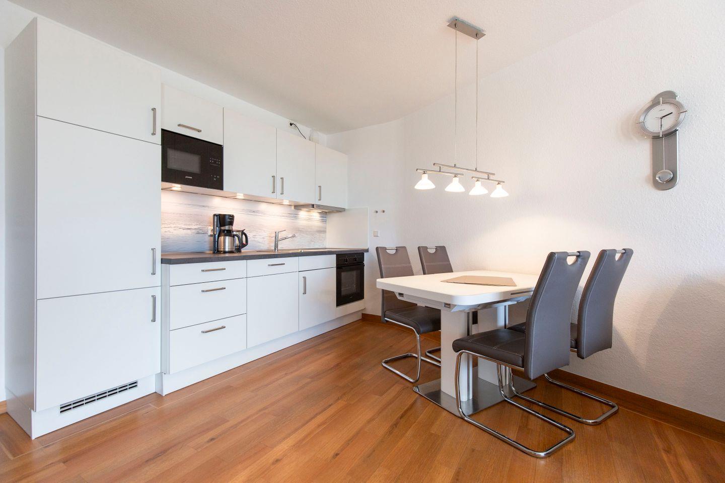 Haus "Trafalgar", Typ C, Appartement-Nr. 124, bis 4 Pers., 1. Etage, ca. 55 qm, Westseite (ohne Meerblick), Wohn/Schlafbereich mit Doppelbett, separates Schlafzimmer mit ausziehbarem Doppelbett, Dusche/WC, Küchenzeile mit Geschirrspüler, Backofen und 4-Platten-Ceranfeld, Balkon mit Markise, Kabel-TV, Telefon, Tiefgaragenstellplatz, W-Lan Zugang im App, Strandkorb im Sommer 2026.