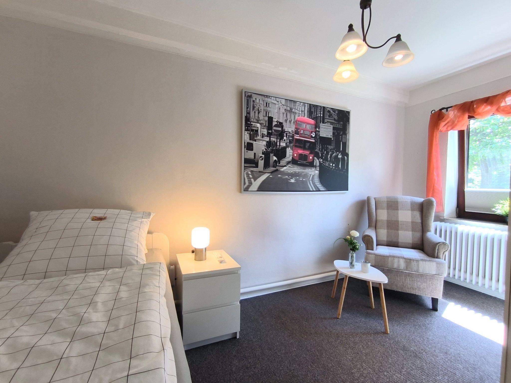 Die Ferienwohnung liegt im Erdgeschoss eines Anbaus von einem großen Einfamilienhaus und besteht aus einem gemütlichen Wohnzimmer mit Kamin und Flachbild-TV, einer Küche mit Esstisch, einem modernen Badezimmer mit großer, ebenerdiger Dusche sowie drei Schlafzimmern (1 x Einzelbett + TV, 1 x Doppelbett + TV, 1 x französisches Bett + TV). Kostenfreie Parkplätze gibt es direkt vor dem Haus und die Nutzung der Waschmaschine ist möglich. Bettwäsche und Handtücher sind im Preis inbegriffen, für die Endreinigung wird eine Gebühr berechnet. Eine Aufbettung für eine weitere Person ist auf Anfrage möglich. Eine abschließbare Fahrradunterstellung ist vorhanden.