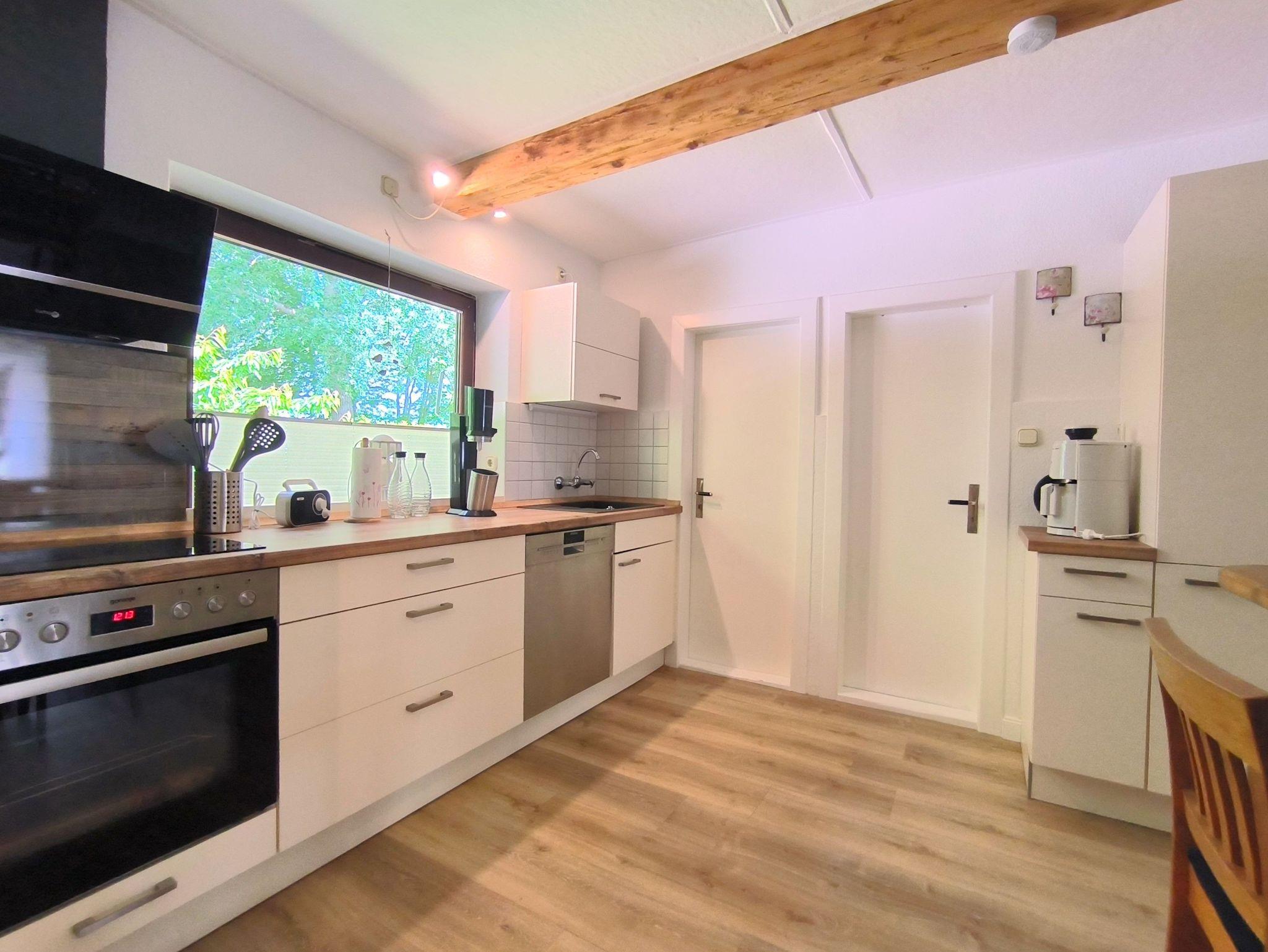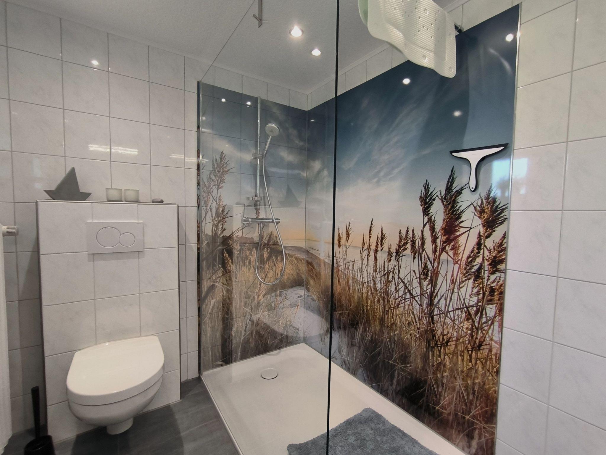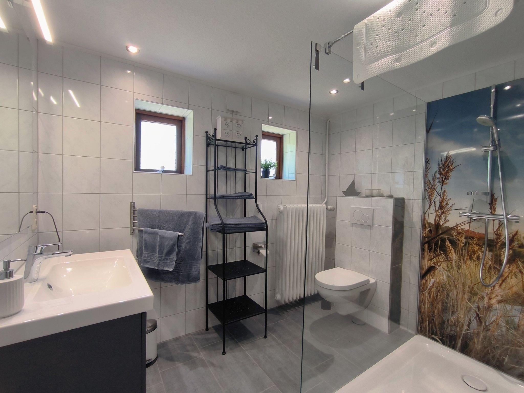 In der Ferienwohnung zwischen den Meeren können Sie sich rundum wohlfühlen: sie ist liebevoll eingerichtet und vielseitig ausgestattet: in allen drei Schlafzimmern finden Sie je einen eigenen Fernseher, in zwei Zimmern einen Lesessel und in einem Zimmer einen Schreibtisch. In allen Schlafzimmern gibt es Insektenschutz an den Fenstern und Verdunklungsmöglichkeiten. Neben dem frisch renovierten Bad mit ebenerdiger Dusche, gibt es noch einen kleinen Flur mit zusätzlichem Waschbecken und einer Waschmaschine. Die Küche ist klein, aber fein und vollumfänglich ausgestattet. Im großen Wohnzimmer kann man es sich auf dem großen Sofa bequem machen und an Schlechtwettertagen vor dem Kamin entspannen. Die kleinen Gäste des Hauses finden im Wohnzimmer einige Gesellschaftsspiele und Lesebücher.