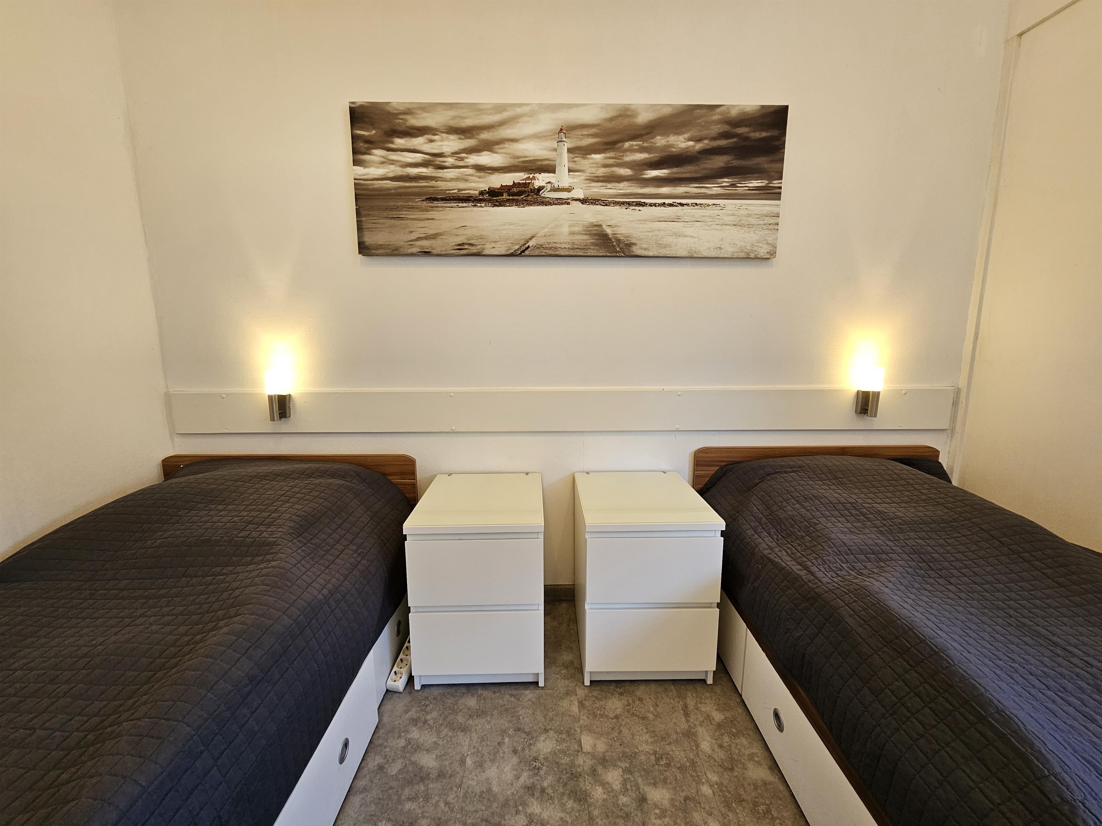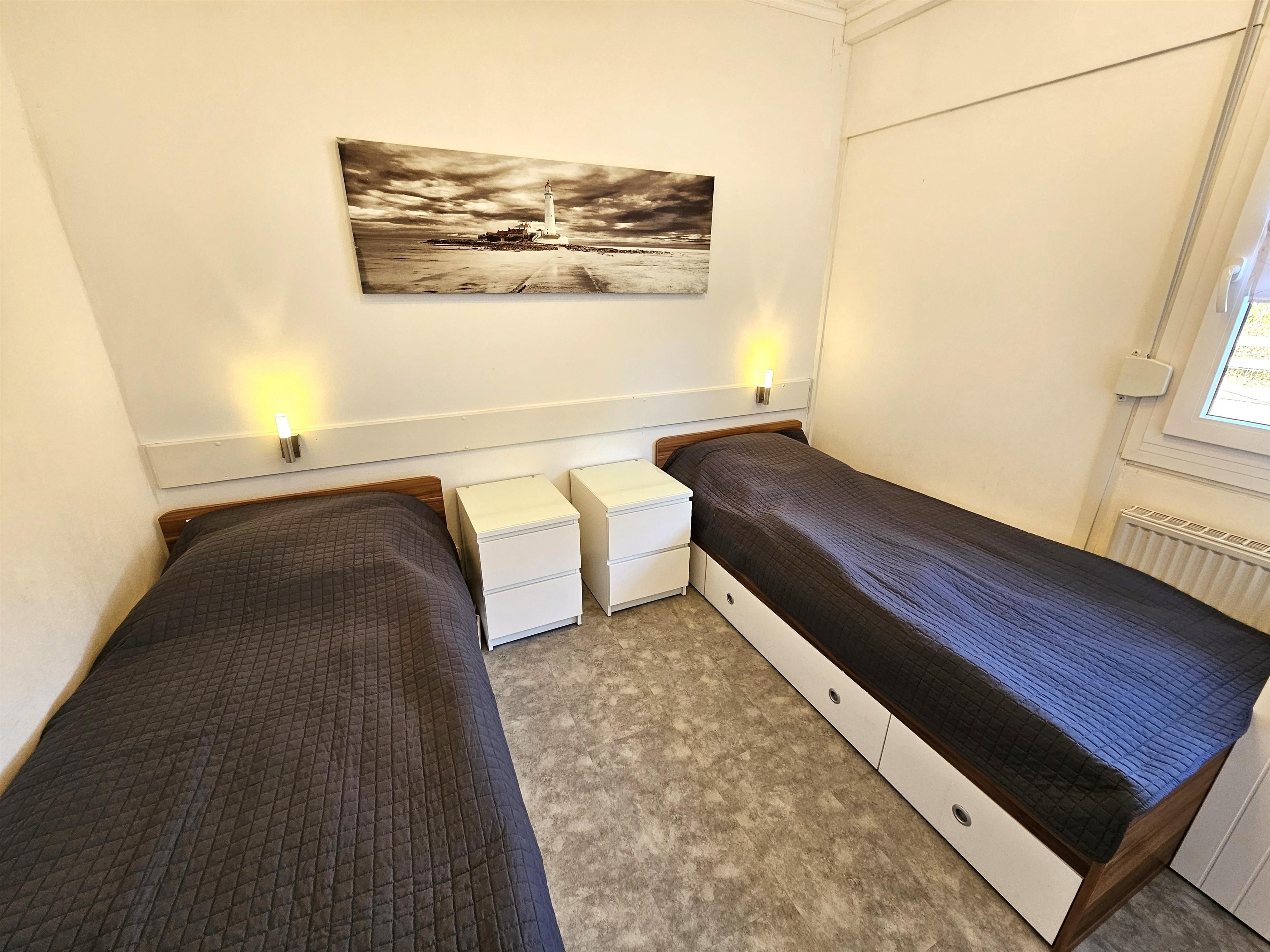 Schlafzimmer (1) mit zwei Einzelbetten (100 cm x 200 cm), Fensterrolladen, Kleiderschrank und Nachtleuchte.
