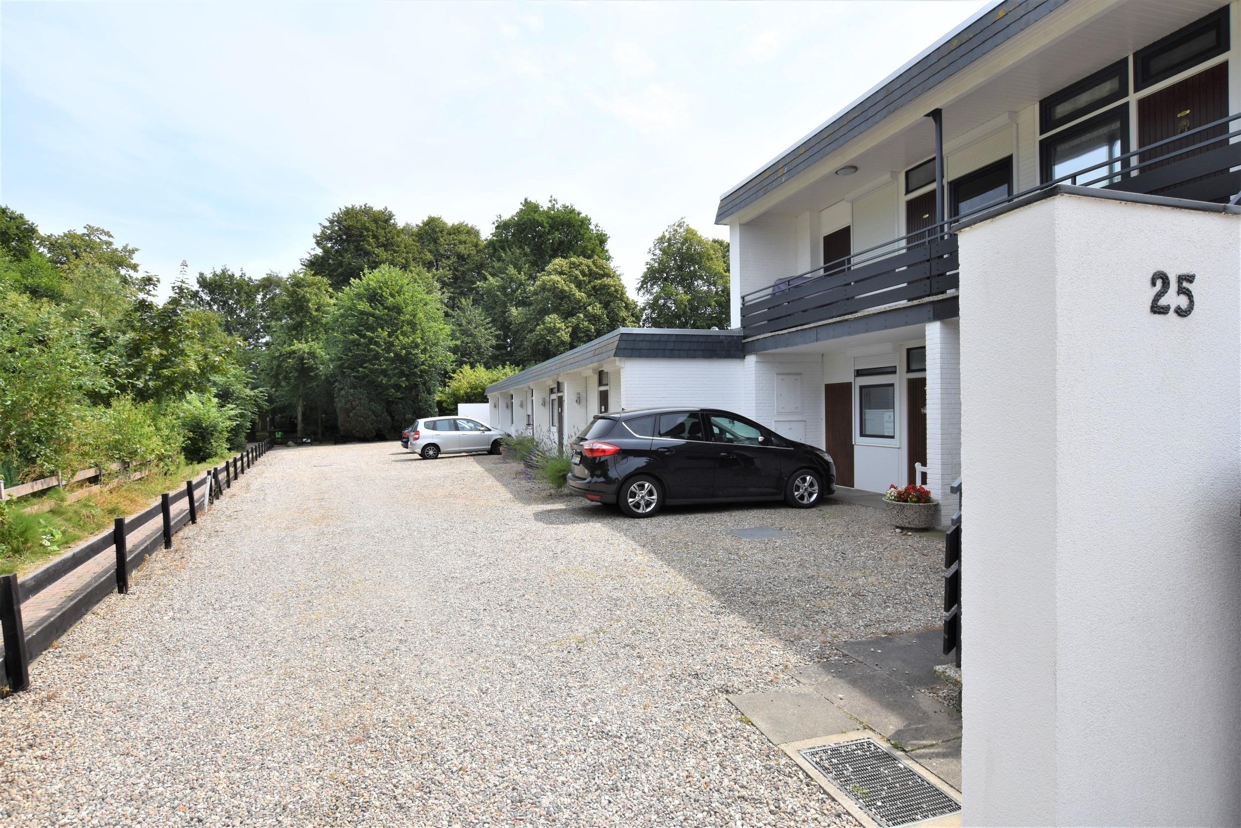 Sie fahren mit Ihrem Fahrzeug auf Ihren festen Stellplatz (Nr. 5) direkt vor dem Haus, steigen aus und gehen zum Eingang. Wenn Sie die Wohnungstür öffnen, stehen Sie im Flur – hier befindet sich auf der linken Seite die offene Küche mit Mikrowelle, Ceranfeld, Wasserkocher usw.