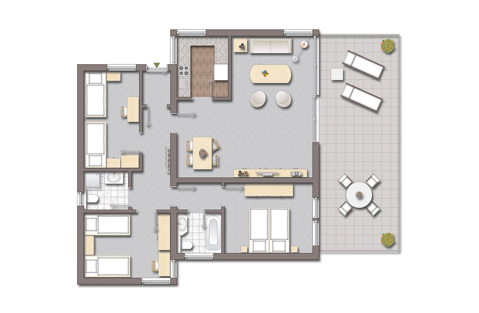 In unserem Ferienhaus "Ahorn" können Sie sich so richtig entfalten: Auf einer Fläche von 95 m² sind drei Schlafzimmer (ein Doppelbett, vier Einzelbetten), zwei Bäder und ein Wohnraum mit Schlafcouch und Essbereich untergebracht. Die separate Küche ist vom Wohnzimmer aus zugänglich und mit Mikrowelle, Kaffee- und Spülmaschine sowie diversen Kochutensilien bestens ausgestattet, um sich bei einem längeren Aufenthalt auch selbst versorgen zu können.