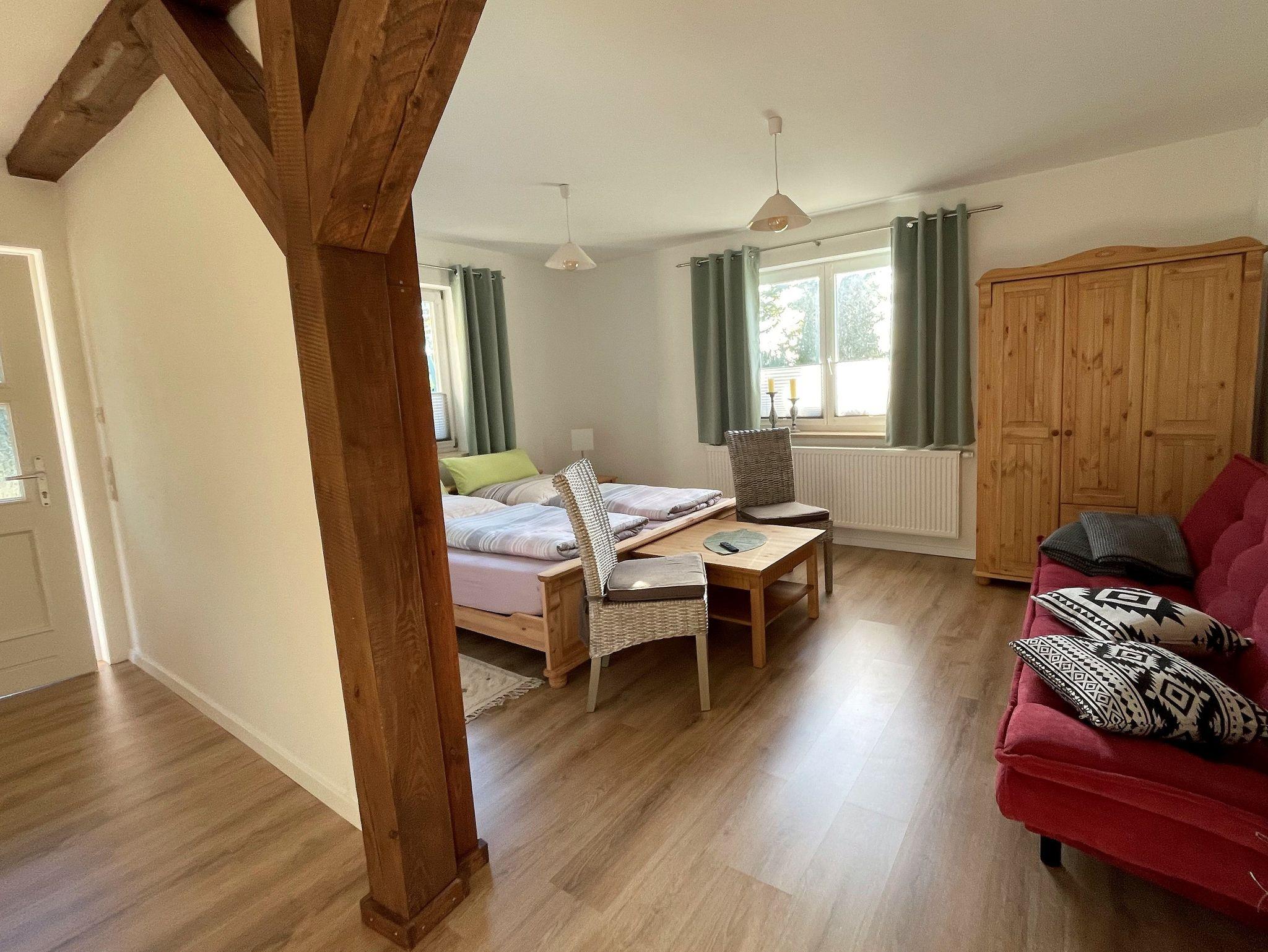 Der Wohnbereich ist durch einen Raumteiler vom Schlafbereich getrennt. Dieser ist mit einem Doppelbett, Sesseln und Sofa sowie einem Kleiderschrank eingerichtet.