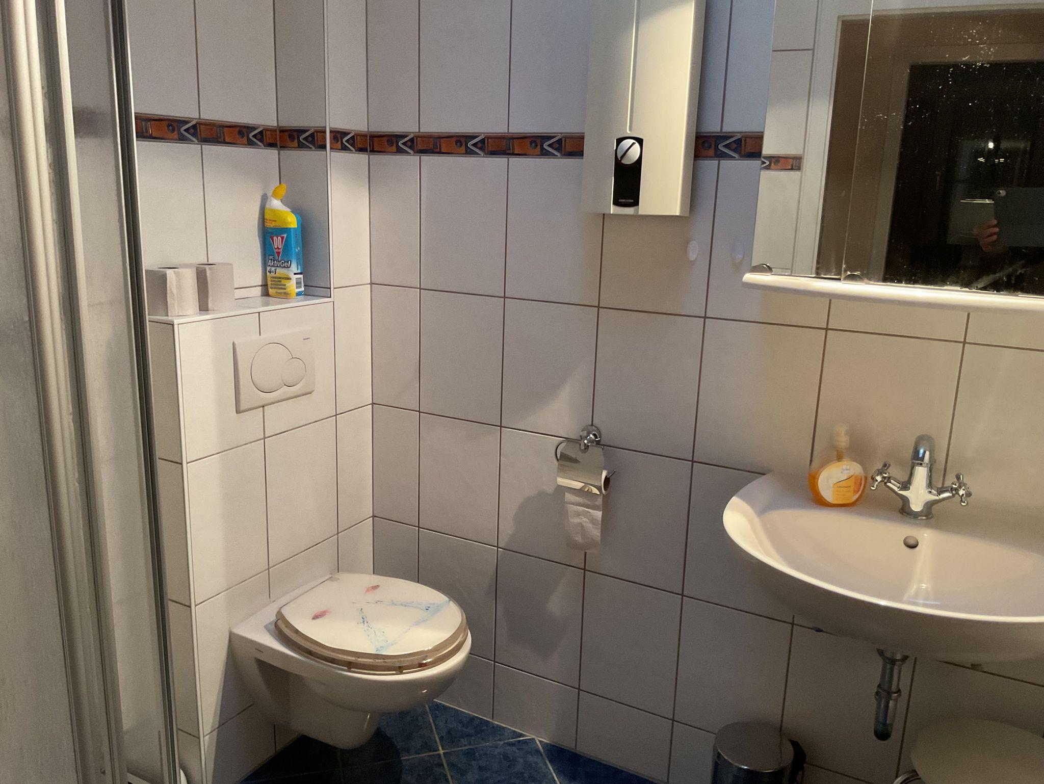 Tageslicht Badezimmer mit Dusche und WC.