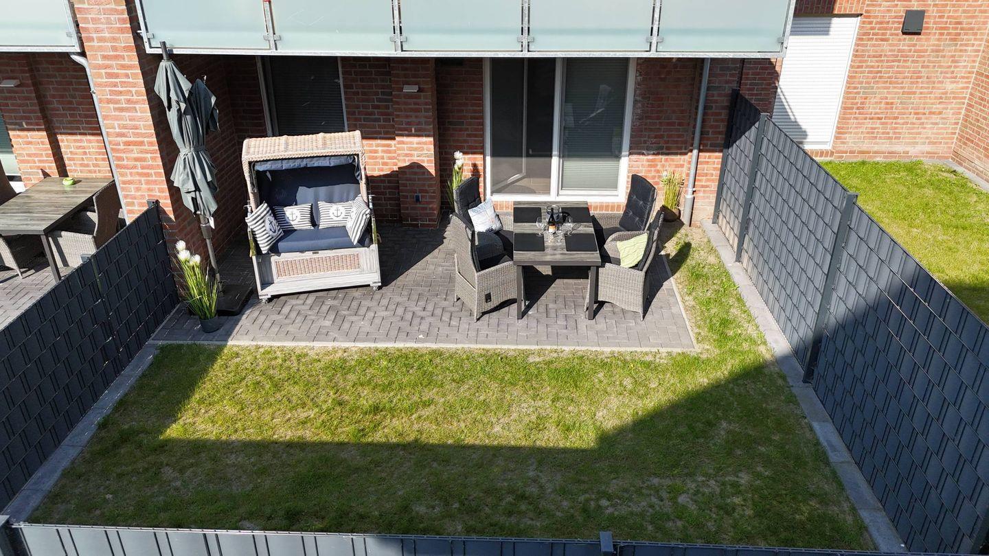 Die Wohnung verfügt über eine weitläufige Südterrasse, die mit einem gemütlichen Strandkorb und stilvollen Gartenmöbeln zum Verweilen einlädt. Der angrenzende Garten bietet weitere Möglichkeiten, die frische Meeresluft in vollen Zügen zu genießen. Ein großer Smart-TV im Wohnzimmer sorgt für beste Unterhaltung, während die Fußbodenheizung in der gesamten Wohnung für behagliche Wärme sorgt. Ein schneller Internetzugang über Gigacube rundet das moderne Wohnambiente ab.