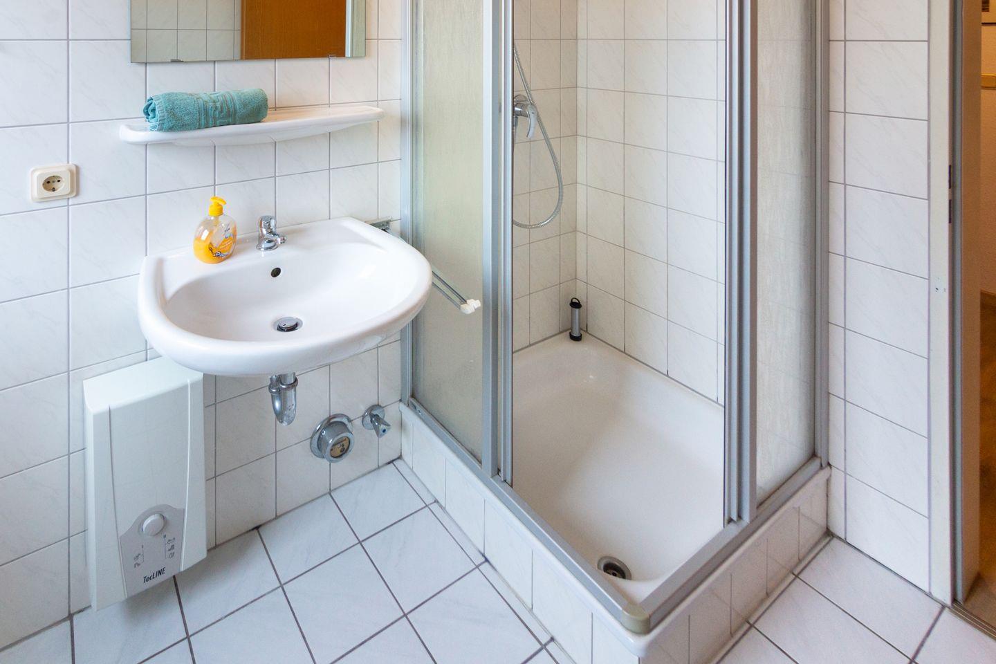 Das Duschbad mit WC und Fenster bietet neben einer Dusche auch genügend Stauraum für Ihre persönlichen Dinge.