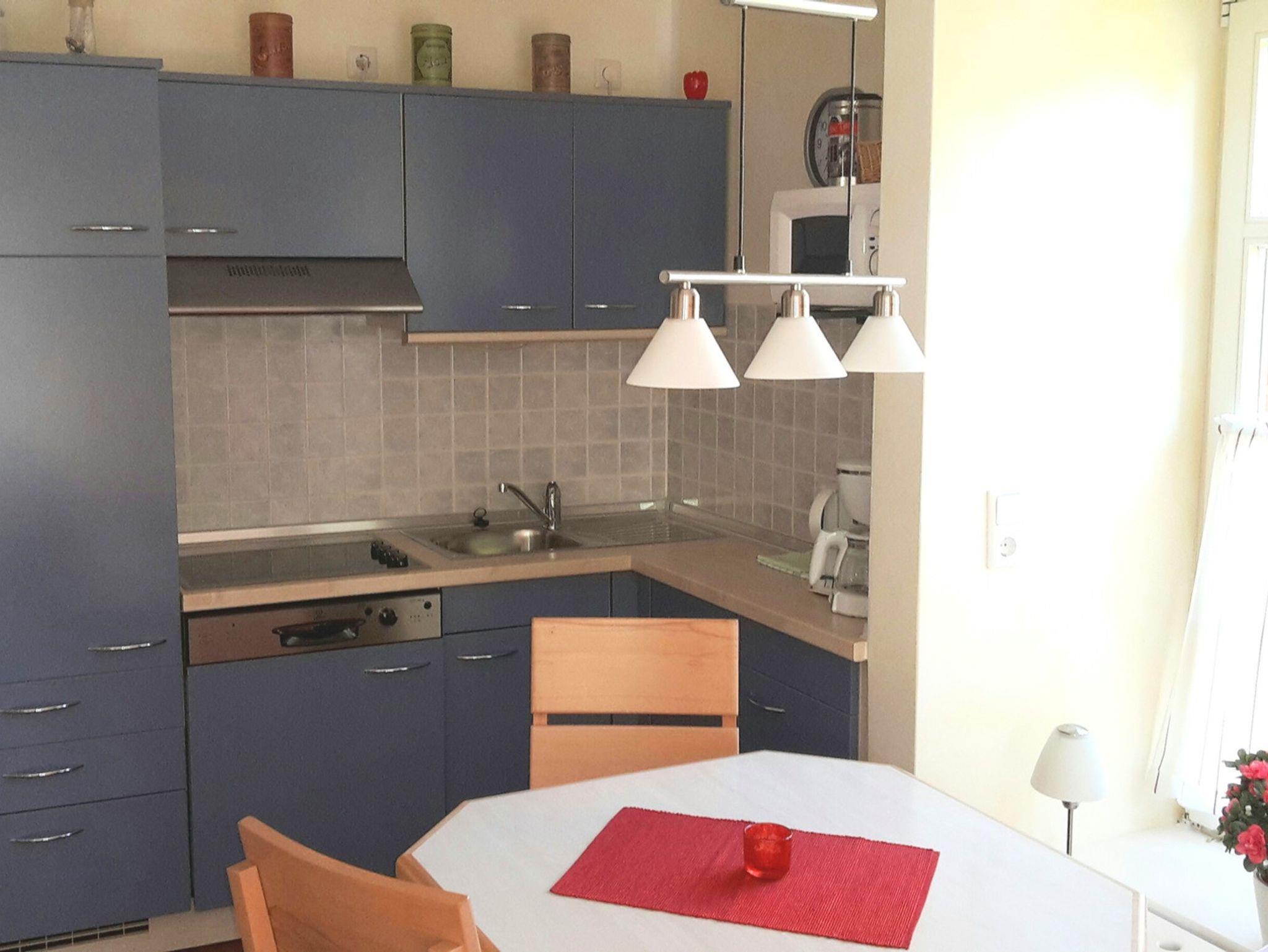 Der Wohnraum verfügt über eine komplett eingerichtete Küchenzeile mit Spülmaschine, Cerankochfeld, Dunstabzug, Kühlschrank mit Gefrierfach, Mikrowelle, Toaster, Grill, Wasserkocher, Kaffeemaschine und vielem weiteren Küchenzubehör.