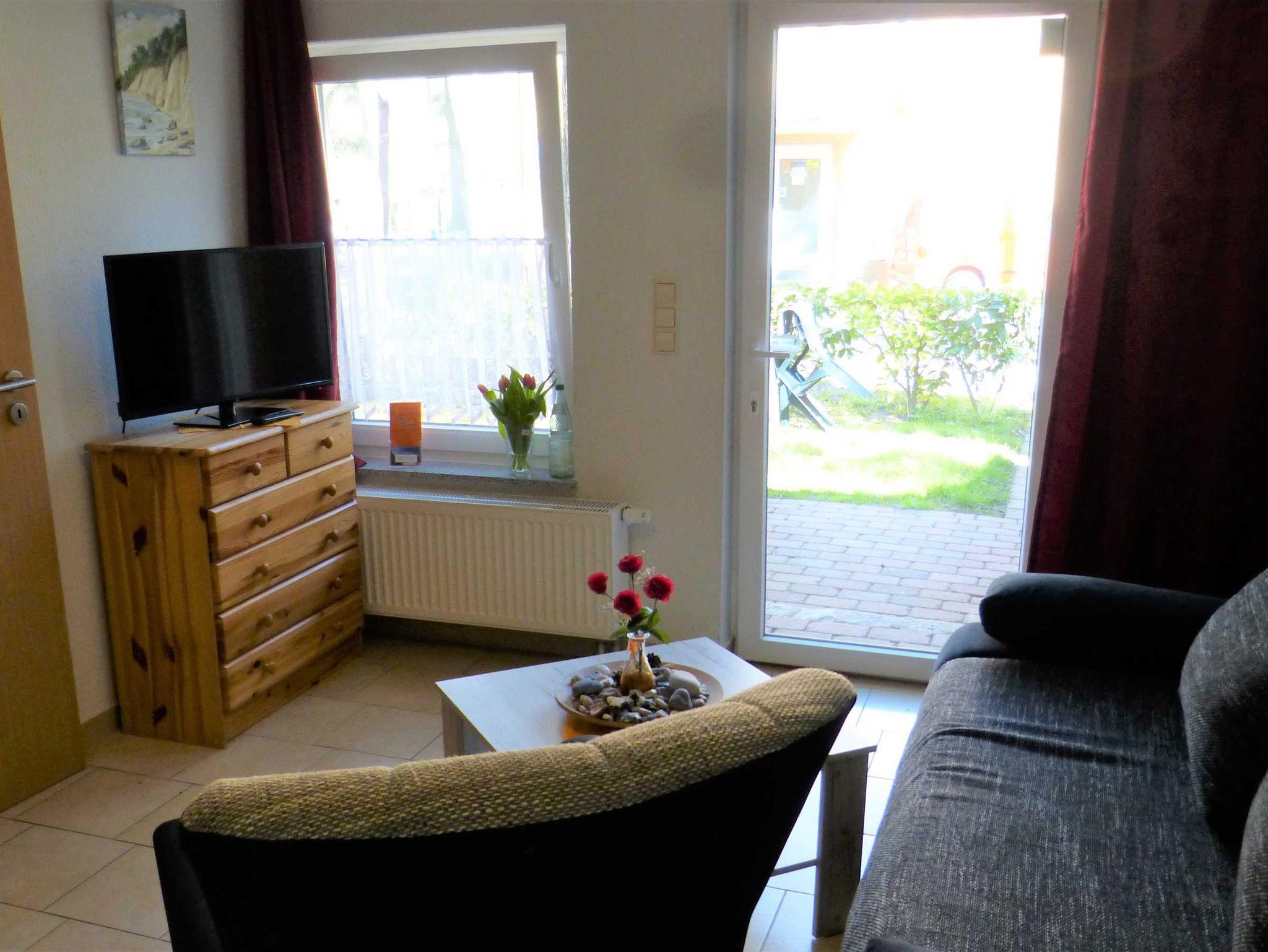 Die Ferienwohnung liegt im Erdgeschoß, hat eine Größe von 44 m² und verfügt über einen Wohnraum mit Pantry, zwei Schlafzimmer (ein Doppelbett, 2 Einzelbetten), ein Badezimmer und eine Terrasse. Im Wohnzimmer ist zudem eine Aufbettung möglich (Schlafsofa). In der Miniküche befinden sich zwei Kochplatten, eine Kaffemaschine, ein Wasserkocher, ein Toaster, ein Kühlschrank mit Gefrierfach sowie eine Mikrowelle. Wäsche kann zugebucht werden ((Handtuch- Bettwäschepaket 25,00 pro Person). Im Ferienpark kann ein Grill gemietet werden, ebenso ist die Nutzung einer gemeinschaftlichen Waschmaschine möglich (gegen Gebühr).