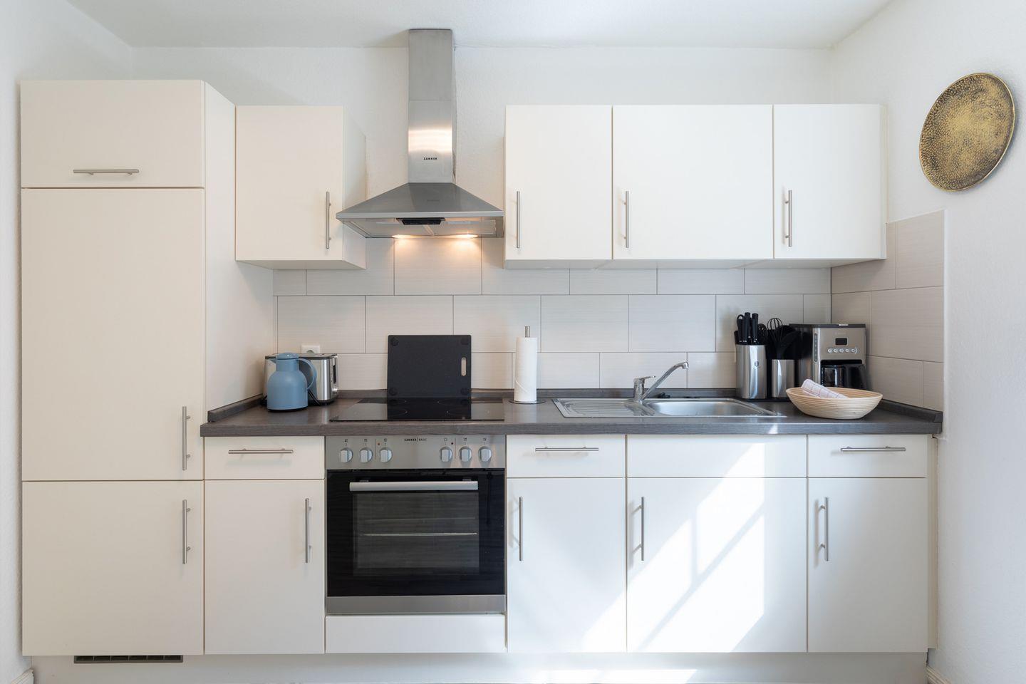 Die Ferienwohnung ist geschmackvoll eingerichtet und bietet mit zwei Schlafzimmern (1 Doppelbett 180 x 200 m und 2 Einzelbetten) Platz für bis zu 4 Personen. Die separate Küche verfügt über einen Herd mit Cerankochfeldern, einen Backofen, einen Kühlschrank, Filterkaffeemaschine (Filtergröße 4), Wasserkocher und Toaster.