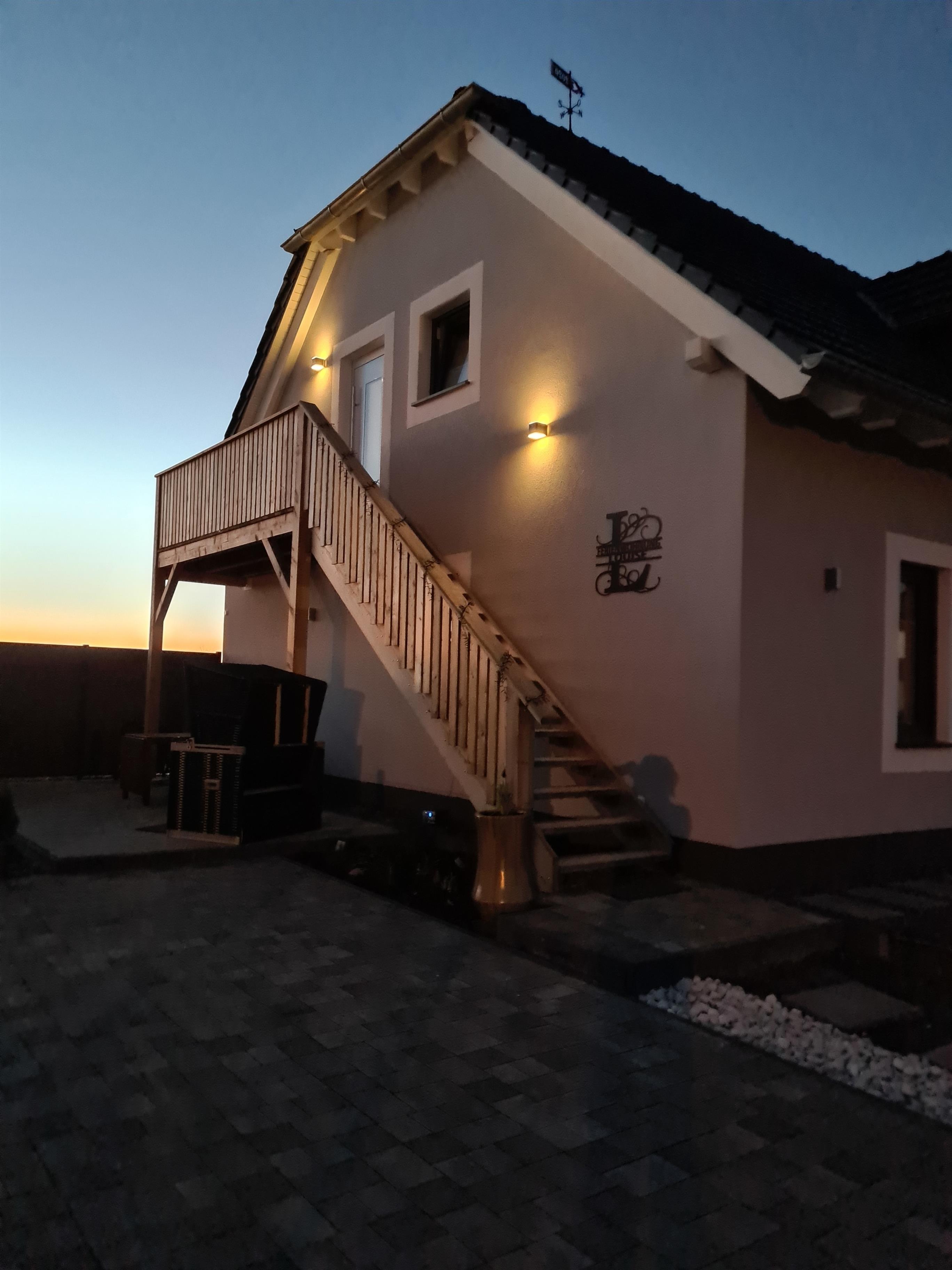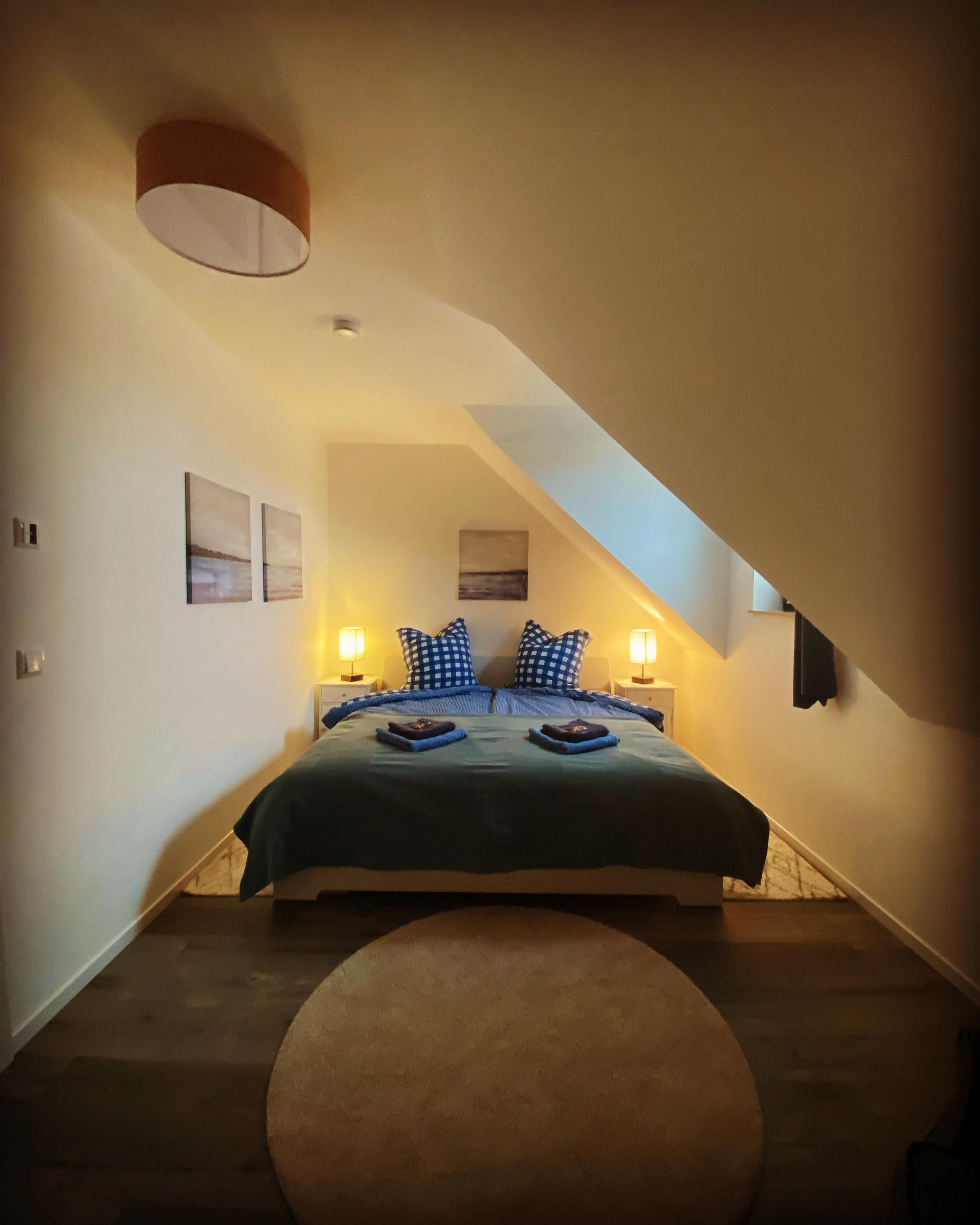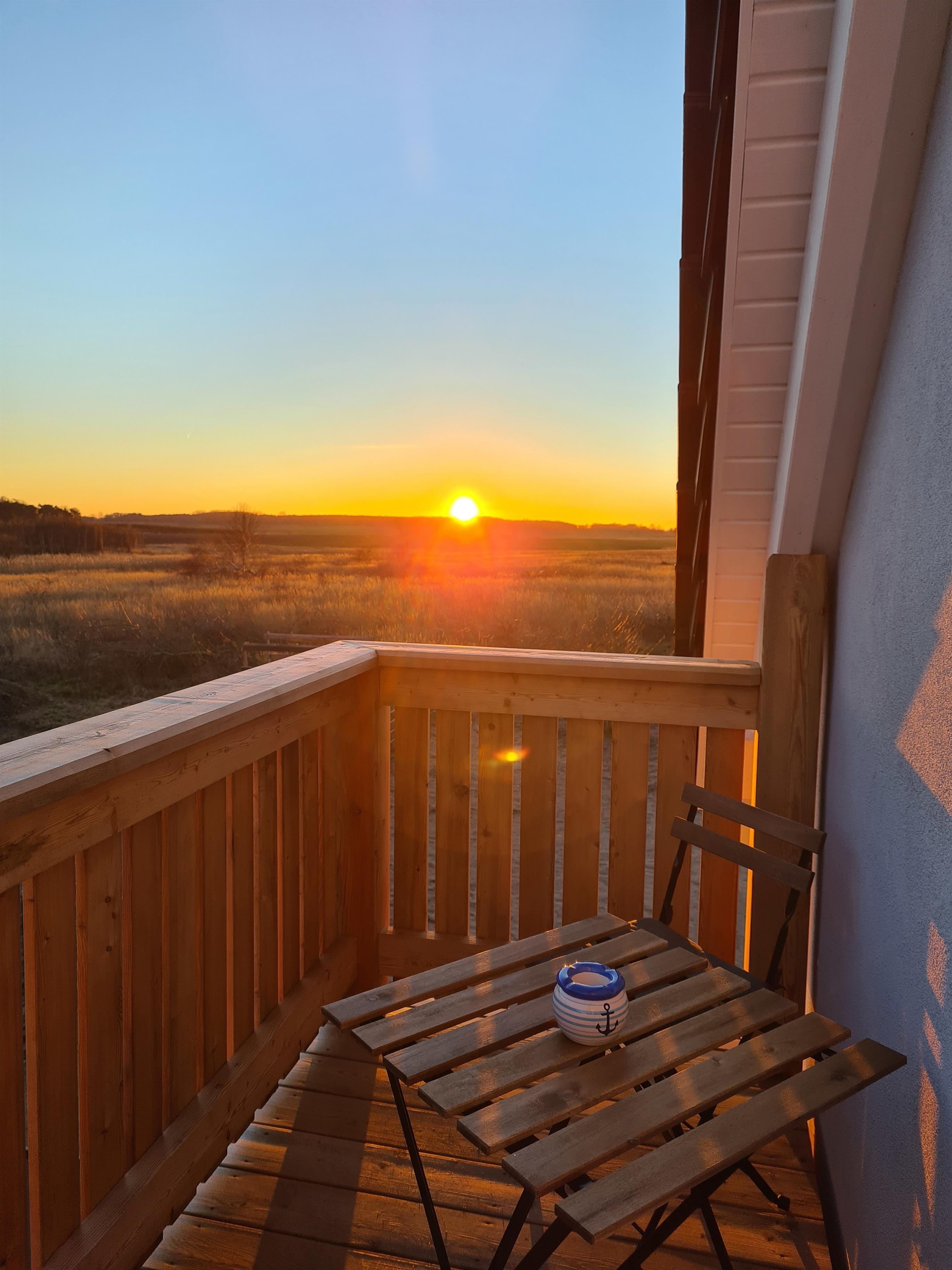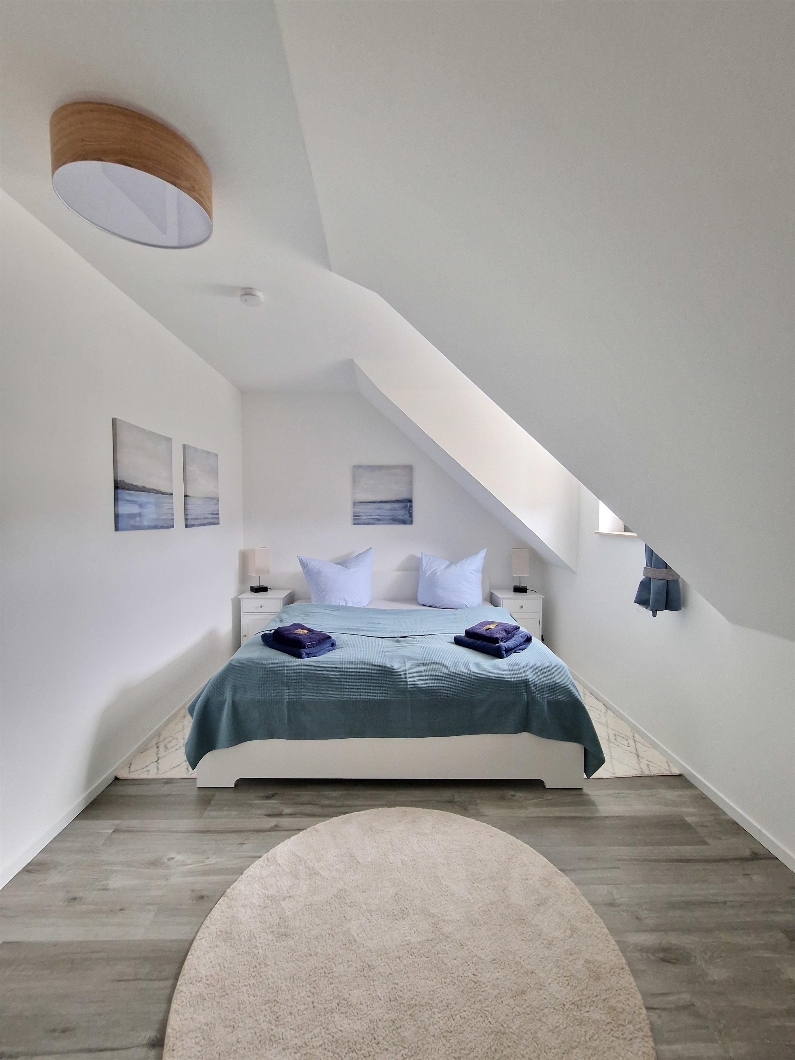 "Louise" befindet sich im Obergeschoss unseres 2022 fertiggestellten Ferienhauses und ist über die eigens angefertigte Massivholztreppe erreichbar. Hier befindet sich auch der Süd-Balkon mit Blick über die wunderschöne Boddenlandschaft.
