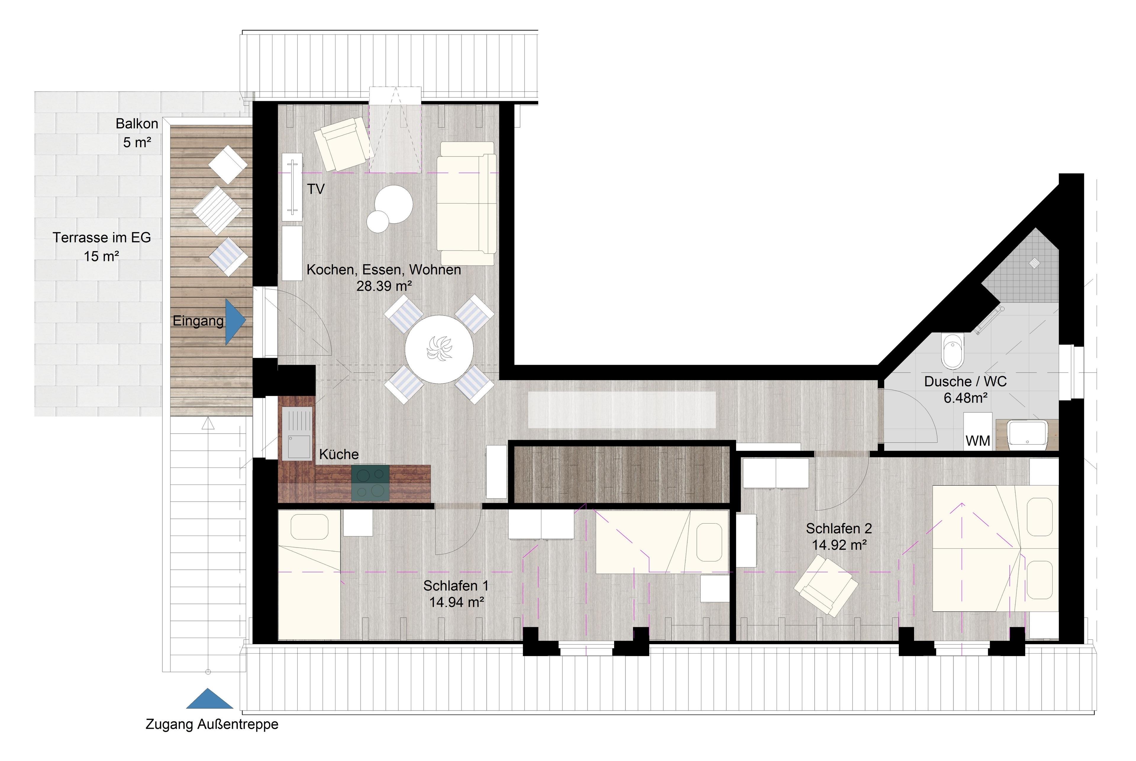 Von dem hellen großzügigen Wohnraum mit gemütlichen Essplatz und vollausgestatteter moderner Küche erreichen Sie die 2 Schlafzimmer (1x mit Doppelbett und 1x mit 2 Einzelbetten) und das helle stilvolle Bad mit geräumiger bodengleich gefliester Dusche.