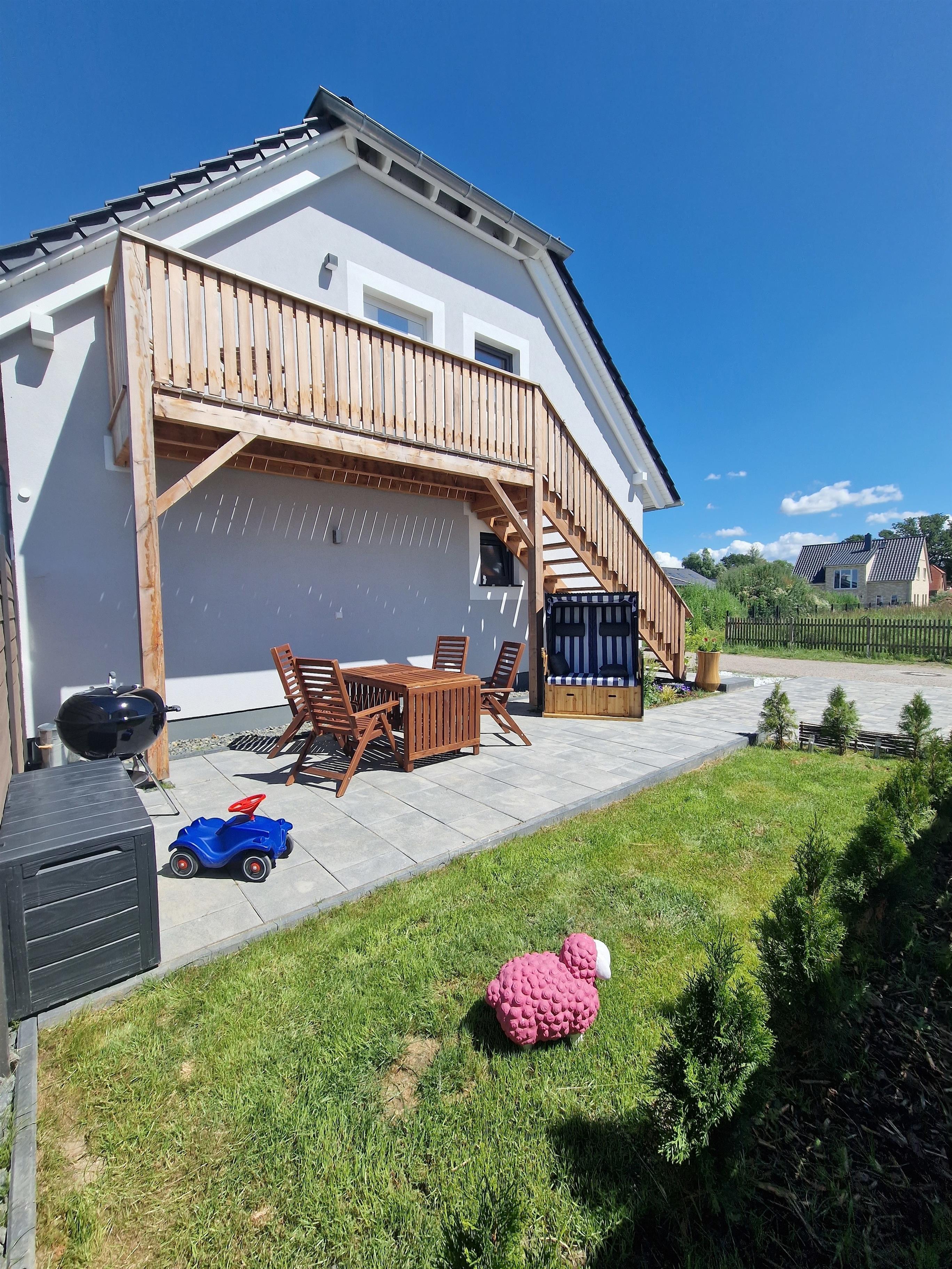 Im Außenbereich steht Ihnen ein eigener Parkplatz zur Verfügung. Eine großzügige Terrasse mit gepolsterten Gartenmöbeln, Strandkorb und großem Esstisch lädt zu einem gemütlichen Grillabend ein. Ein Grill steht Ihnen frei zur Verfügung.