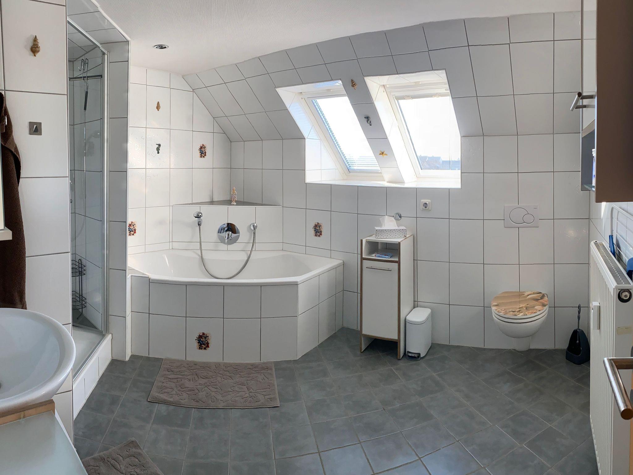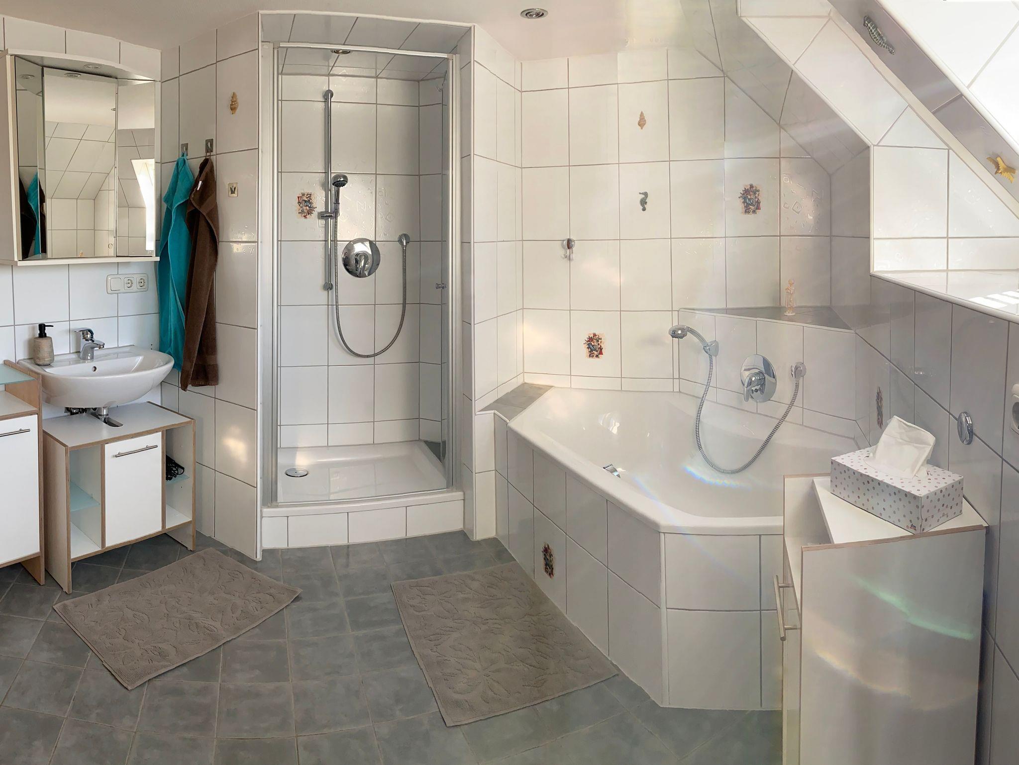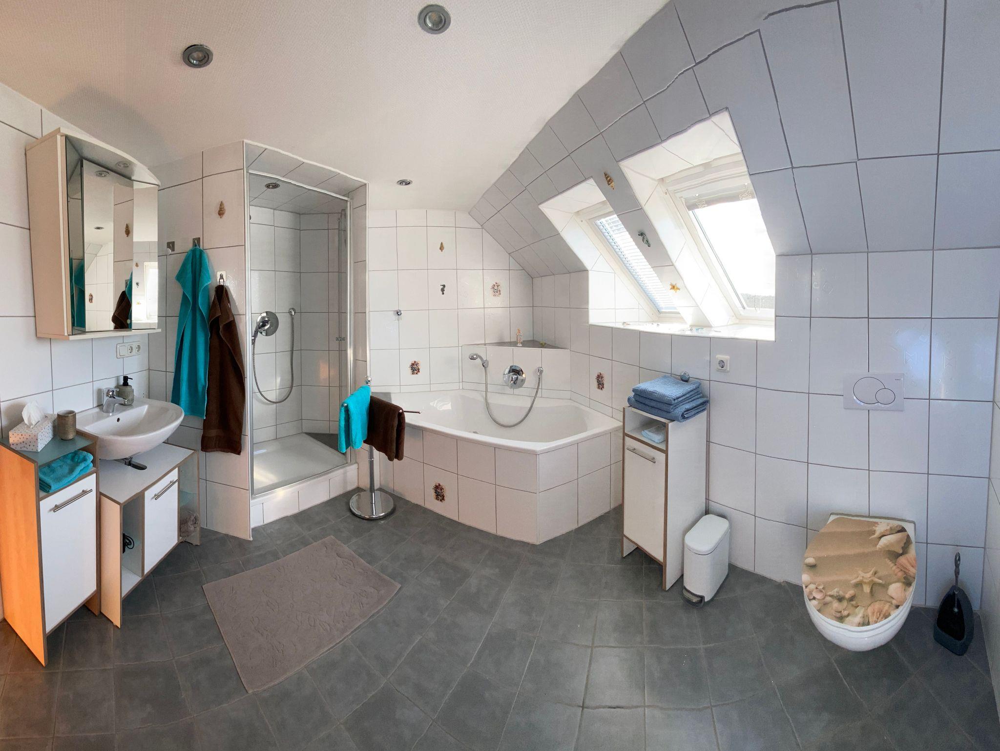 Das Bad umfasst WC, Dusche, Badewanne, Spiegelschrank und einen Kinder-Toilettensitz. Reinigungsutensilien und Staubsauger sind ebenfalls vorhanden.