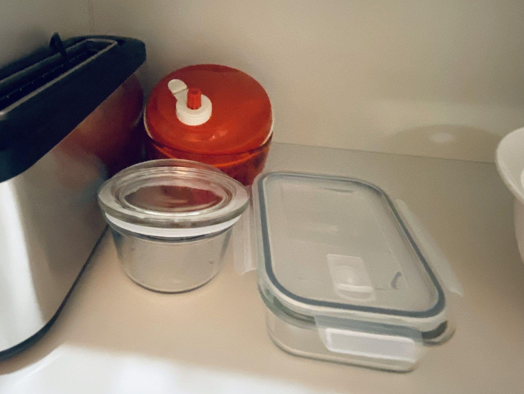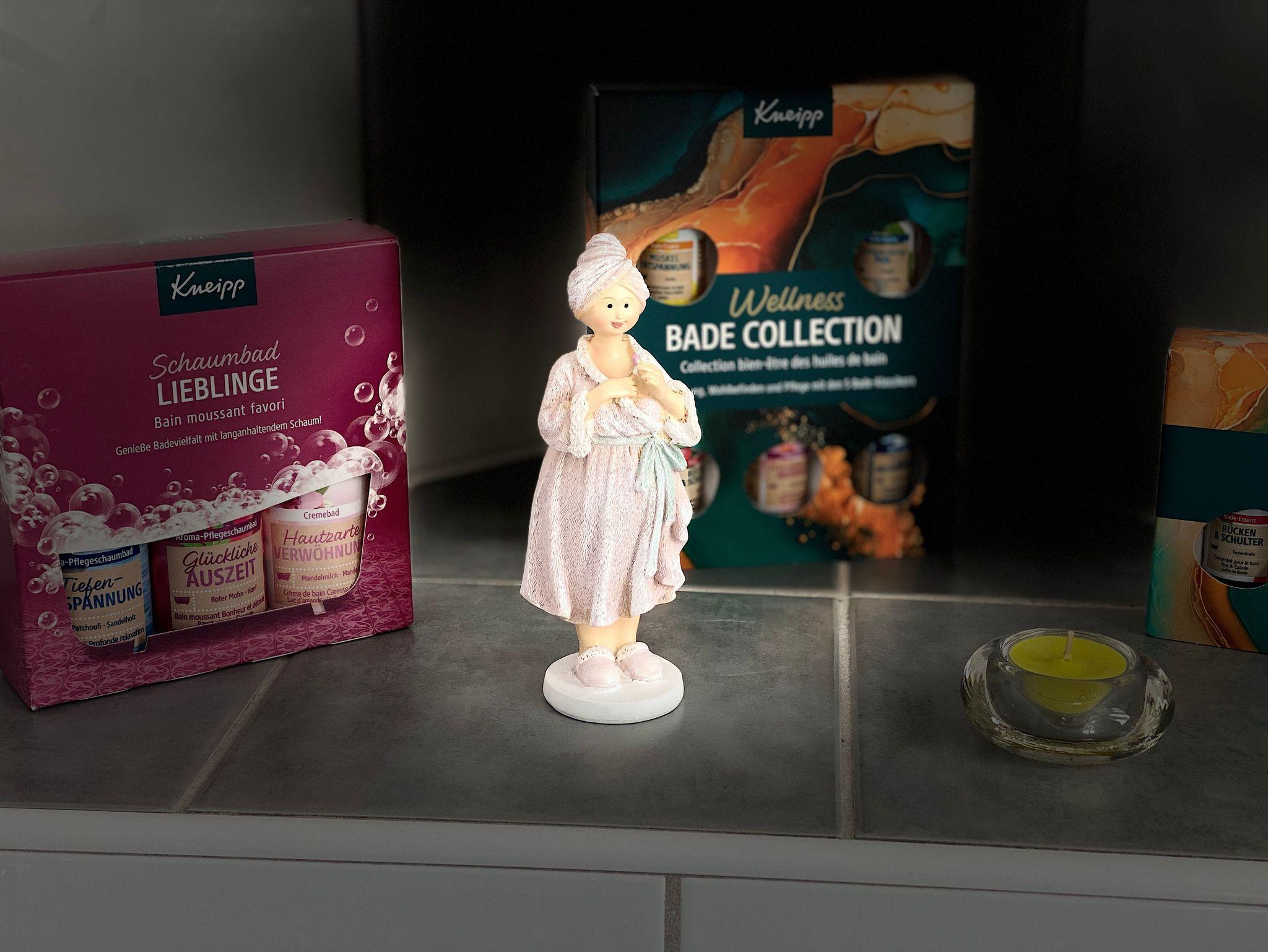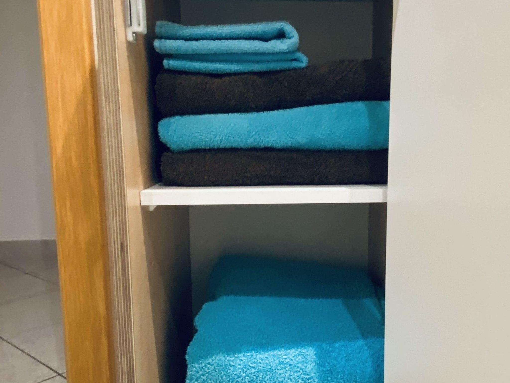 Das Bad umfasst WC, Dusche, Badewanne, Spiegelschrank und einen Kinder-Toilettensitz. Reinigungsutensilien und Staubsauger sind ebenfalls vorhanden.