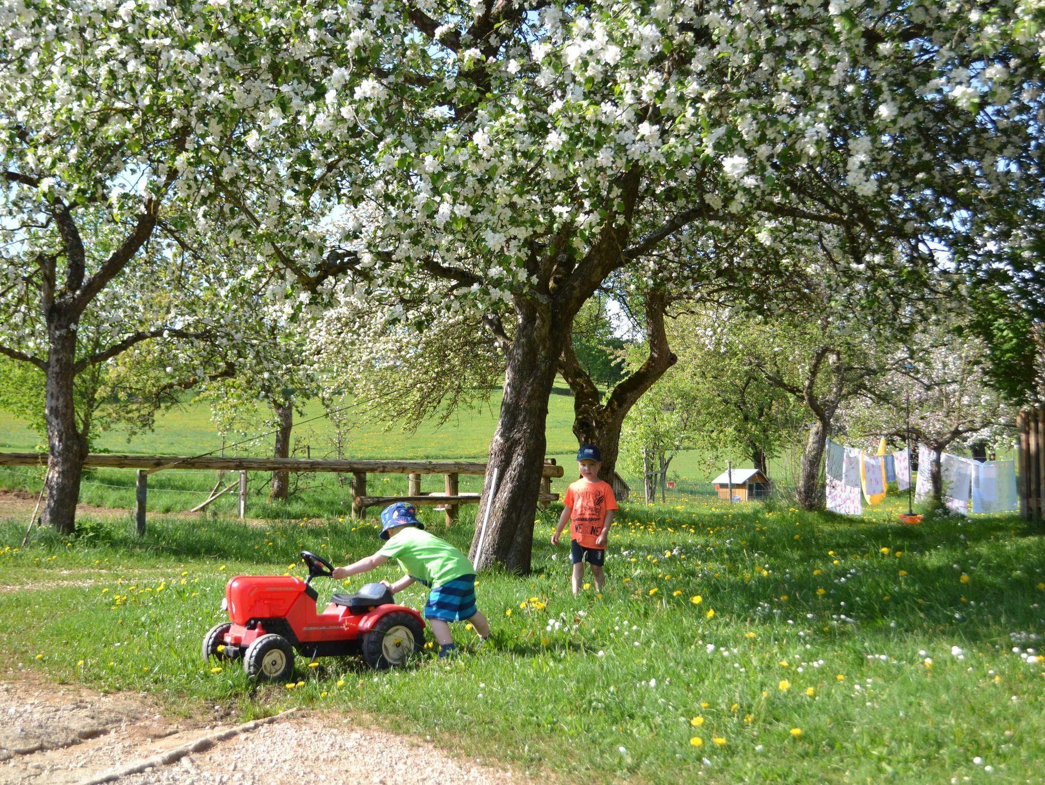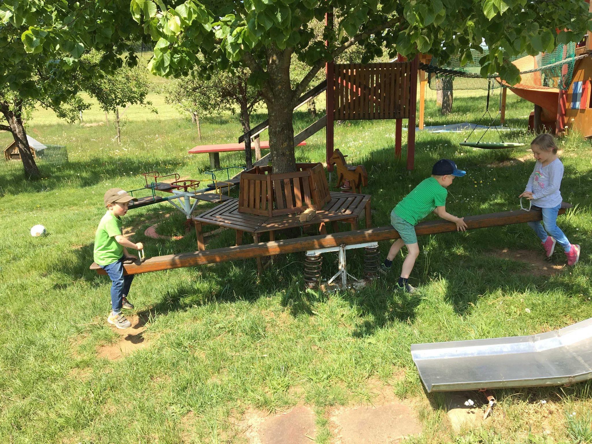 Die Kinder können sich auf dem großen Spielplatz und dem Hofgelände, des Ferienhofes Lochau austoben.