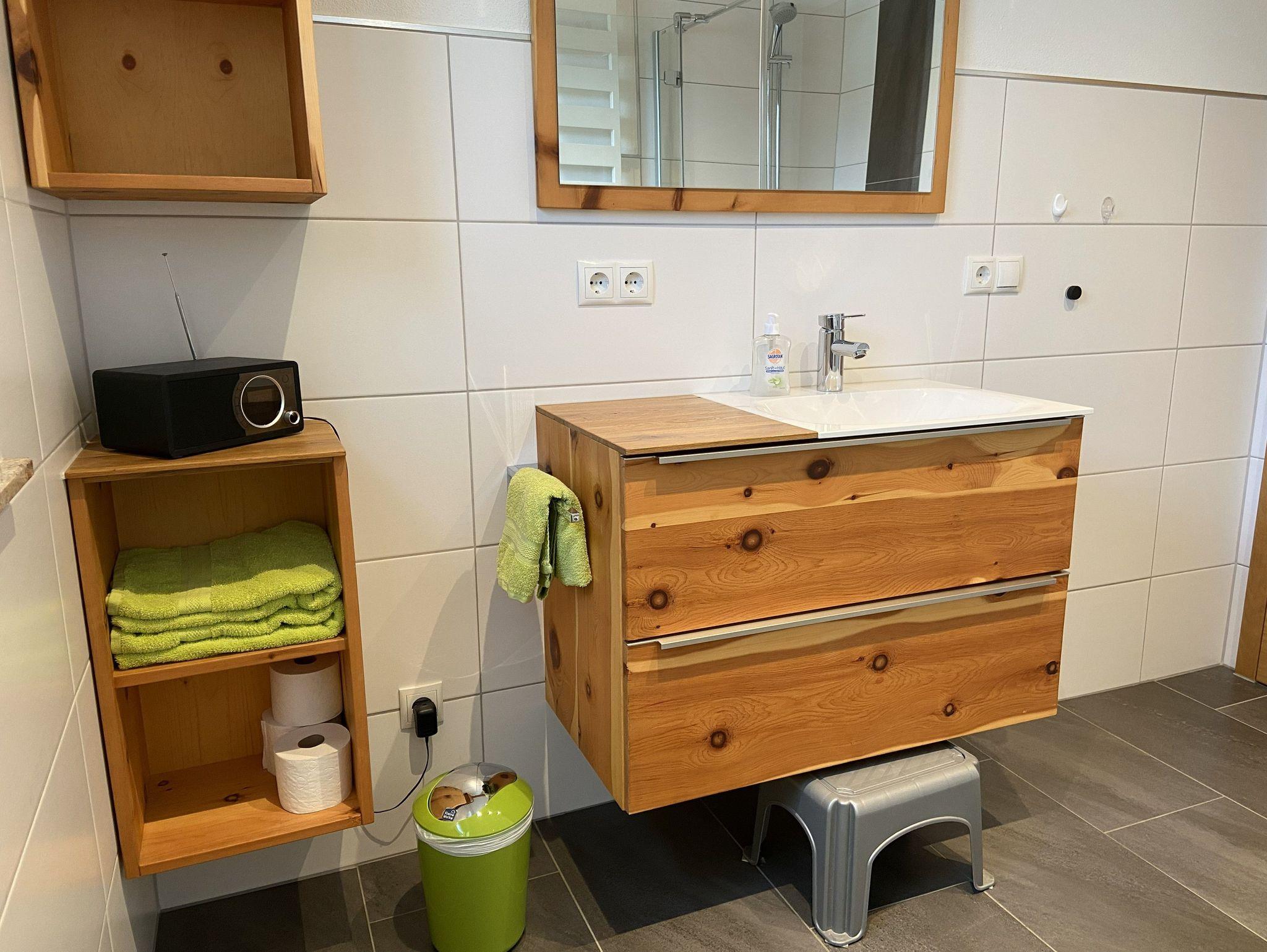 Das Bad ist mit DU/WC, Föhn, Handtuchtrockner und mit genügend Ablagemöglichkeiten eingerichtet.