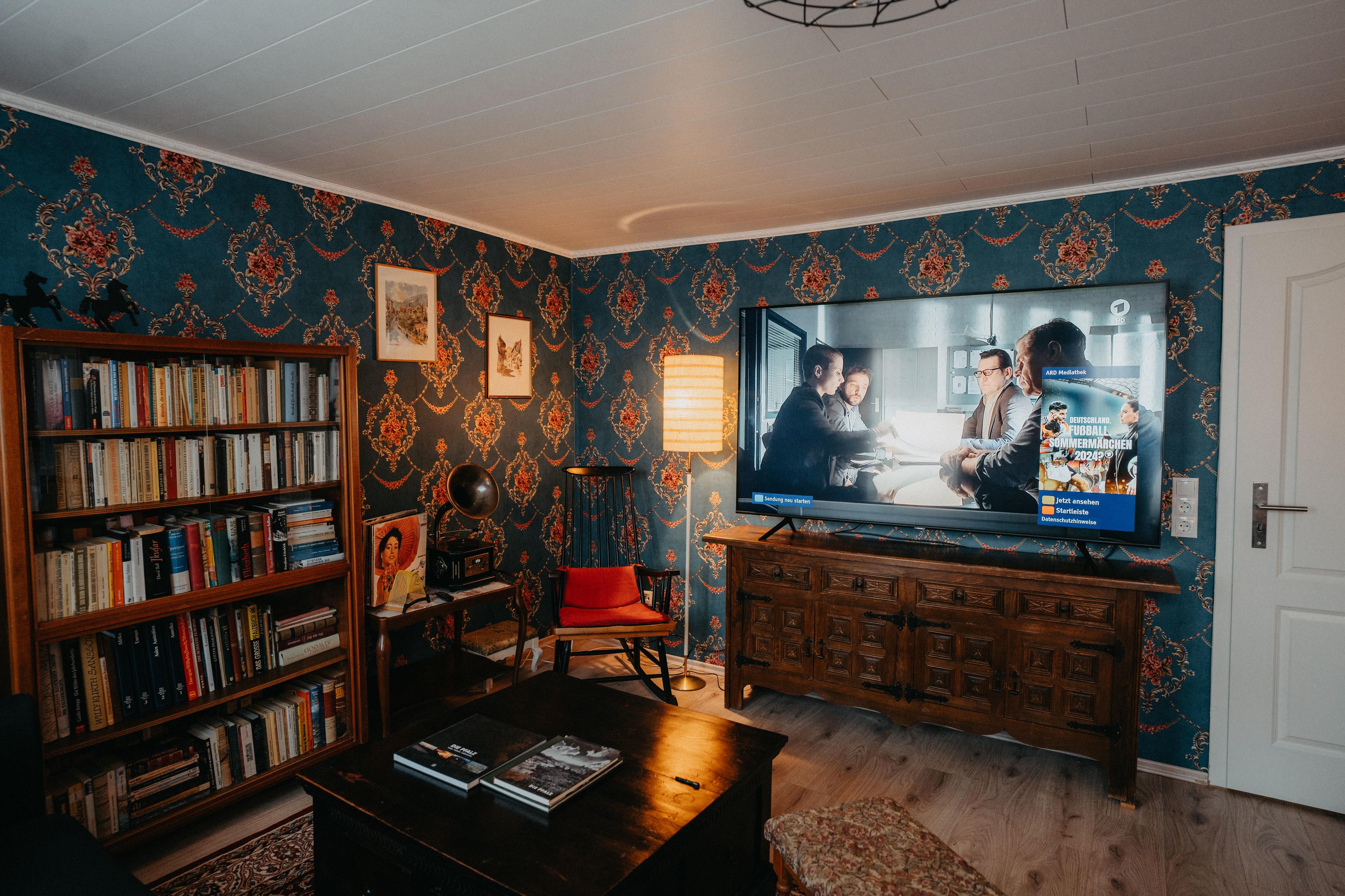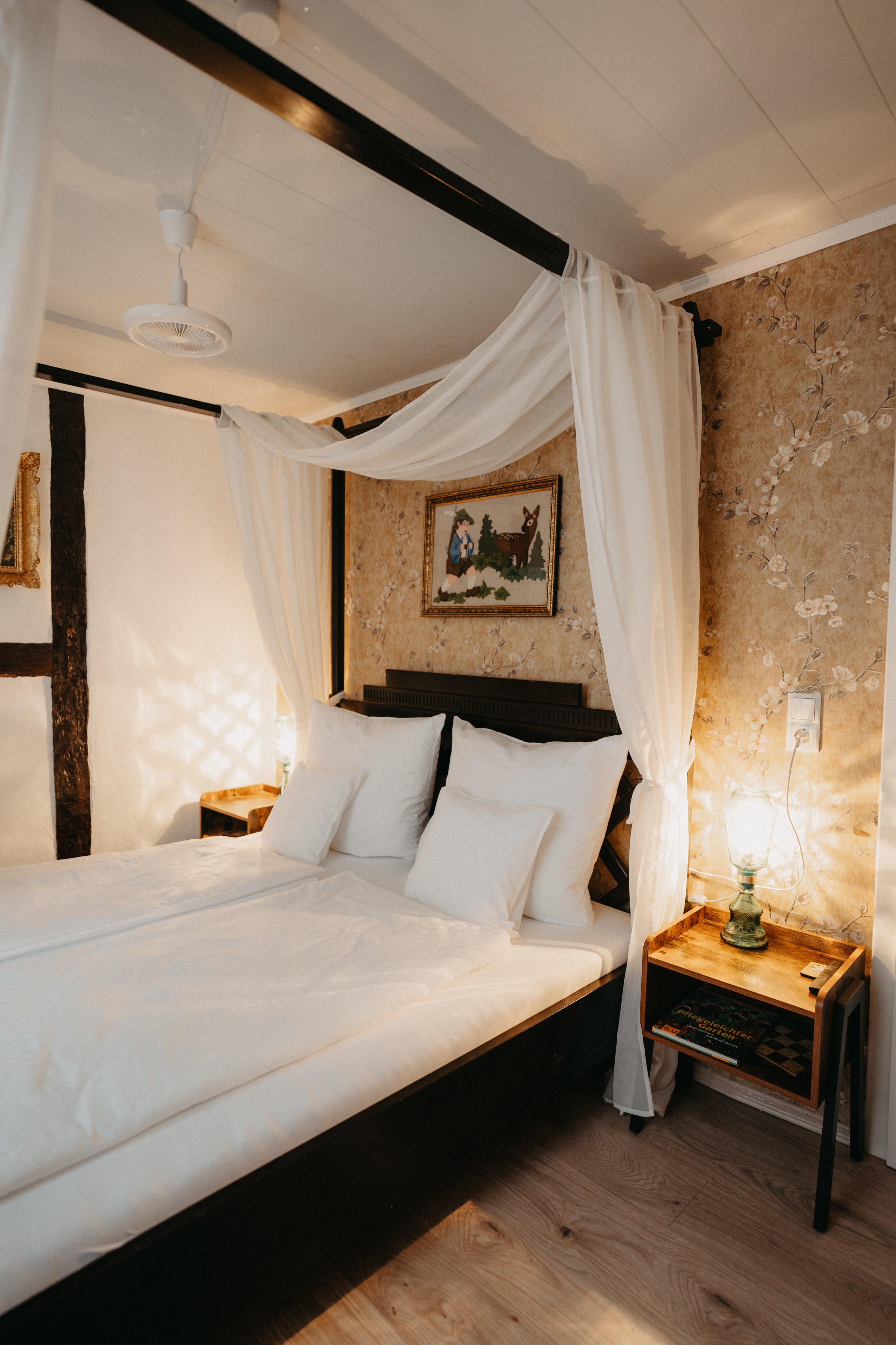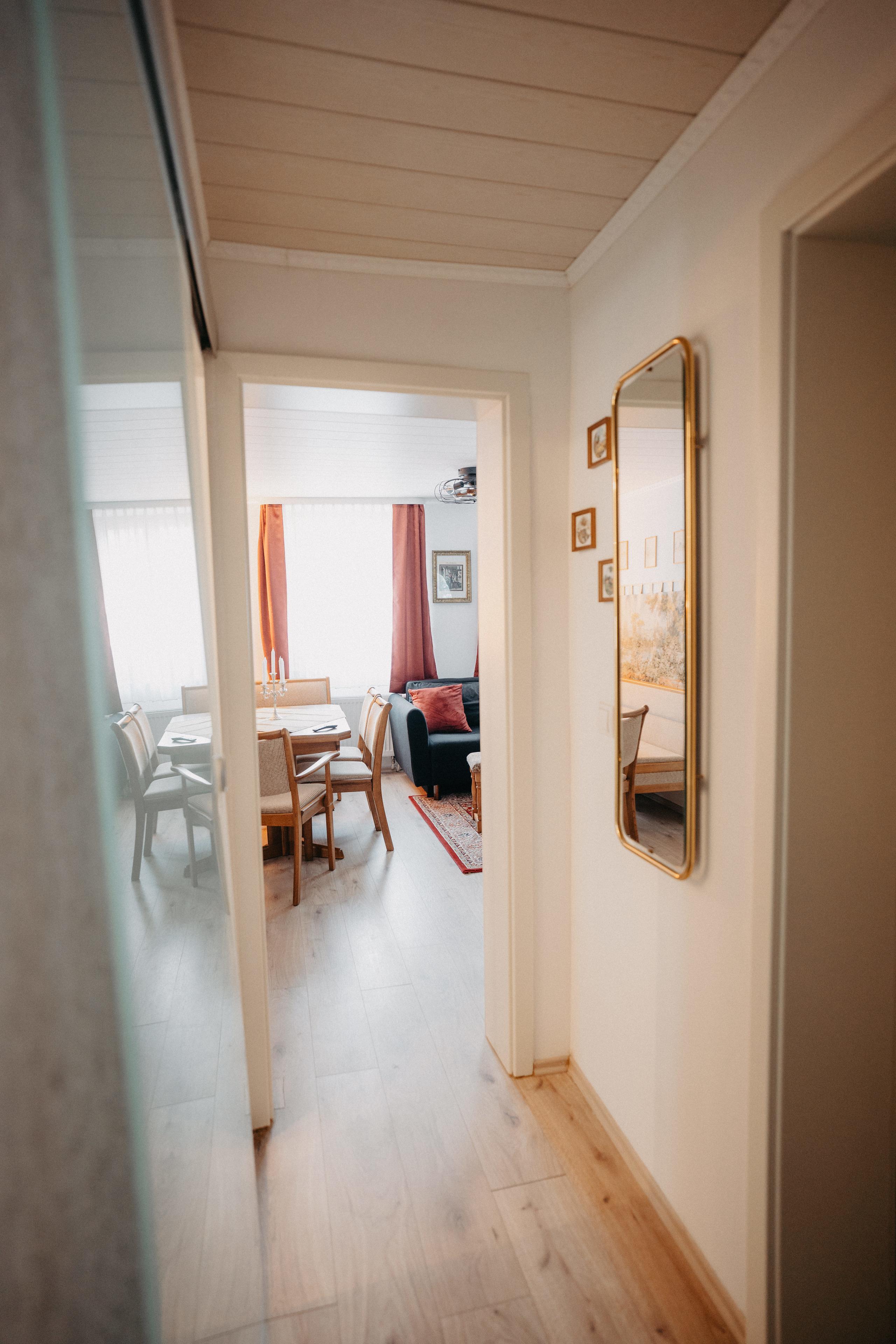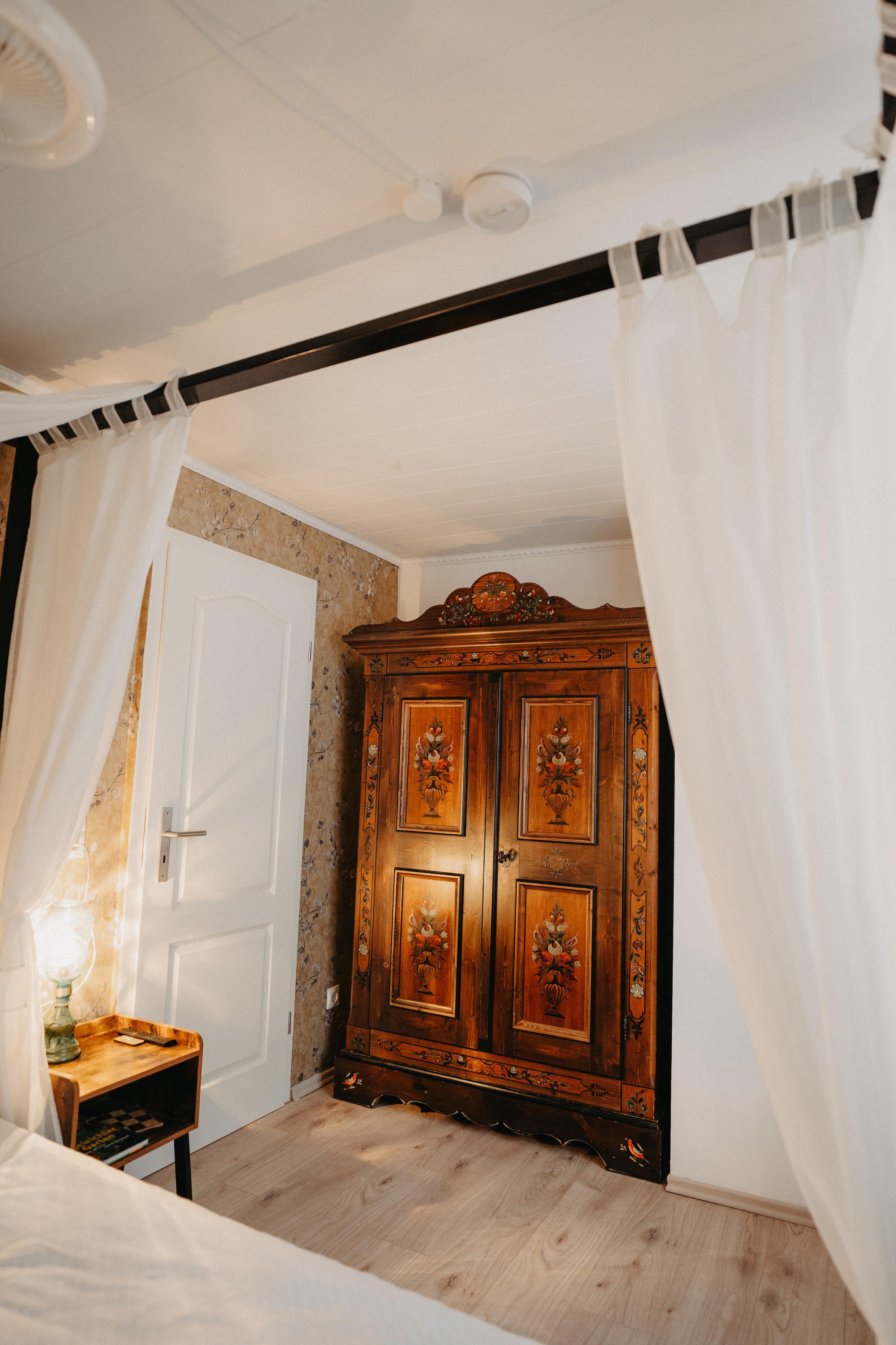 Im ersten Schlafzimmer mit Fenster zum Innenhof können sie königlich schlafen in einem majestätischen Himmelbett. Gegenüber befindet sich das Bad, modern mit begehbarer Dusche. Das Wohnzimmer mit gemütlicher Sitzecke, Bibliothek mit über 400 Bücher Schallplattenspieler, Gesellschaftsspielen und einem riesigen Fernseher mit Wii-Konsole lässt keine Langweile aufkommen. Vom Wohnzimmer kommt man gleich in das zweite Schlafzimmer mit zwei Einzelbetten. Eine Mischung aus altem Bauernschrank und rustikalen Betten wird der Raum in Gold und Grün gehalten.