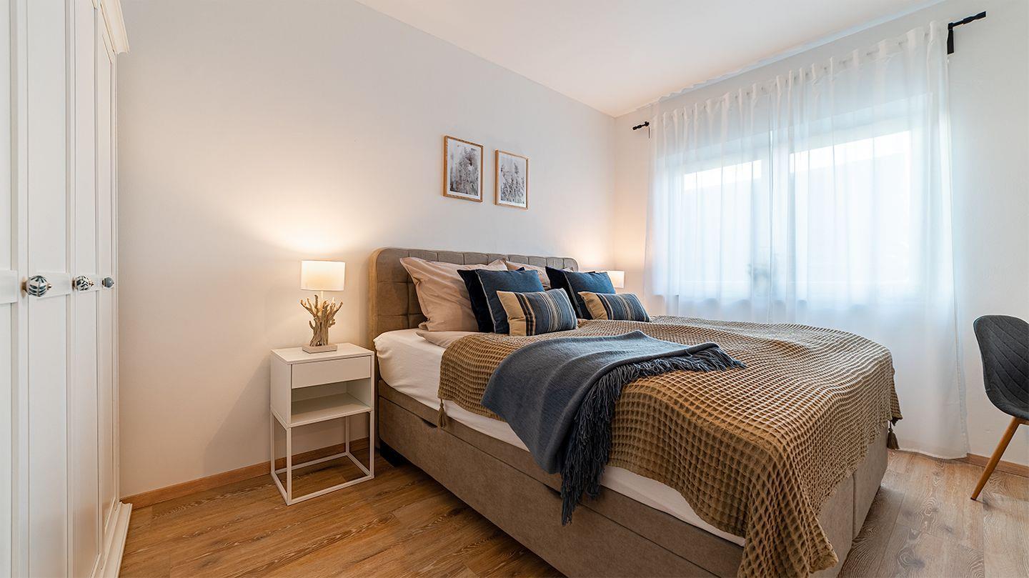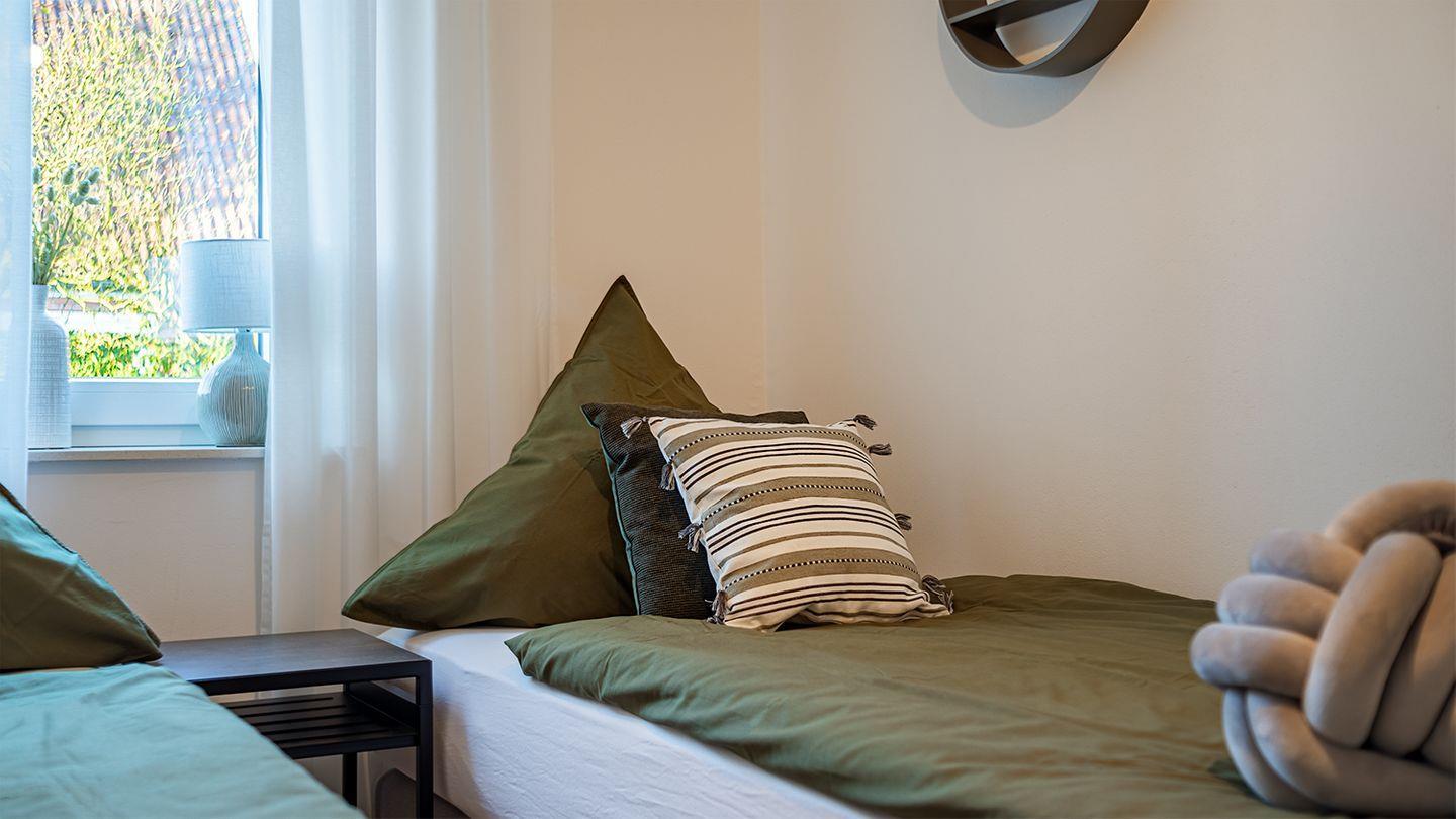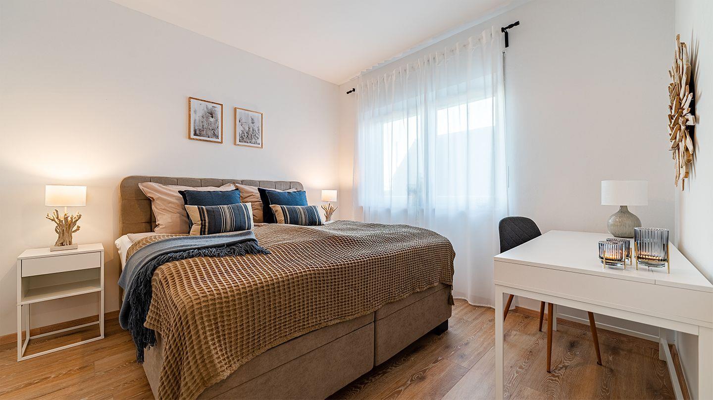 Große bodentiefen Fenster ermöglichen einen schönen Blick vom Esstisch in den Garten. Zwei hochwertige mit Boxspringbetten ausgestattete Schlafzimmer bieten Ihnen einen hohen Komfort (Doppelbett 180 x 200 cm). Im zweiten Schlafzimmer steht es Ihnen frei beide Boxspringbetten (je 90 x 200 cm) als Einzelbetten oder Doppelbett zu nutzen. Alle Fenster im Haus lassen sich durch Jalousien abdunkeln. In allen Wohnräumen ist ein hochwertiger Eichenboden sowie Fußbodenheizung verlegt.
