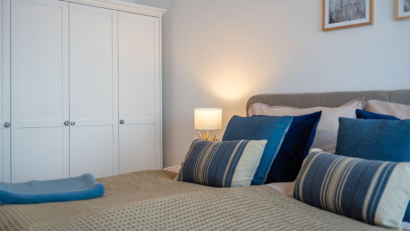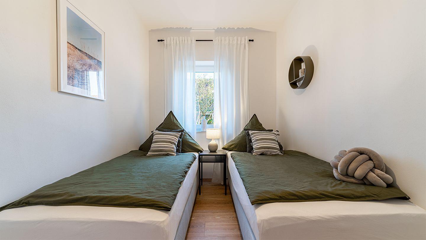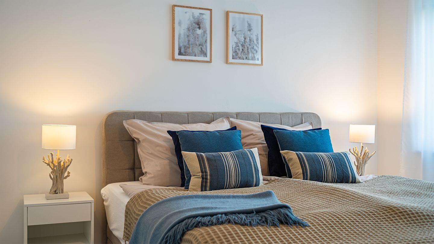 Große bodentiefen Fenster ermöglichen einen schönen Blick vom Esstisch in den Garten. Zwei hochwertige mit Boxspringbetten ausgestattete Schlafzimmer bieten Ihnen einen hohen Komfort (Doppelbett 180 x 200 cm). Im zweiten Schlafzimmer steht es Ihnen frei beide Boxspringbetten (je 90 x 200 cm) als Einzelbetten oder Doppelbett zu nutzen. Alle Fenster im Haus lassen sich durch Jalousien abdunkeln. In allen Wohnräumen ist ein hochwertiger Eichenboden sowie Fußbodenheizung verlegt.
