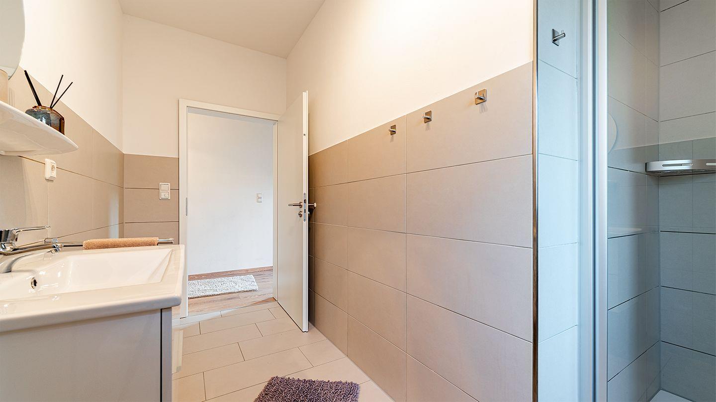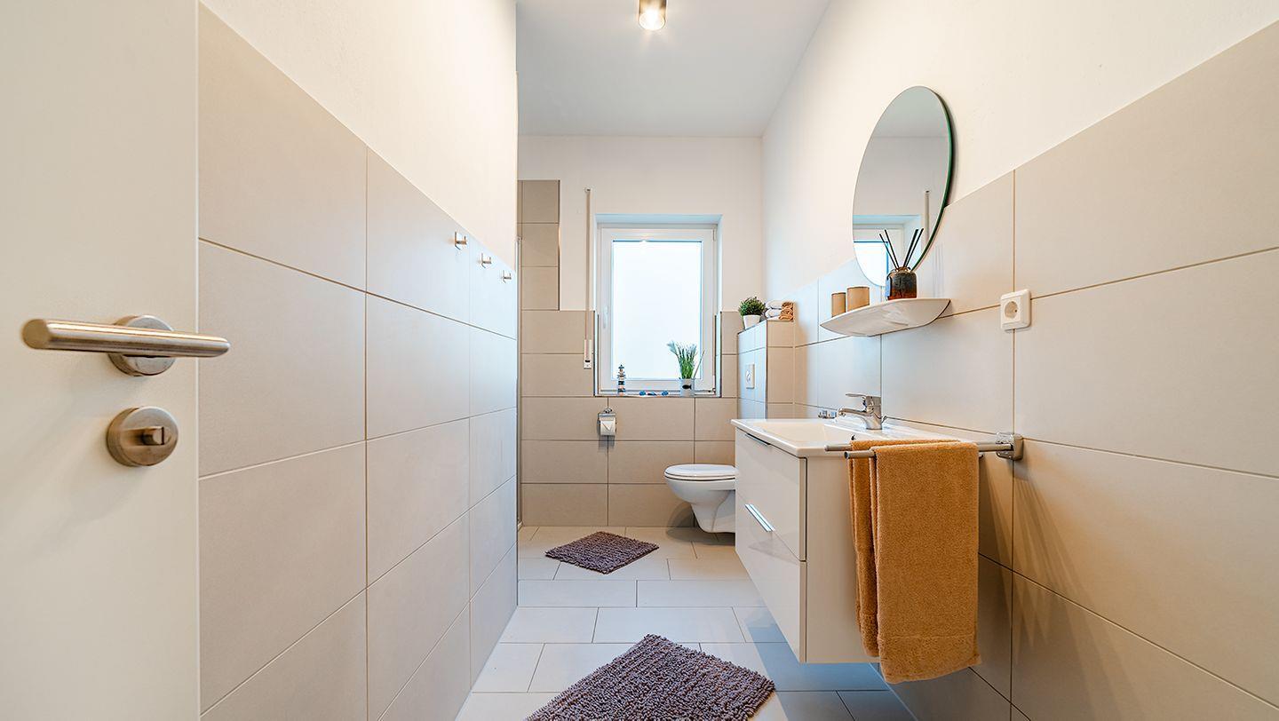 Ebenfalls im Erdgeschoss befindet sich ein großzügiges Tageslichtbad mit einer großen ebenerdigen Dusche sowie ein weiteres helles Gästebad. Im Hauswirtschaftsraum steht für Sie kostenlos eine Waschmaschine sowie ein Trockner zur Nutzung bereit sowie ein Bügelbrett und Bügeleisen.