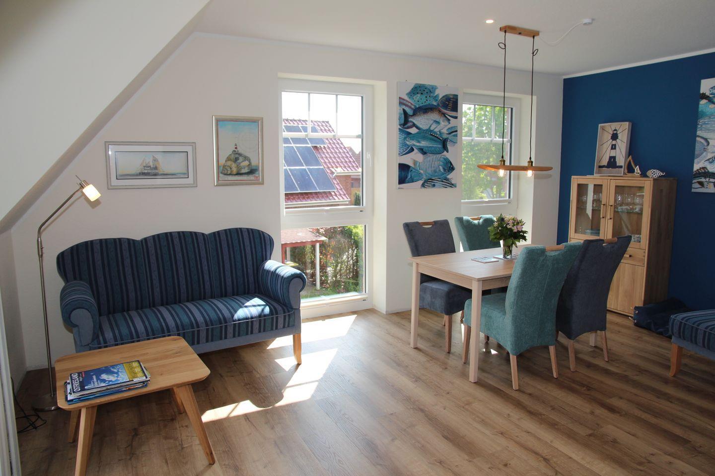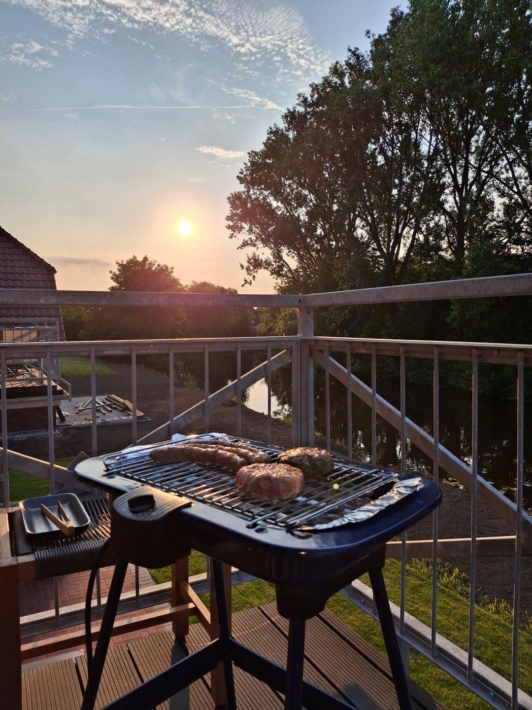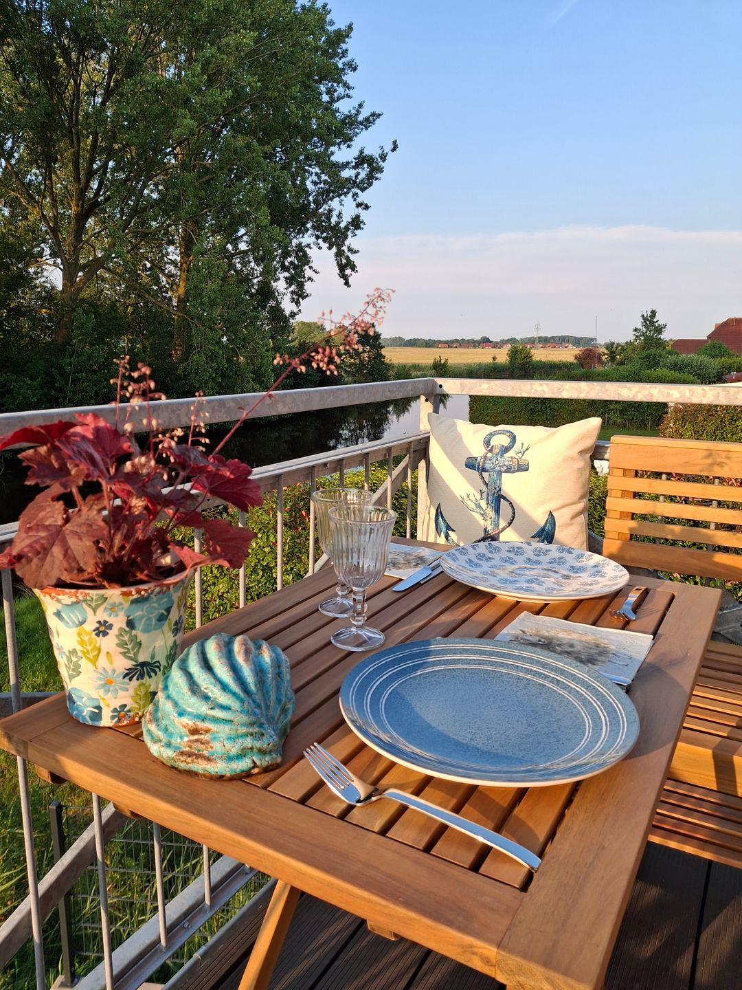 Diese schöne ca. 80qm große Wohnung liegt in Eilsum (5km bis Greetsiel) direkt am Kanal und überzeugt mit einem wunderschönen Blick über Wasser und Wiesen. Im Obergeschoss finden Sie den großzügigen Wohnbereich mit Essbereich, Kaminofen, Sofa, Sessel und TV, sowie dem Durchgang direkt auf den möblierten Balkon mit traumhaftem Wasserblick. Für den Balkon ist auch ein Elektrogrill vorhanden. Direkt angrenzend befindet sich die voll ausgestattete große Küche, die u.a. Cerankochfeld, Kühlschrank mit Gefrierfach, Mikrowelle, Spülmaschine, Filterkaffeemaschine, Wasserkocher, Toaster und einen Handmixer zu bieten hat. Auf gleicher Etage befindet sich auch ein Schlafzimmer mit Doppelbett (einzelne Matratzen), Kleiderschrank und Kommode, sowie das schöne Badezimmer mit bodentiefer Dusche, großem Dachflächenfenster, Waschmaschine, WC, Waschbecken und Fön. Im Abstellraum sind Staubsauger, Wäscheständer und weitere Reinigungsutensilien vorhanden.