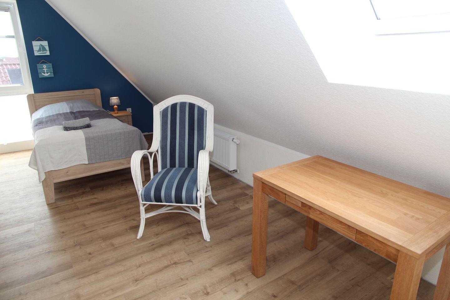 Im ausgebauten Dachgeschoss finden Sie eine schöne Galerie mit zwei Einzelbetten (1,00m x 2,00m Matratzen), Kommode, Sessel und einem Schreibtisch. Auch von hier haben Sie einen tollen Blick über den Kanal und die dahinterliegenden Felder!
