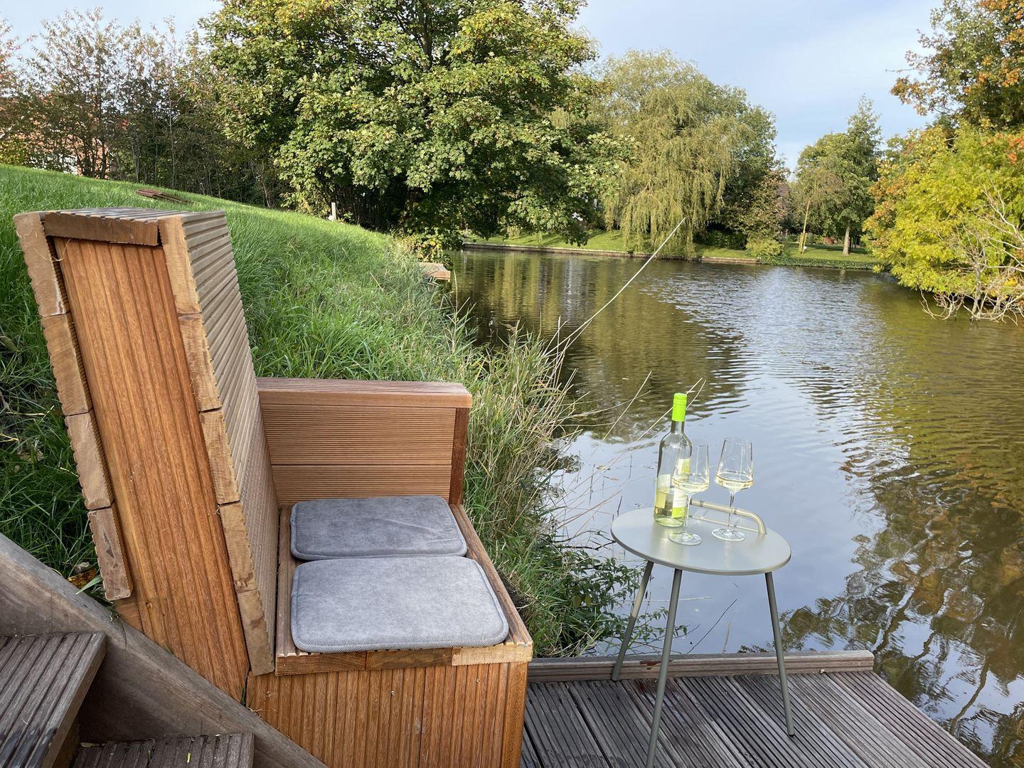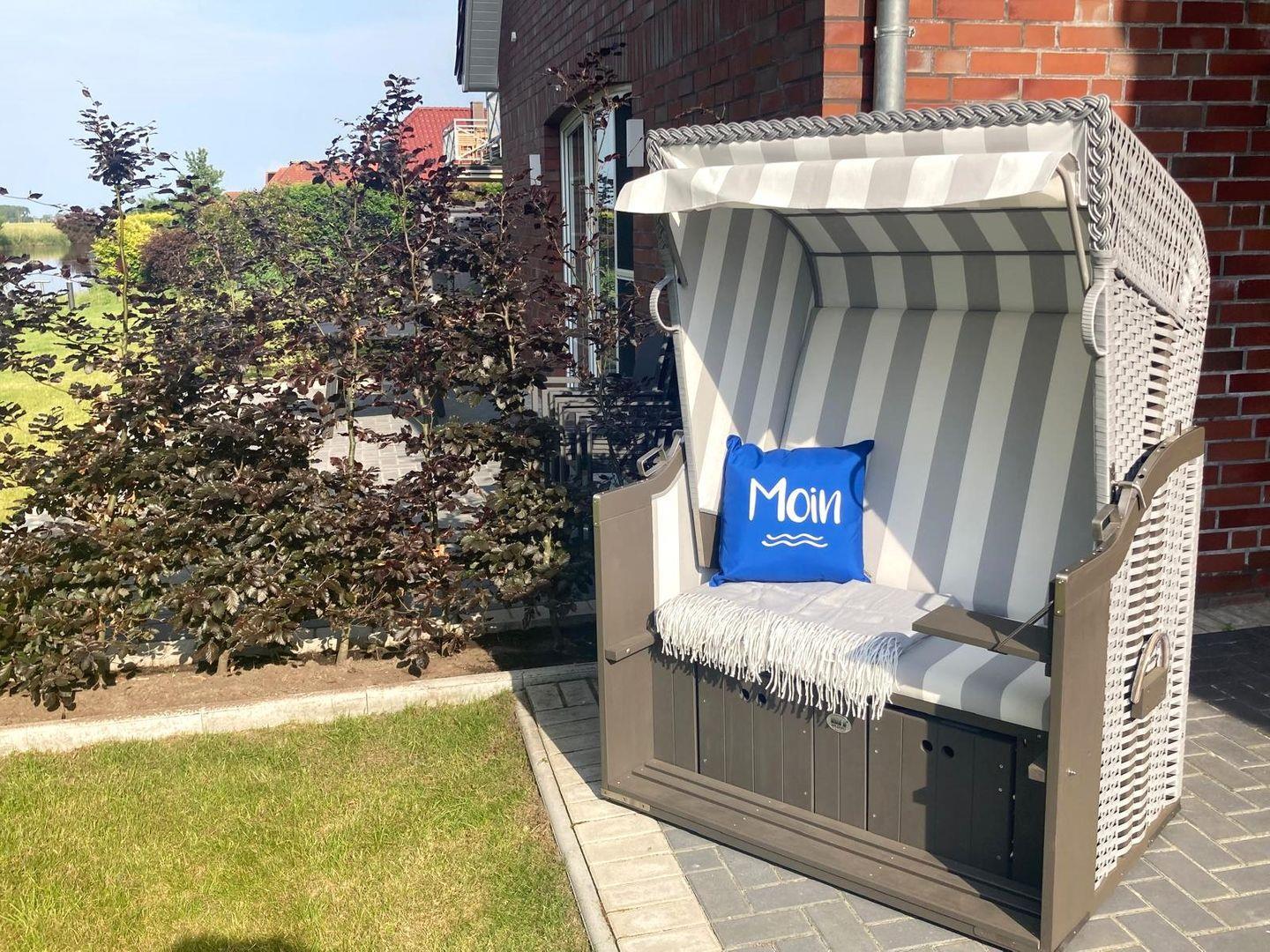 Genießen Sie im gemütlichen, privaten Strandkorb den herrlichen Blick auf das Tief und lauschen Sie dem Rauschen des Windes in den Bäumen.