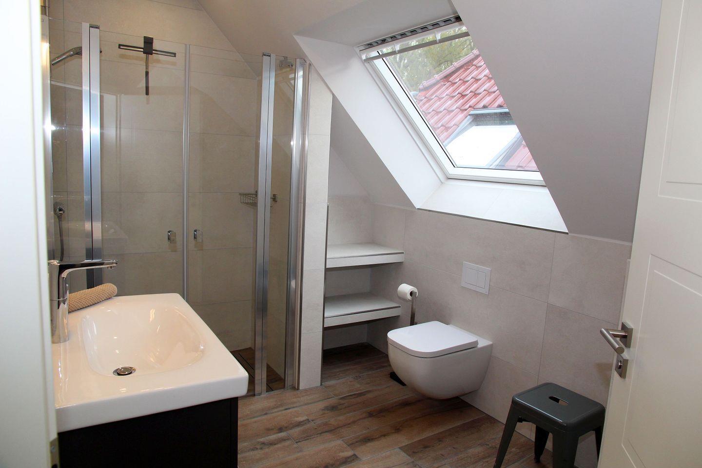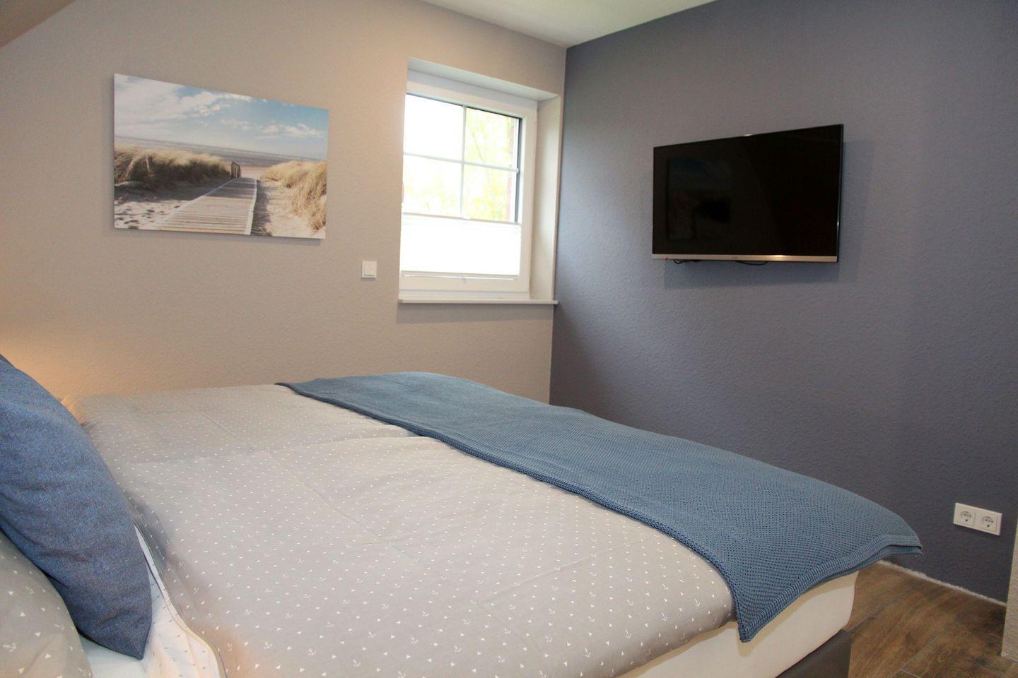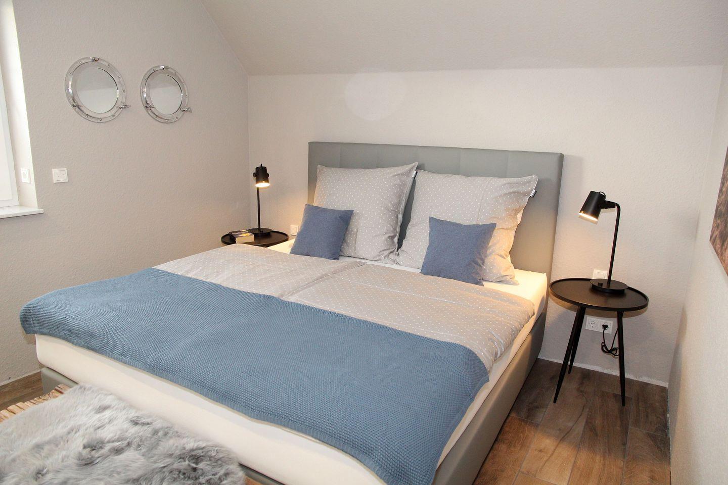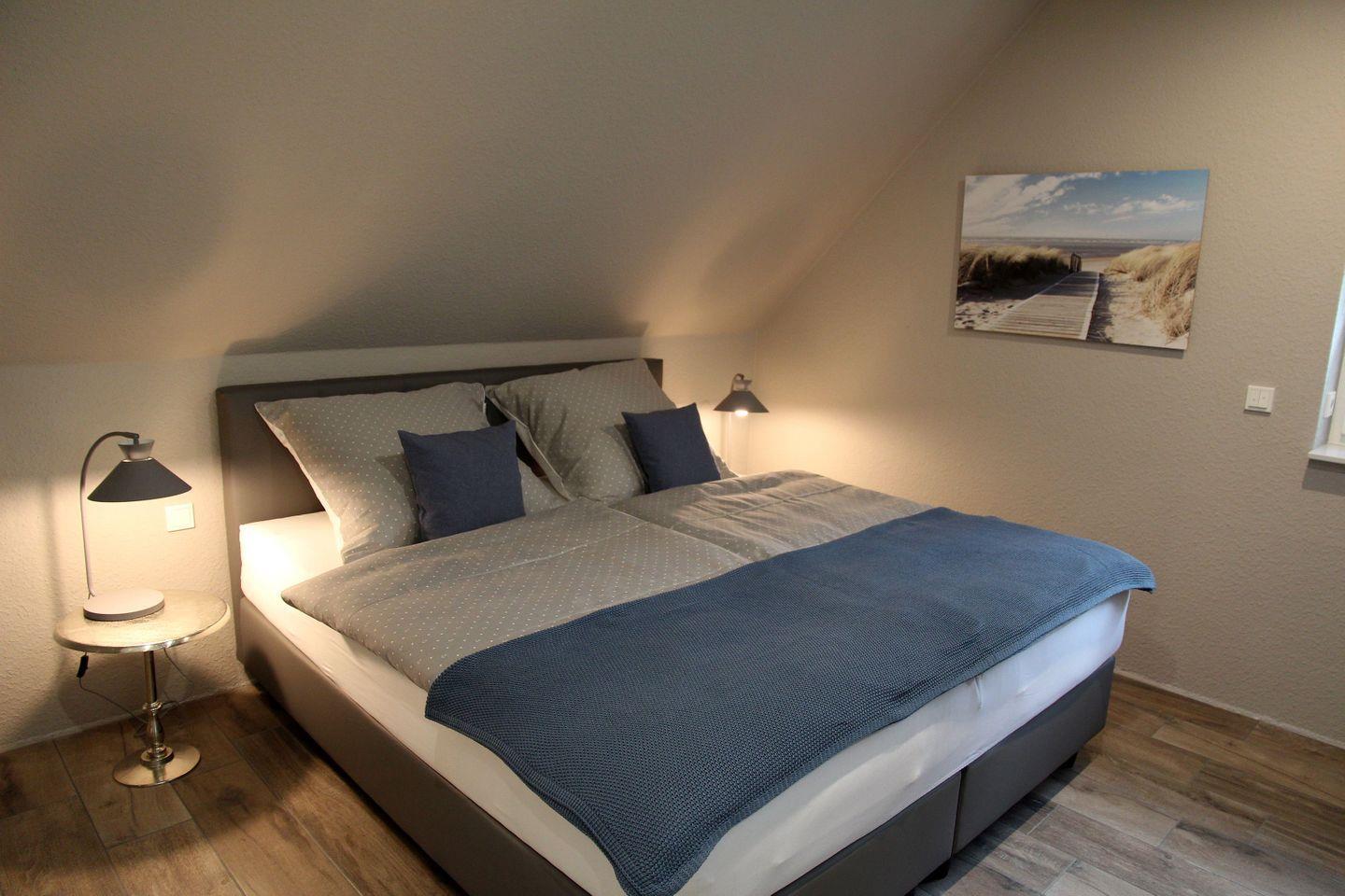 Im Obergeschoss befinden sich die beiden weiteren Schlafräume, die jeweils über 1,80 m Boxspring-Doppelbetten (einzelne Matratzen), Einbauschränke und Smart-TV verfügen. Ein weiteres helles Bad mit Dachflächenfenster, ebenerdiger Dusche, Waschtisch, WC und Fön steht hier zur Verfügung. Waschtrockner, Wäscheständer, Bügelbrett und Bügeleisen sowie Staubsauger und weitere Reinigungsutensilien, finden Sie bei Bedarf im Heizungsraum.