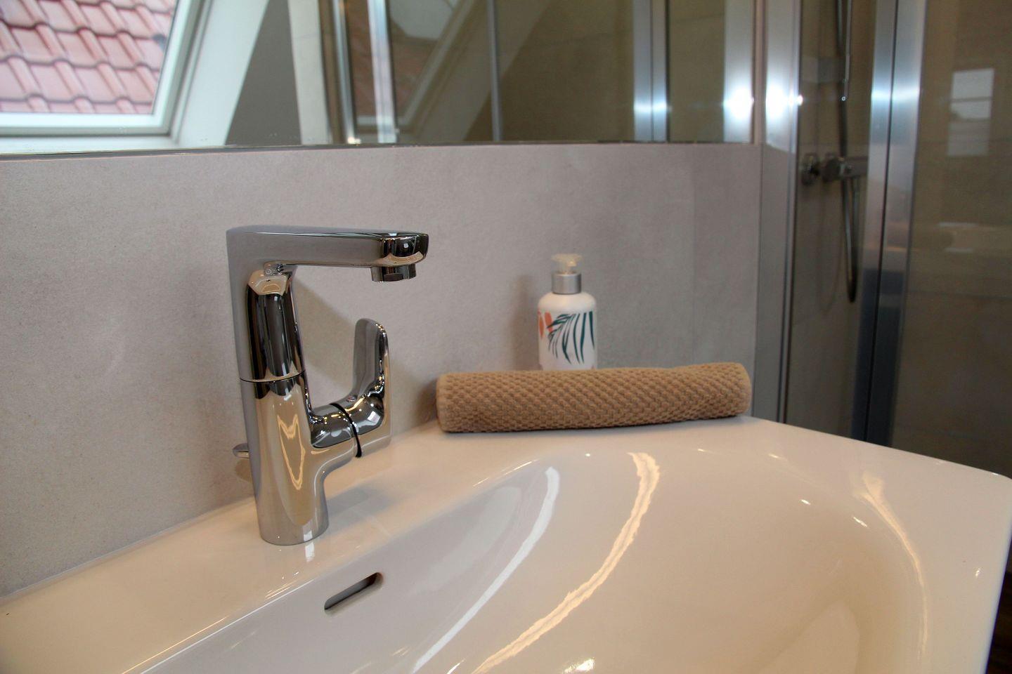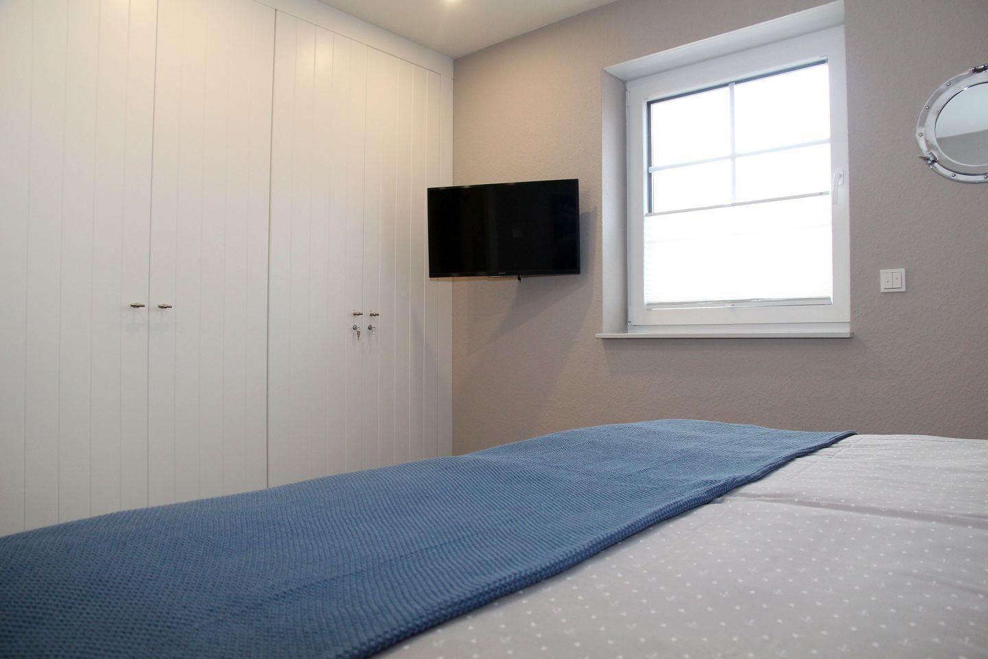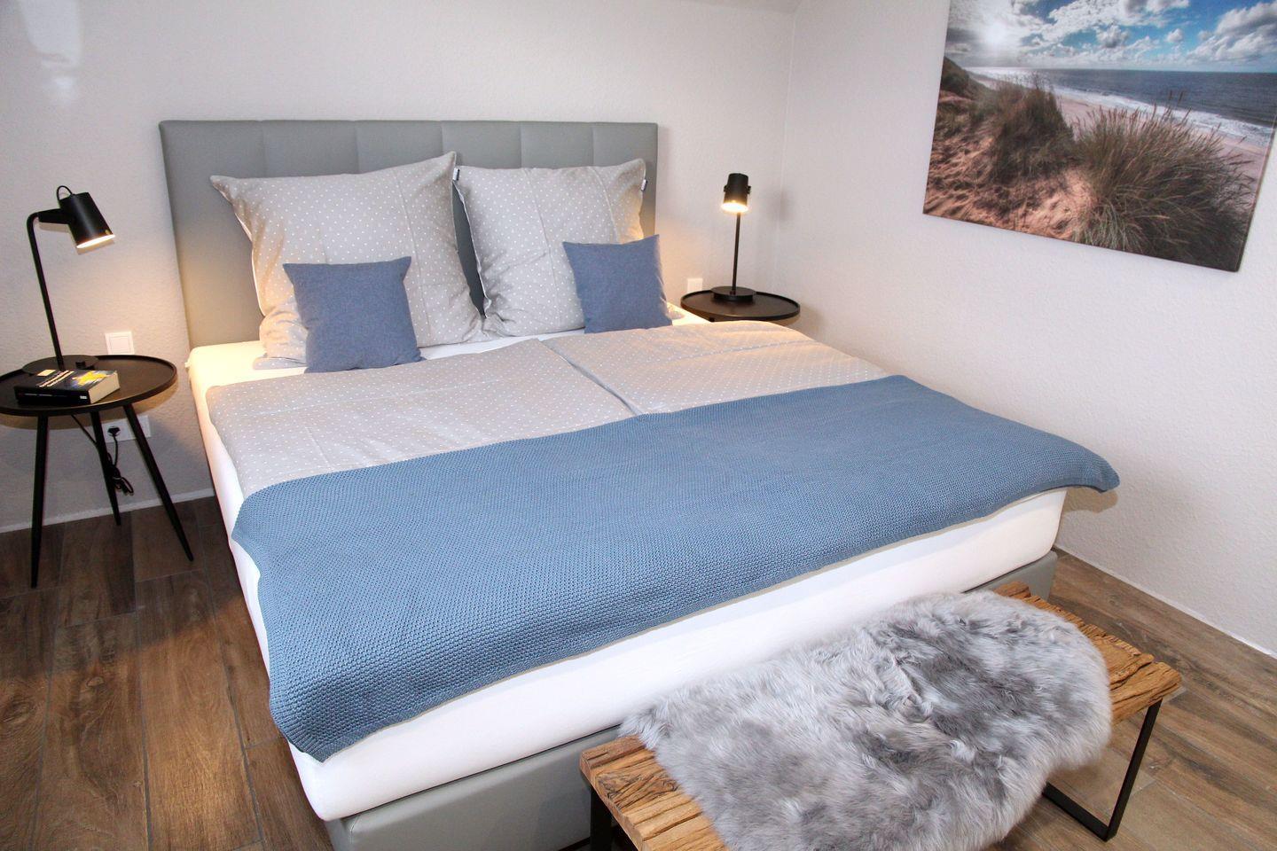 Im Obergeschoss befinden sich die beiden weiteren Schlafräume, die jeweils über 1,80 m Boxspring-Doppelbetten (einzelne Matratzen), Einbauschränke und Smart-TV verfügen. Ein weiteres helles Bad mit Dachflächenfenster, ebenerdiger Dusche, Waschtisch, WC und Fön steht hier zur Verfügung. Waschtrockner, Wäscheständer, Bügelbrett und Bügeleisen sowie Staubsauger und weitere Reinigungsutensilien, finden Sie bei Bedarf im Heizungsraum.