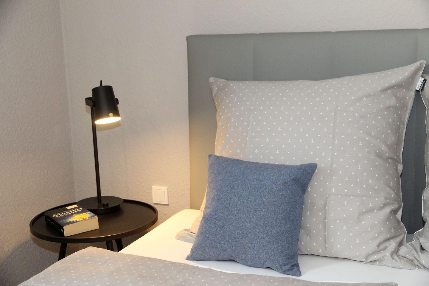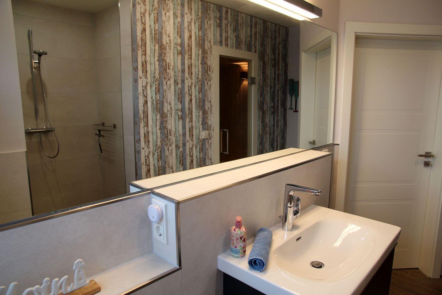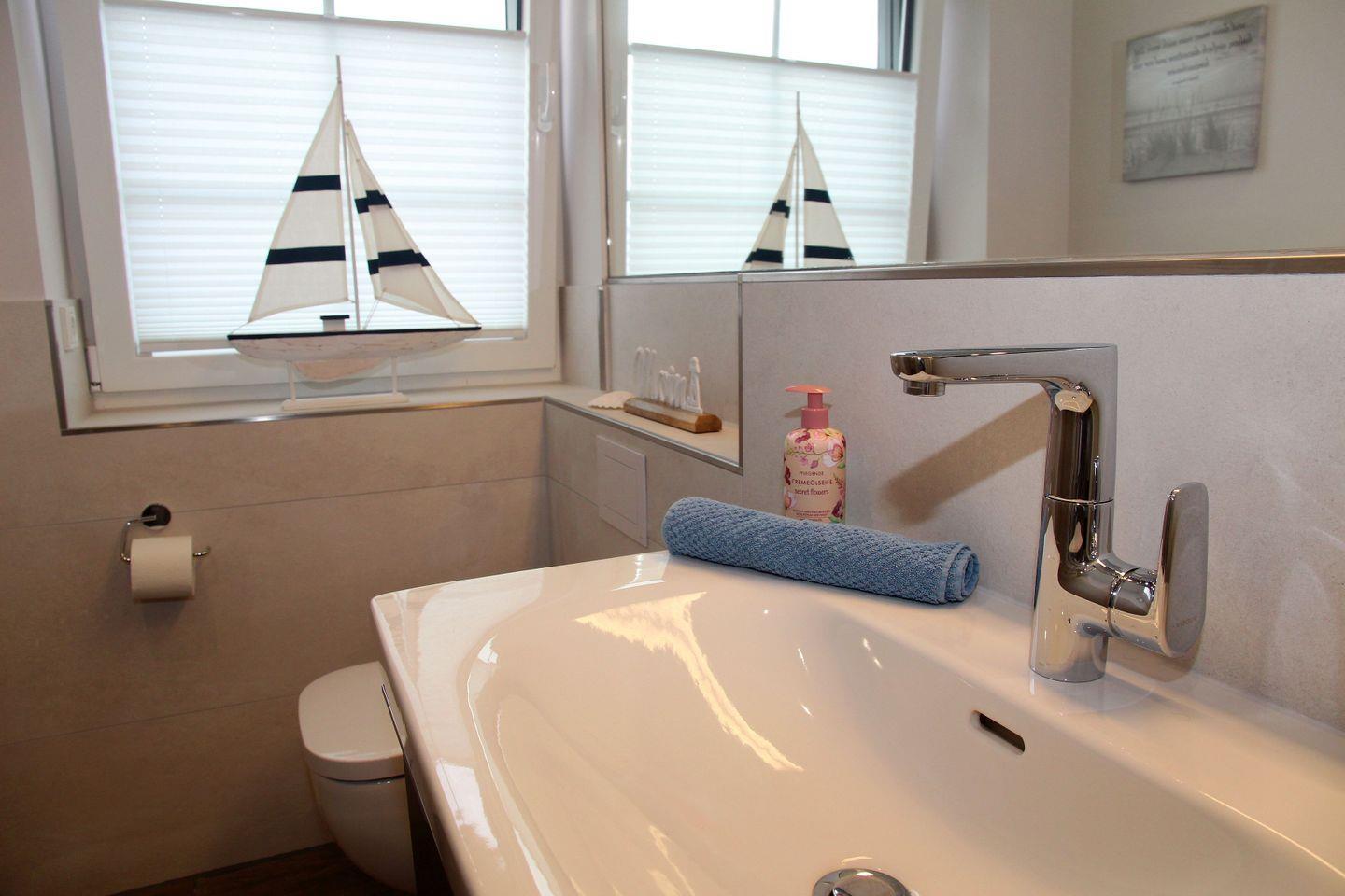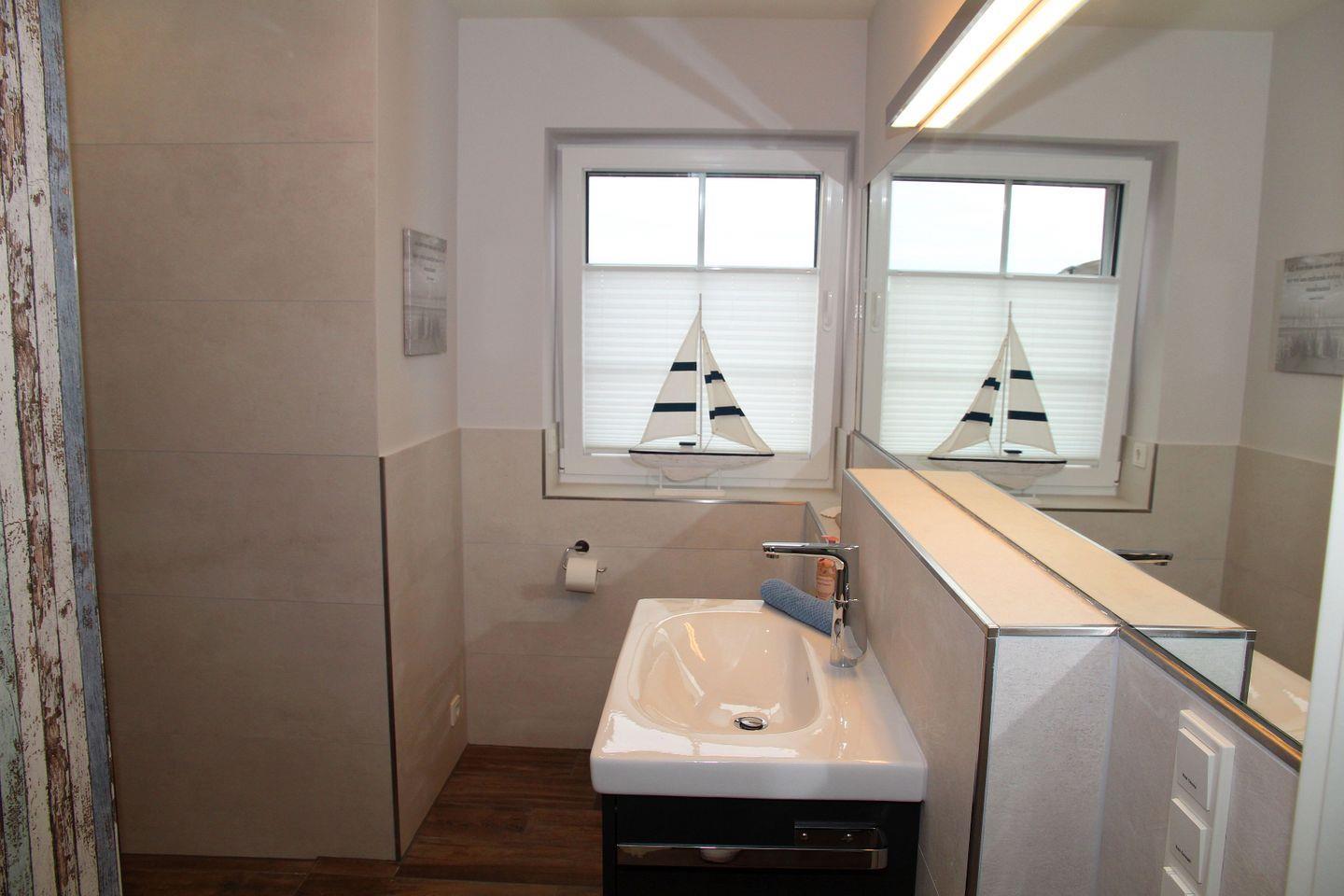 Im Obergeschoss befinden sich die beiden weiteren Schlafräume, die jeweils über 1,80 m Boxspring-Doppelbetten (einzelne Matratzen), Einbauschränke und Smart-TV verfügen. Ein weiteres helles Bad mit Dachflächenfenster, ebenerdiger Dusche, Waschtisch, WC und Fön steht hier zur Verfügung. Waschtrockner, Wäscheständer, Bügelbrett und Bügeleisen sowie Staubsauger und weitere Reinigungsutensilien, finden Sie bei Bedarf im Heizungsraum.