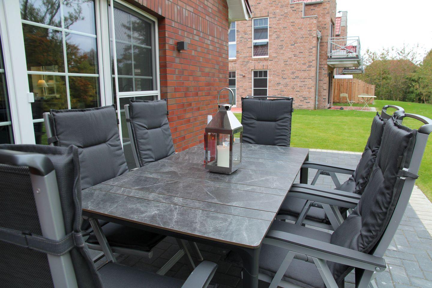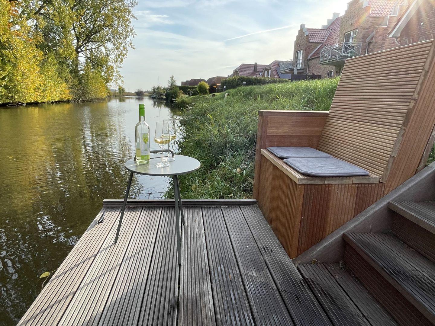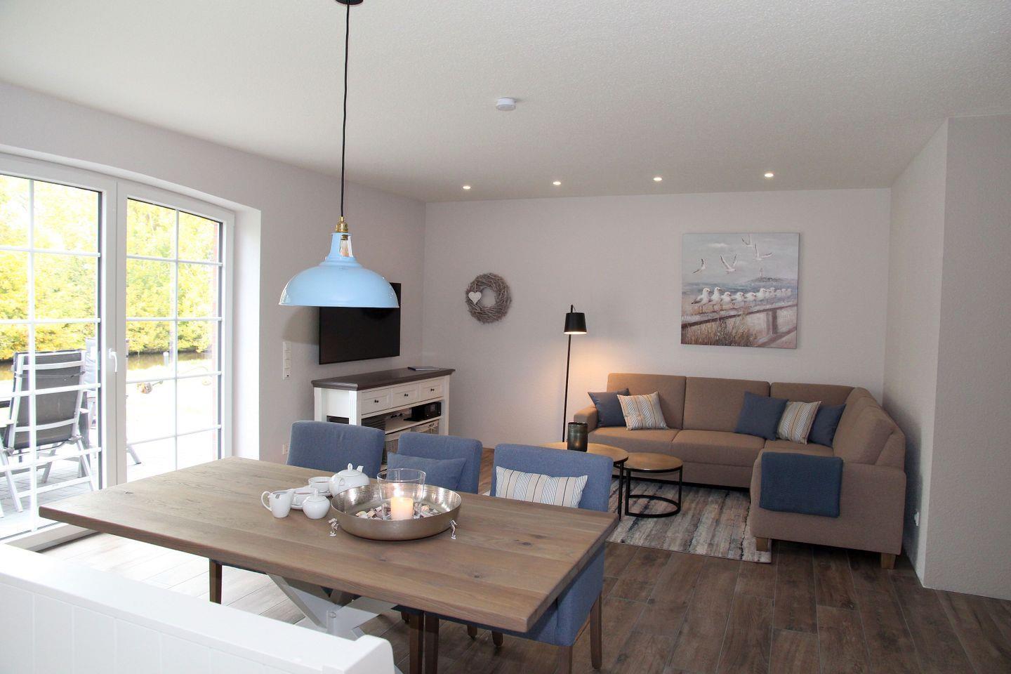 Angrenzend befindet sich der großzügige, stilvoll eingerichtete Wohn- und Essbereich. Auf der mit gemütlichen Kissen ausgestatteten Sitzbank sowie den komfortabel gepolsterten Esszimmerstühlen kann man nach gemeinsamem Mahl auch zum „Klönen“ oder lustigen Spieleabend länger verweilen. In der Sitzecke, ausgestattet mit großem Smart-TV und separater digitaler Musikanlage, können Sie auf dem großzügigen Ecksofa entspannte Abende verbringen. Da das Grundstück unmittelbar an das Sieltief grenzt, haben Sie vom gesamten Wohn-/Essbereich einen traumhaften Blick ins Grüne und auf’s Wasser – Entspannung pur! Von hier aus gelangen Sie auf die große, vollständig möblierte Terrasse. Auf der mit weiteren Sitzplätzen ausgestatteten, hauseigenen Steganlage, können Sie abends bei einem leckeren Glas Wein den Sonnenuntergang genießen. Ebenfalls im Erdgeschoss finden Sie das erste Schlafzimmer mit 1,60 m Boxspring-Doppelbett (einzelne Matratzen) und Kleiderschrank, sowie das große Badezimmer mit integrierter Infrarotkabine, ebenerdigem offenen Duschbereich, WC, Fön und Waschtisch.
