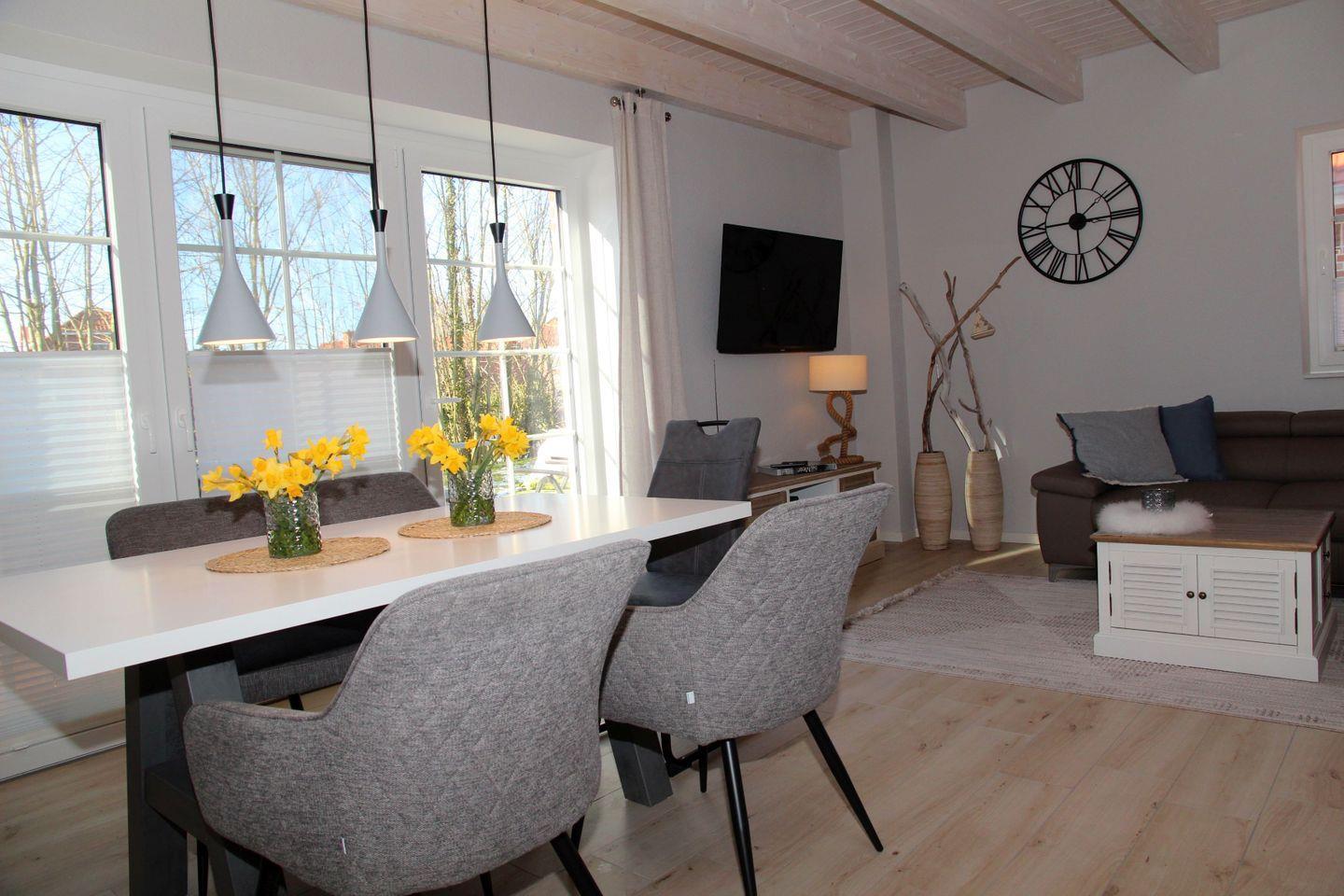 Schon beim Betreten der Unterkunft werden Sie von der hellen, freundlichen Atmosphäre begeistert sein. Die offene Küche, die nahtlos in das geräumige Wohnzimmer übergeht, ist perfekt ausgestattet und lässt keine Wünsche offen. Kochen Sie mit Ihren Liebsten in der modernen Küche mit hochwertigen Geräten wie Herd, Backofen, Kühlschrank mit Gefrierfach, Geschirrspüler, Wasserkocher, Toaster, Eierkocher, Kaffeemaschine und einer praktischen Espressomaschine (Dolce Gusto). Der Essbereich mit Platz für 6 Personen lädt zu geselligen Dinnerabenden ein, während die Sofaecke mit schönem L-Sofa und Kaminofen im Wohnzimmer zum Entspannen und Verweilen einlädt. Genießen Sie gemeinsame Abende bei einem Filmabend auf dem Fernseher oder stöbern Sie in den bereitgestellten Büchern.