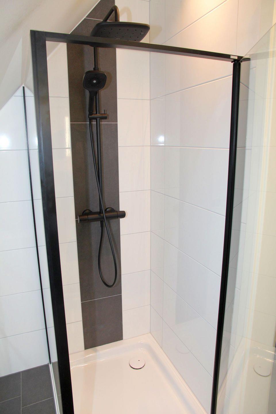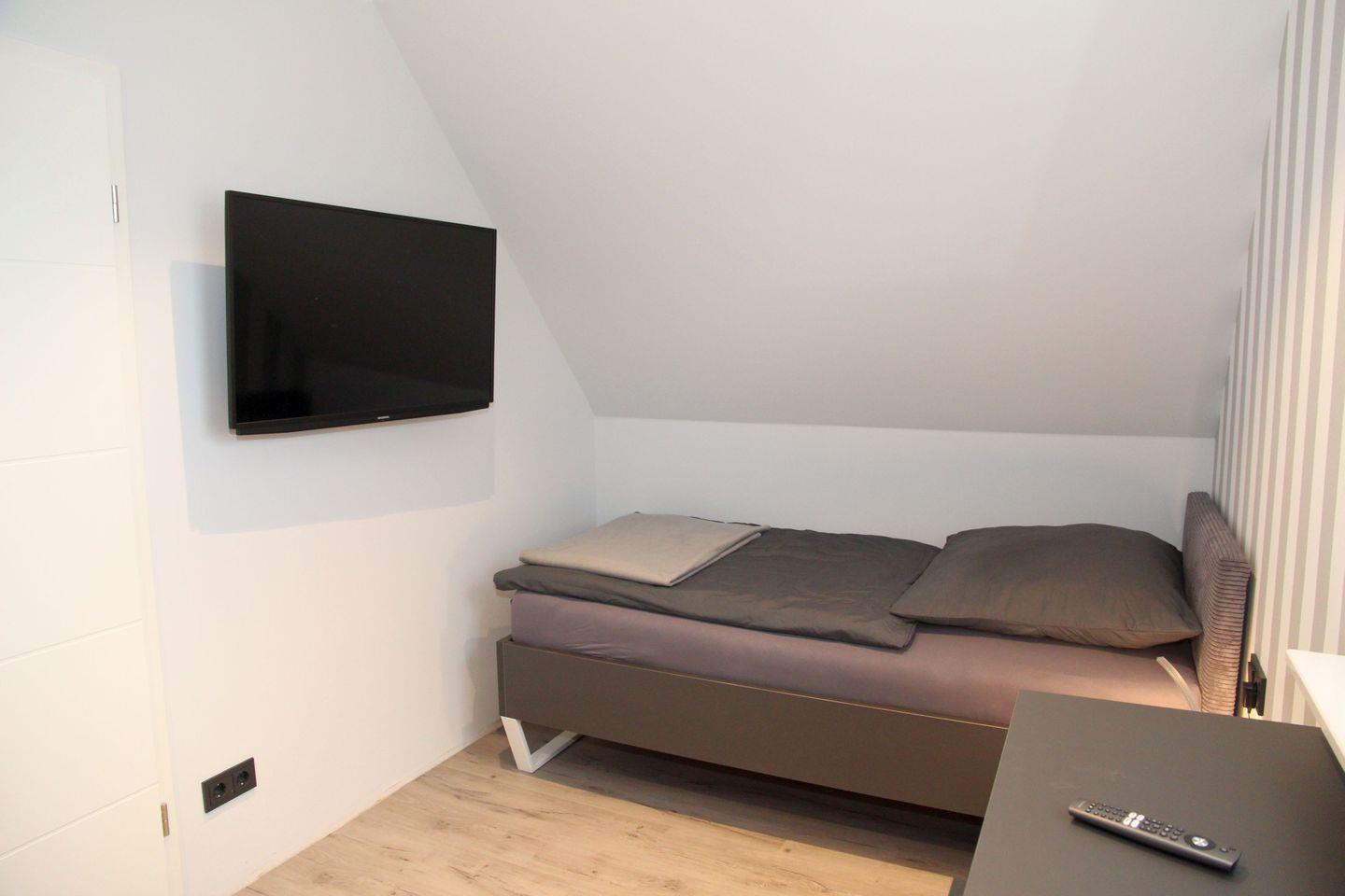 Im Obergeschoss befinden sich die beiden Schlafräume und ein weiteres Bad mit Dusche und WC. Das erste Schlafzimmer hat ein Doppelbett 180x200 cm (einzelne Matratzen) mit Schrank und TV. Das zweite Schlafzimmer hat 2 Einzelbetten 90x200 cm mit Schrank und TV.