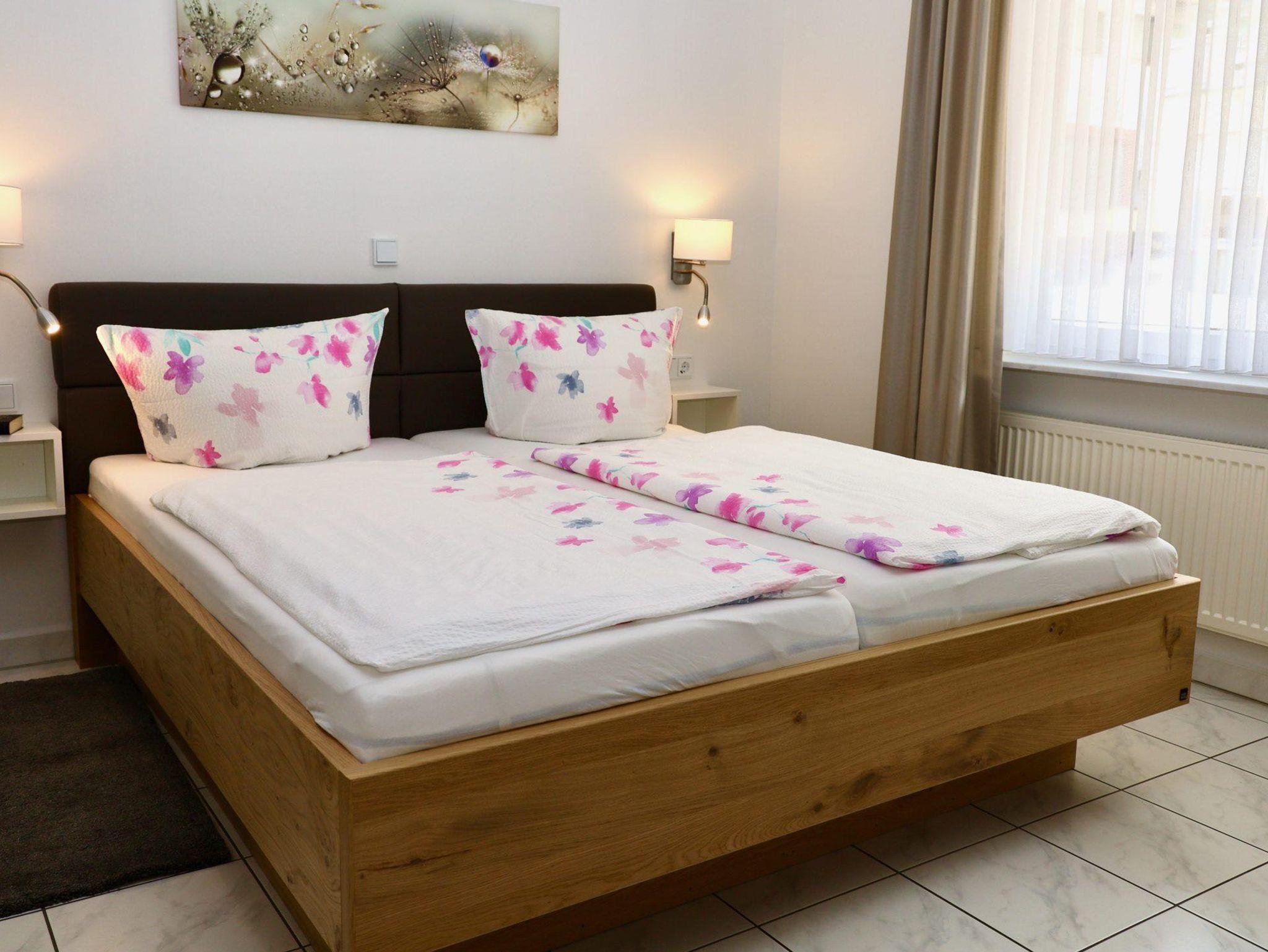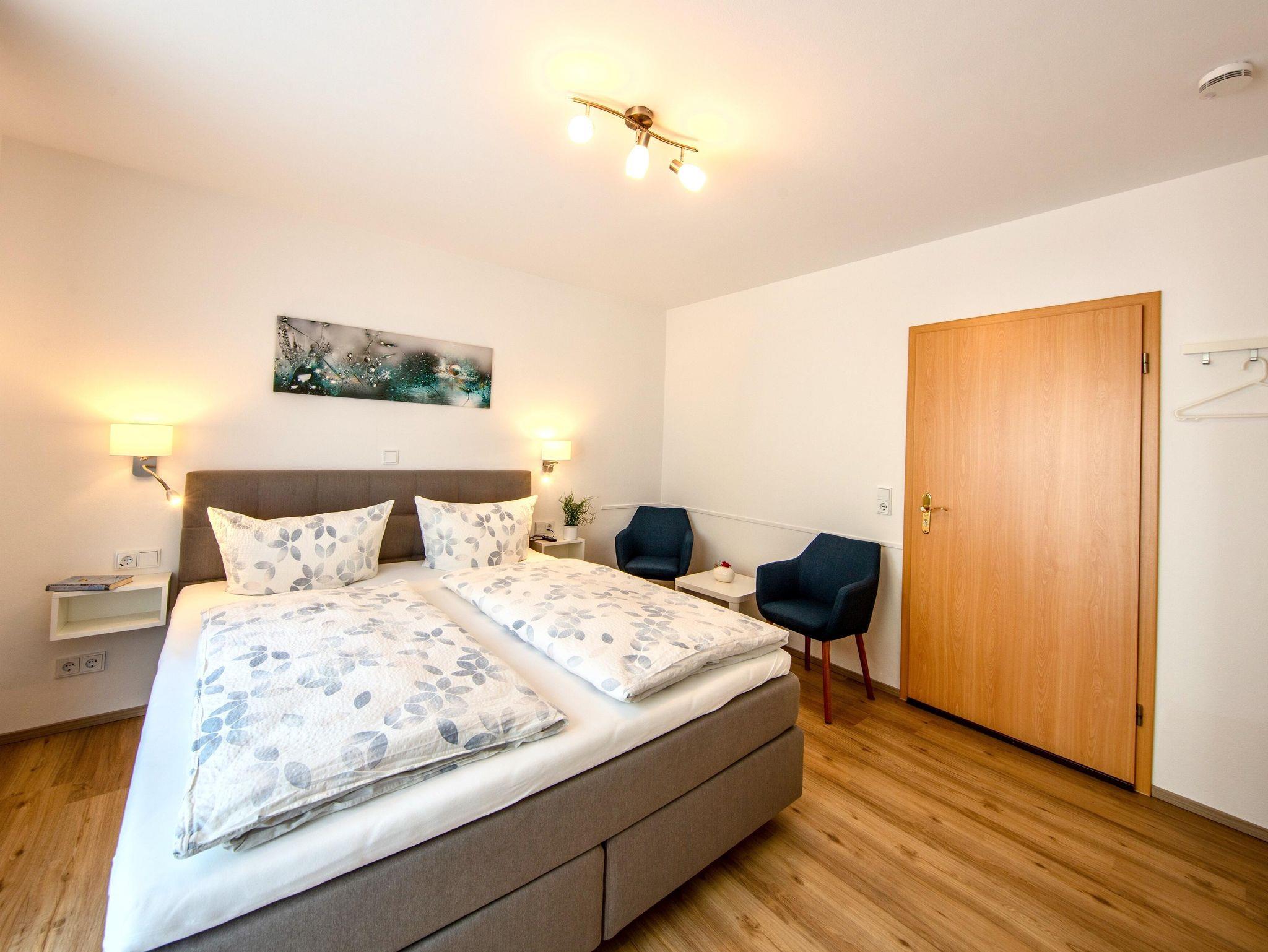 Unsere geschmackvoll in gehobenem Ambiente eingerichtete Ferienwohnung mit Balkon verfügt über eine schöne Wohnküche, Wohnzimmer, 1 Doppel-Schlafzimmer, Bad mit Dusche/WC,Fön, 50 qm, Telefon, SAT-TV, kostenneutrale WLAN-Nutzung. Bettwäsche und Handtücher sind vorhanden, Brötchenservice, Weinprobe.