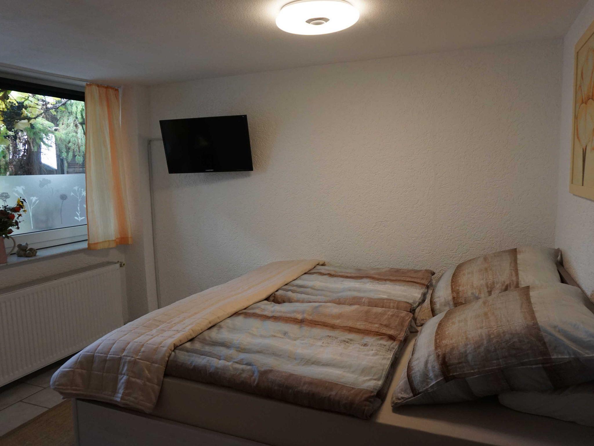 1 Schlafzimmer 1.OG mit Doppelbett, TV und Sitzgelegenheit