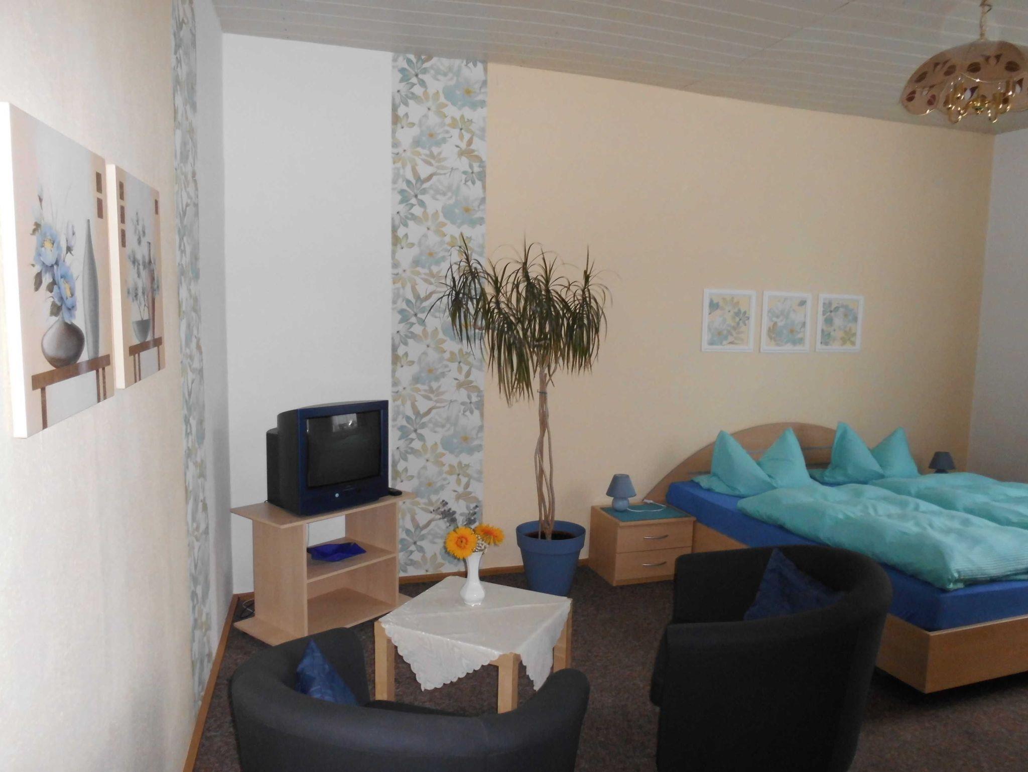 Das Doppelzimmer befindet sich im Erdgeschoss und ist 22 qm groß. Das Zimmer mit Doppelbett verfügt über 2 Sessel mit Tisch und TV, Bad auf der Etage mit WC, Waschbecken und Dusche