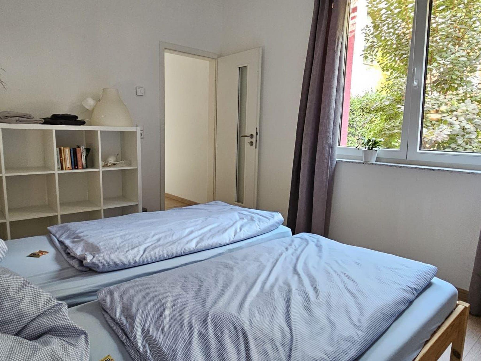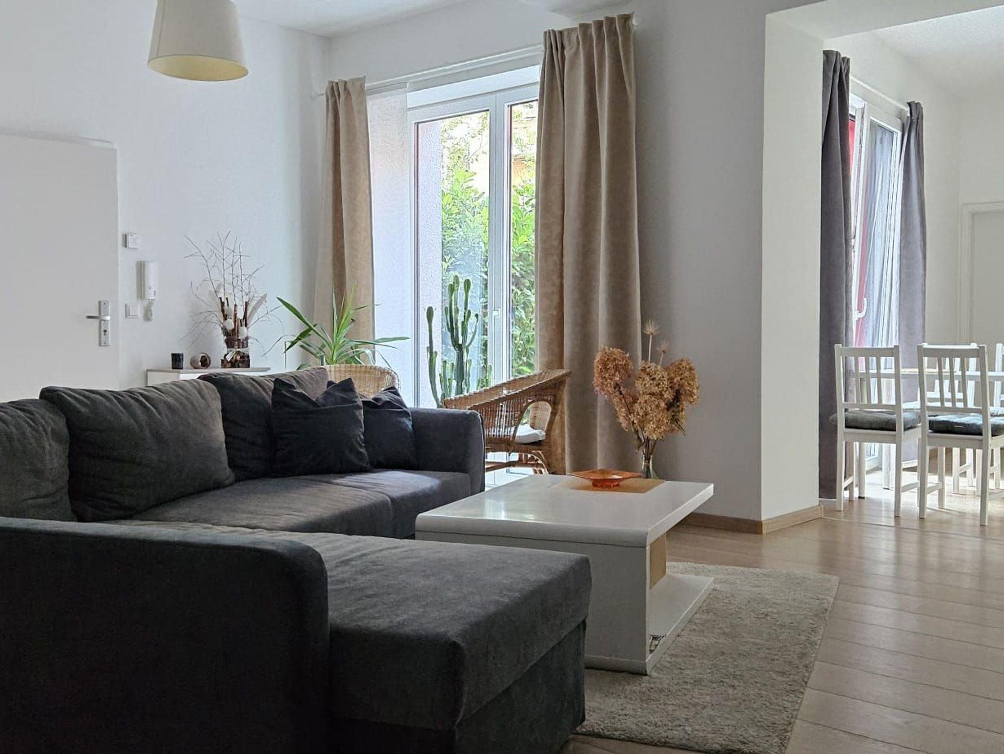 Die Ferienwohnung links im Erdgeschoss bietet auf 90 m² Wohnfläche einen hellen und großzügig eingerichteten Wohn- und Essbereich mit einer modernen Einbauküche, zwei Schlafzimmern, Badezimmer sowie eine Terrasse im grünen Innenhof und bietet somit Platz für 2 bis 4 Personen.